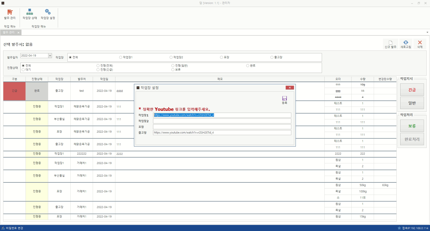 - 산업현장에서 거래처에서 들어오는 발주내용을 현장에 무선으로 전송하는 솔루션- 작업장마다 개별 또는 단체로 지시를 내릴수 있는 솔루션- 원하는 레이아웃과 디자인으로 구현 가능- 추가적인 기능 구현가능 (계산기능, 엑셀연동기능, 인쇄기능 등등)(별도문의)- 현장에서 작업이 완료된 경우, 작업완료 처리로 사무실에서도 확인가능- 실시간으로 현장과 데이터를 주고 받을 수 있음 - 정확한 원하시는 기능에 따라 비용이 변경될수도 있기 때문에- 상담문의전화 주시면 1차로 상담을 도와드립니다.- 원하시는 디자인과 레이아웃, 기능에 맞춰서 견적을 드립니다.- 가격이 맞으시면, 현장답사를 통해서 계약진행과 더불어 추가적인 미팅을 도와드립니다.- 프로그램 진행후, 50%정도 됬을때, 이미지 파일로 중간보고를 해드립니다.- 프로그램 진행후, 80%정도 됬을때, 이미지와 중간테스트를 보여드립니다.- 80%때 이상이 없으시면, 그대로 마무리를 해드리고, 이상이 있으면 수정을 해드립니다.- 100% 끝나시고, 설치후에 테스트까지 도와드립니다. - 서버를 구축할 컴퓨터 1대- 현장에서 작업하시는 분들이 보실 TV와 TV설치(부득이한 경우, 저희측에다가 구매와 설치까지 요청하셔도 됩니다)- 사무실과 현장에서 사용할 인터넷 (무선와이파이)-원하시는 레이아웃과 디자인이 있으시거나, 기획서가 있으시면 좋습니다.