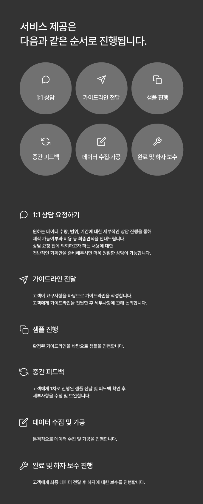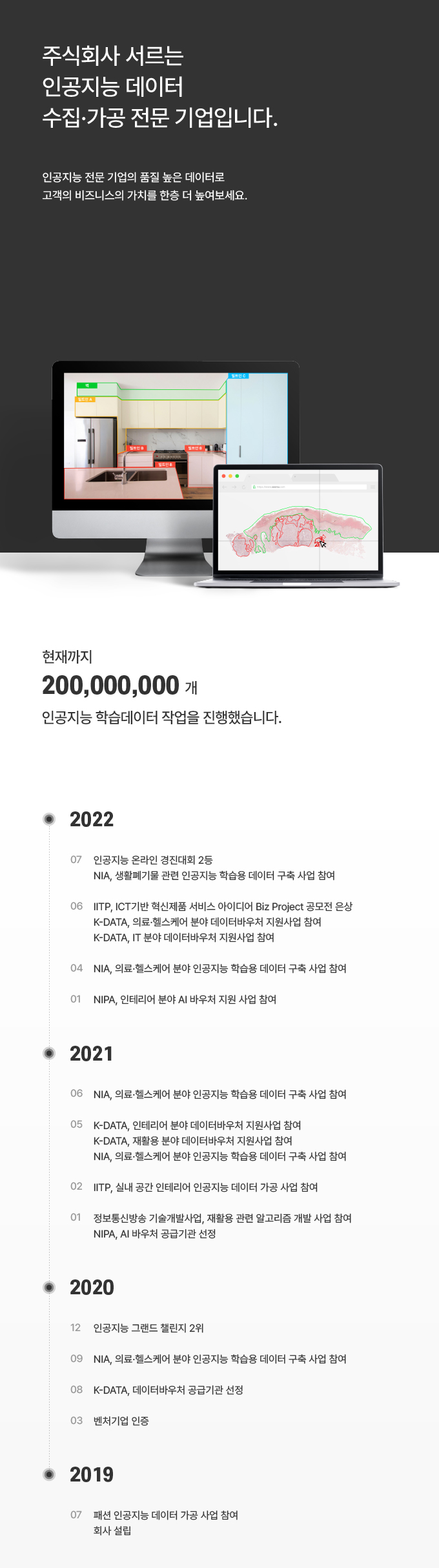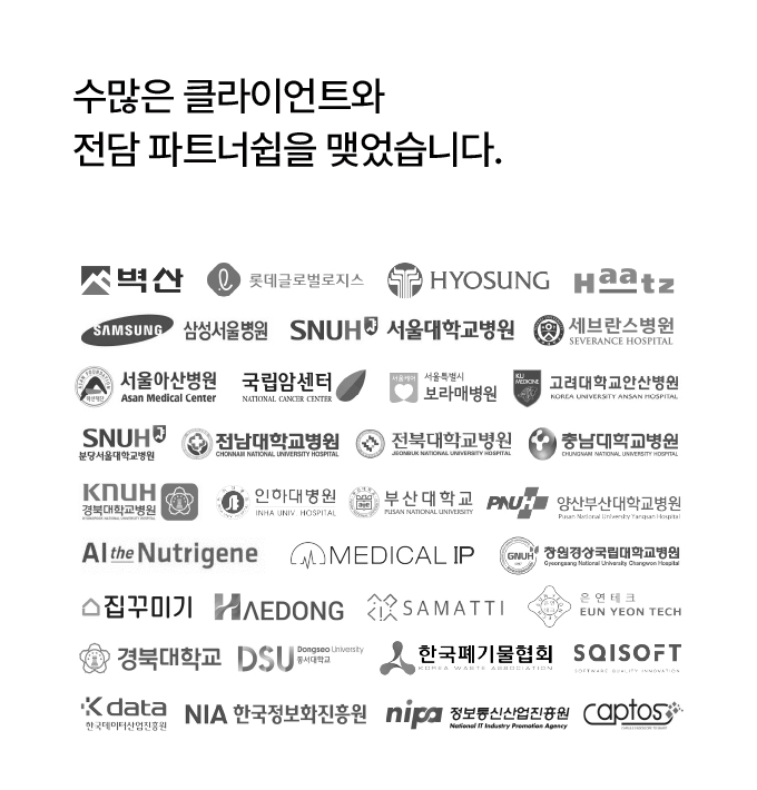We make value, not just dataset안녕하세요주식회사 서르입니다.서르는 고객과 인공지능 사이의 허들을 낮추는 기업입니다.인공지능 데이터 수집과 가공, 알고리즘 개발까지 고객이 원하는 서비스를 제공해드립니다.*데이터 가공 금액이 부담스러우신가요?서르는 한국데이터산업진흥원에서 지정한 데이터 바우처 공급기관 입니다.데이터바우처 사업을 통해 최대 7,000만원까지 국가에서 사업비를 지원받으실 수 있습니다.해당 사업에 지원하고 싶거나 궁금한 점이 있으신 분은 서르에게 문의 주세요.*데이터 품질이 걱정되시나요?서르는 각 산업분야별로 전문가를 고용하여 고객의 비즈니스 모델이 맞는 가공 방식을 도출합니다.각 전문가의 조언을 통해 교차검사, 전수검사를 진행하여 일관성있는 데이터 품질을 보장합니다.#수상내역인공지능 온라인 경진대회(이미지 분야) 2등 (2022-07)IITP, ICT기반 혁신제품·서비스 아이디어 Biz Project 공모전 은상(2022-06)2020 인공지능 그랜드 챌린지(사물인지 트랙) 2위 (2020-12) #포트폴리오NIA, 생활폐기물 관련 인공지능 학습용 데이터 구축 사업 참여(2022-07)K-DATA, 의료/헬스케어 분야 데이터바우처 지원사업 참여(2022-06)K-DATA, IT 분야 데이터바우처 지원사업 참여(2022-06)NIA, 의료/헬스케어 분야 인공지능 학습용 데이터 구축 사업 참여(2022-04)NIPA, 인테리어 분야 AI 바우처 지원 사업 참여(2022-01)NIA, 의료/헬스케어 분야 인공지능 학습용 데이터 구축 사업 참여(2021-06)K-DATA, 인테리어 분야 데이터바우처 지원사업 참여(2021-05)K-DATA, 재활용 분야 데이터바우처 지원사업 참여(2021-05)NIA, 의료/헬스케어 분야 인공지능 학습용 데이터 구축 사업 참여(2021-05)IITP, 실내 공간 인테리어 인공지능 데이터 가공 사업 참여(2021-02)정보통신방송 기술개발사업, 재활용 관련 알고리즘 개발 사업 참여 (2021-01)NIA 의료/헬스케어 분야 인공지능 학습용 데이터 구축 사업 참여 (2020-09)패션 인공지능 데이터 가공 사업 참여 (2019-07)*구매하시기 전에 꼭 문의주세요. 1.[문의 남기기]를 통해 원하는 데이터 수량, 범위, 기간 등을 문의합니다 2.상담을 통해 견적 조율 후 크몽을 통해 결제합니다.3.고객의 요구사항을 바탕으로 가이드라인을 작성니다.4.Sample을 진행하여 세부사항을 수정 및 보완합니다.5.데이터 수집을 진행합니다.6.고객에게 데이터 전달 후 하자에 대한 보수를 진행합니다. 1. 의뢰하고자 하는 내용에 대한 전반적인 기획안(목적, 활용, 기간) 등을 준비해 주세요