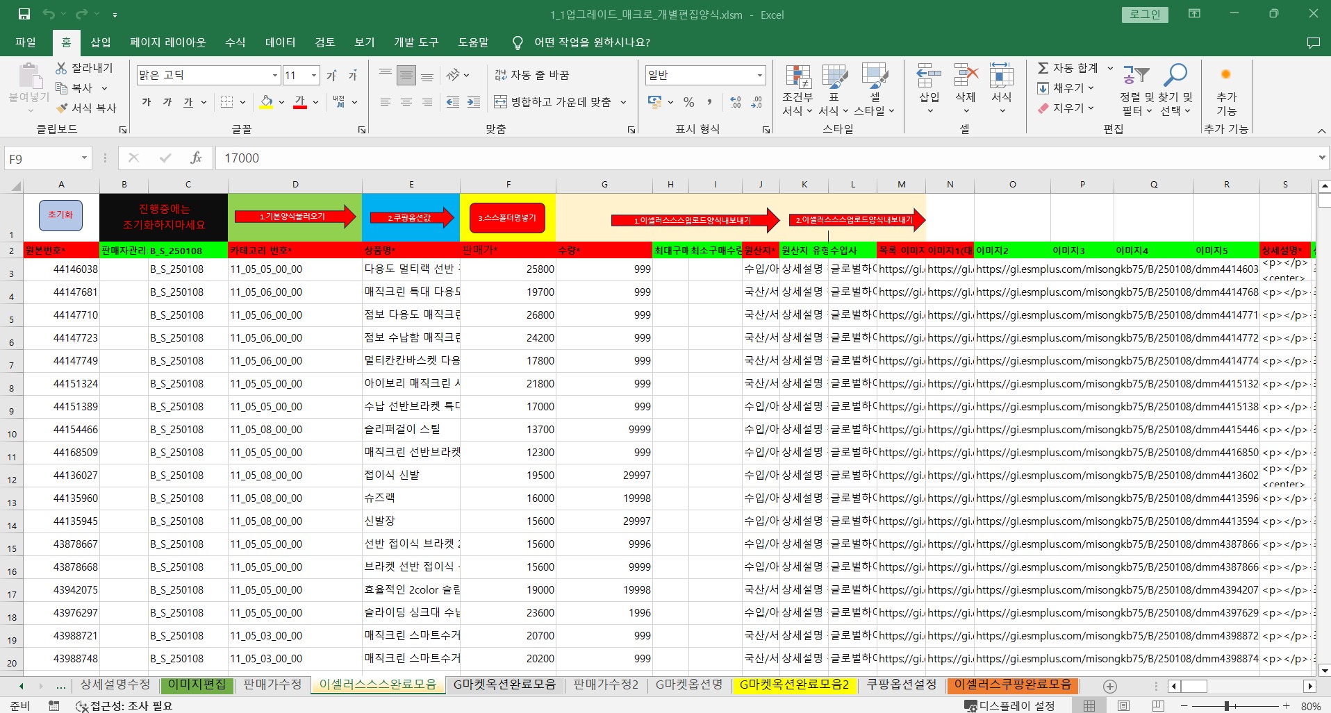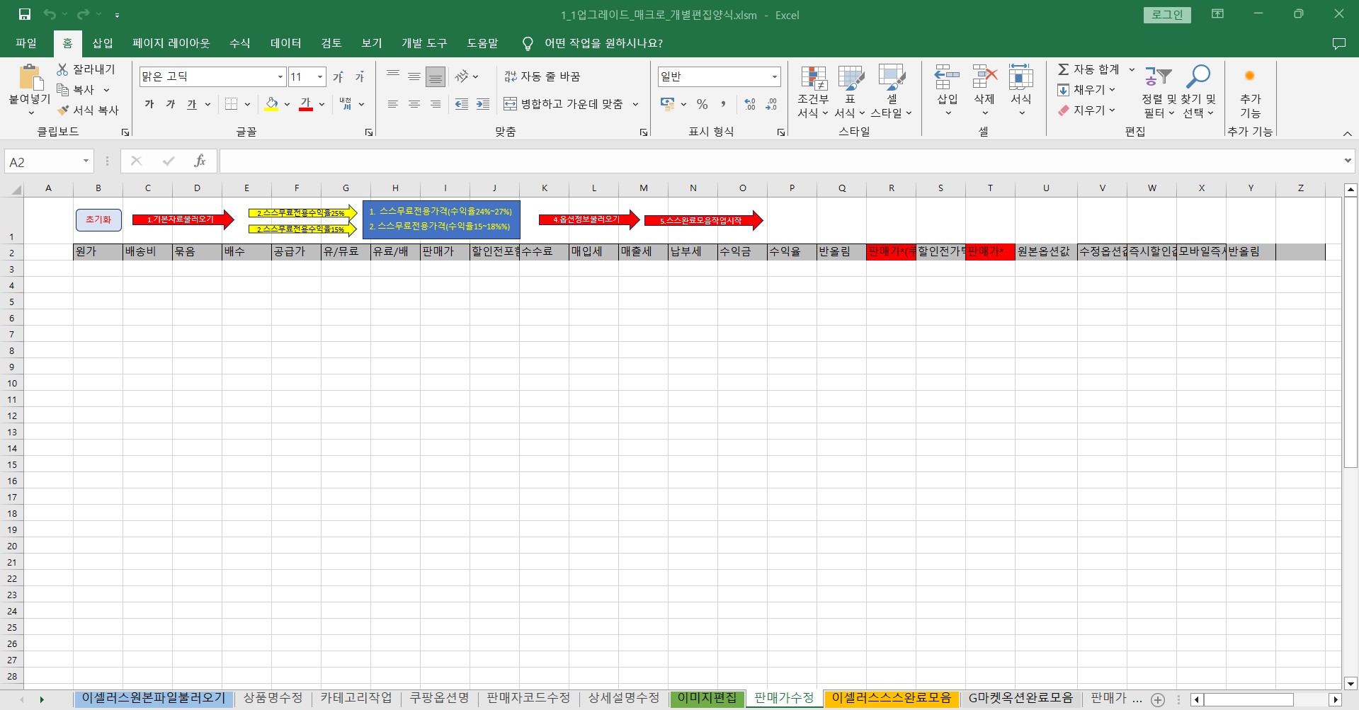 1. 저작권 귀속 여부 (전문가 귀속 ) 2.고객의 상업적 이용 가능여부 ( 상업적 이용 불가능) 3. 폰트 사용 정보 (무료 폰트 이용)[25.1~ 현재 진행중인 이벤트]리뷰 작성해주시는 분들께 아래 자료를 증정해드립니다!!리뷰 작성후 이메일 주소를 전달해주세요.1) 카테고리 가공 (반자동 설정-현재 기준 11개 업체)2) 상품명 가공 - 불필요한 중복 제거 글자 수 자동 수정- 엑셀 자동화 프로그램1. 도매매 엑셀 대량등록용 파일다운 후 엑셀 자동가공 : 엑셀대량자동편집프로그래밍ver.12. 상품명가공, 옵션명가공, 판매자코드가공, 상세설명가공, 이미지가공, 판매가가공 - 이 모든 것이 100개 상품 기준 5분만에 끝납니다. 본인 직접 위 작업을 수동 편집 했을때 아이템 위너 비율과 비슷한 결과가 나옵니다. - 마켓별 아이템위너 100% 보장은 아닙니다.3. 제가 직접 쓰려고 만든 것인 만큼 엄청난 속도로 가공 가능함을 약속드립니다. 한번에 가공가능한 상품 수는 최대 제한 없으나, 많은 상품가공시 컴퓨터 성능 또는 개인별 옵션 취향 수정 이미지 다운로드 등으로 인해 시간이 길게 걸릴 수 있습니다. 한번 150개 가공 하는 것을 추천드립니다. -카테고리는 직접 등록해야합니다. (리뷰이벤트 제공하는 카테고리가공 프로그램 사용방법은 반자동이며, 개인별 가공시간은 상이할 수 있습니다. 카테고리가공 프로그램 이용 방법은 따로 설명드립니다.)※ 엑셀대량자동매크로프로그래밍 (구매상품별 구성품을 반드시 잘 확인하세요)※ VBA코드 제공X, 필요시 상담 후 결제 진행※ 파이썬 관련 기능X※ 본 서비스는 판매자가 제작한 자료·템플릿으로 자료의 일부 혹은 전체 내용을 무단으로 복제/배포하거나 2차적 저작물로 재편집하는 경우, 5년 이하의 징역 또는 5천만원 이하의 벌금과 민사상 손해배상이 청구될 수 있습니다.※ 크몽에서는 판매자가 직접 제작한 자료·템플릿만을 등록하도록 하고 있습니다.※ 다만, 전문가의 귀책사유로 자료 이슈 또는 표절에 대한 의혹 발생·확인 되는 경우, 판매는 중단됩니다. ※ 주문하시면 고객님 정보에 맞춰 다음과 같은 기본재설정이 필요합니다. -상호변경, 이미지 URL변경, 판매자코드가공※ 오류 수정은 최대 5회입니다.(기본재설정 미포함)※ 사용설명은 동영상으로 제공이 되며 원격조정이나, 1:1 화상 방법등으로 제공되지 않습니다. ※ 본 제품은 엑셀매크로프로그래밍파일 이므로 주문 상품 다운로드 이후에는 취소 환불이 불가능함을 알려드립니다. ※ 판매가 기본설정은 [판매가-(원가+배송비)-(마켓수수료)-(공급세액-매입세액)=수익율 15%, 또는 25% 둘중 하나 엑셀매크로프로그램에서 선택해서 사용가능합니다.]+[할인전판매가자동계산됩니다 약40%] ※ 판매가 기본설정은 스스판매가, 쿠팡판매가 두가지 시트로 나누어져 있으며, 두가지 판매가로 따로 계산해서 사용가능합니다. [쿠팡할인가확장정보제공]※ 옵션설정편집은 - 쿠팡기준 옵션설정편집 (쿠팡,스스,11번가,롯데ON등 업로드 문제없이 사용가능합니다) - 옥션,G마켓 기준 옵션설정편집 두가지 시트 제공됩니다.※ 위 프로그램의 기본 DB는 도매매엑셀다운로드 이셀러스용 자료를 기초로 설계하였습니다.※ 솔루션업체로는 이셀러스 업로드 양식 기준을 기초로 설계하였습니다.※ 타솔루션업체를 원하시면 변경은 가능하나 시간이 더 소요됨을 안내 드립니다. (추가상담요함-추가요금발생가능)
