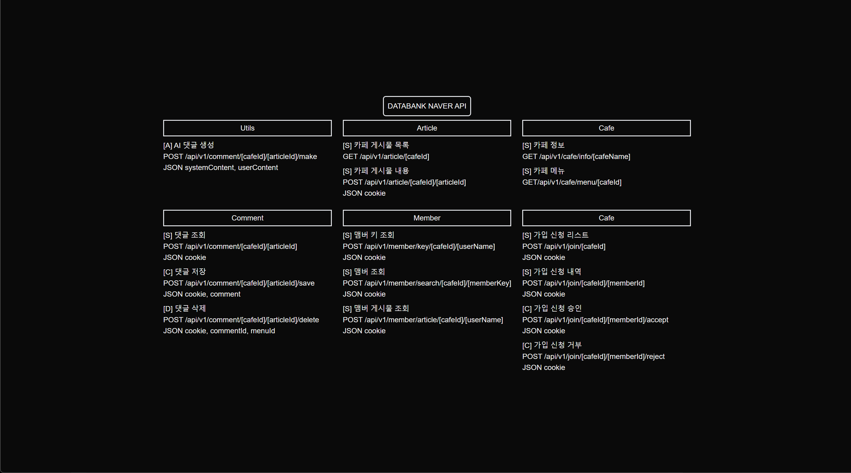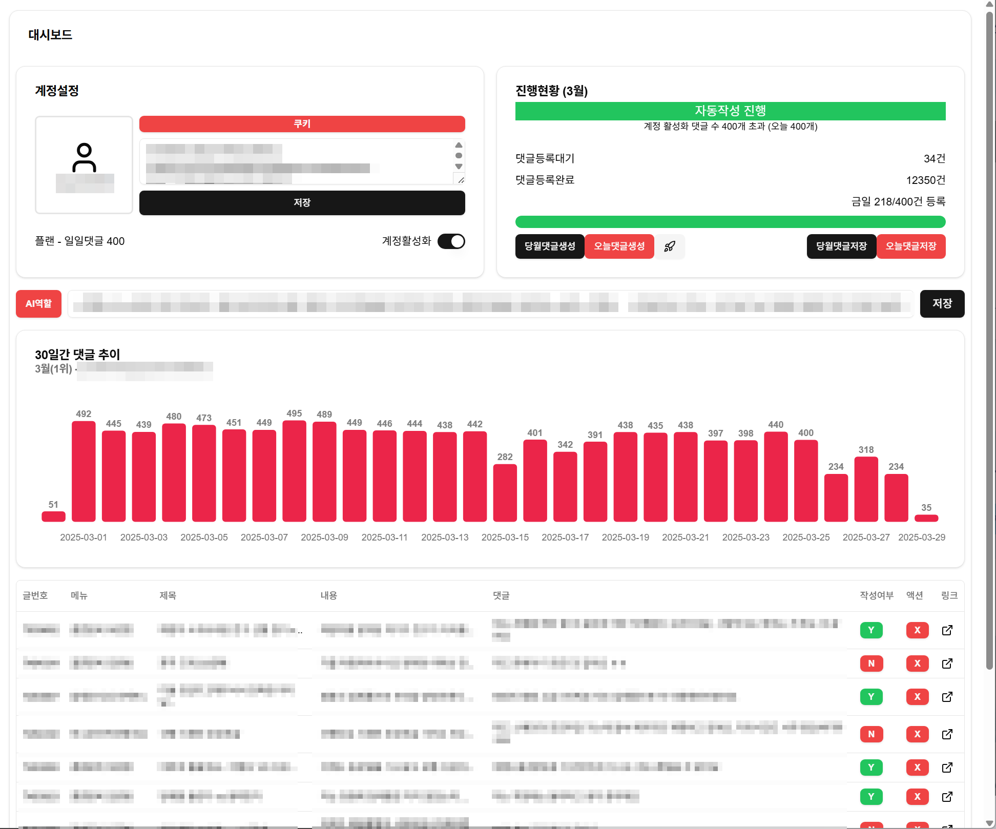 웹 서비스 기반으로 카페의 데이터를 수집하여 마케팅 등에 활용할 수 있습니다.무료 서비스를 체험하며 자신에게 필요한 기능을 개발/적용하여 제공됩니다.상시 접속 가능한 나만의 데이터 수집 서버를 마련해보세요.1. 카페를 제어할 수 있는 API 프로그램을 제공합니다.- AI 소통 생성- 특정 게시물 소통 내역 조회- 특정 게시물에 소통- 특정 게시물에 소통 삭제- 카페 게시물 목록 조회- 카페 게시물 내용 조회- 카페 맴버 조회- 카페 맴버 게시물 조회- 카페 정보 확인- 카페 메뉴 확인- 가입 신청 리스트 확인- 가입 신청 내역 확인- 가입 신청 승인- 가입 신청 거부2. 카페의 소통 및 게시글을 수집을 하는 플랫폼 서버를 제공합니다.- 특정 카페의 게시글 수집- 특정 카페 게시글의 소통 수집- 특정 카페 게시글에 AI 소통- 특정 카페의 소통 작성 현황 확인- 특정 카페의 소통 활동 현황 확인 1. 상담 후 서비스를 무료로 일주일 동안 체험합니다.2. 서비스에서 필요한 기능 등 피드백을 수집합니다.3. 피드백 기능 개발에 앞서 착수를 위한 계약금 결제를 진행합니다.4. 피드백이 적용된 서비스를 확인 후 잔금 납부를 진행합니다.5. 준비된 PC 또는 서버에 납품을 합니다. 수집하고자 하는 카페 및 용도를 전달합니다.서비스를 체험하면서 본인에게 필요한 기능을 파악합니다.