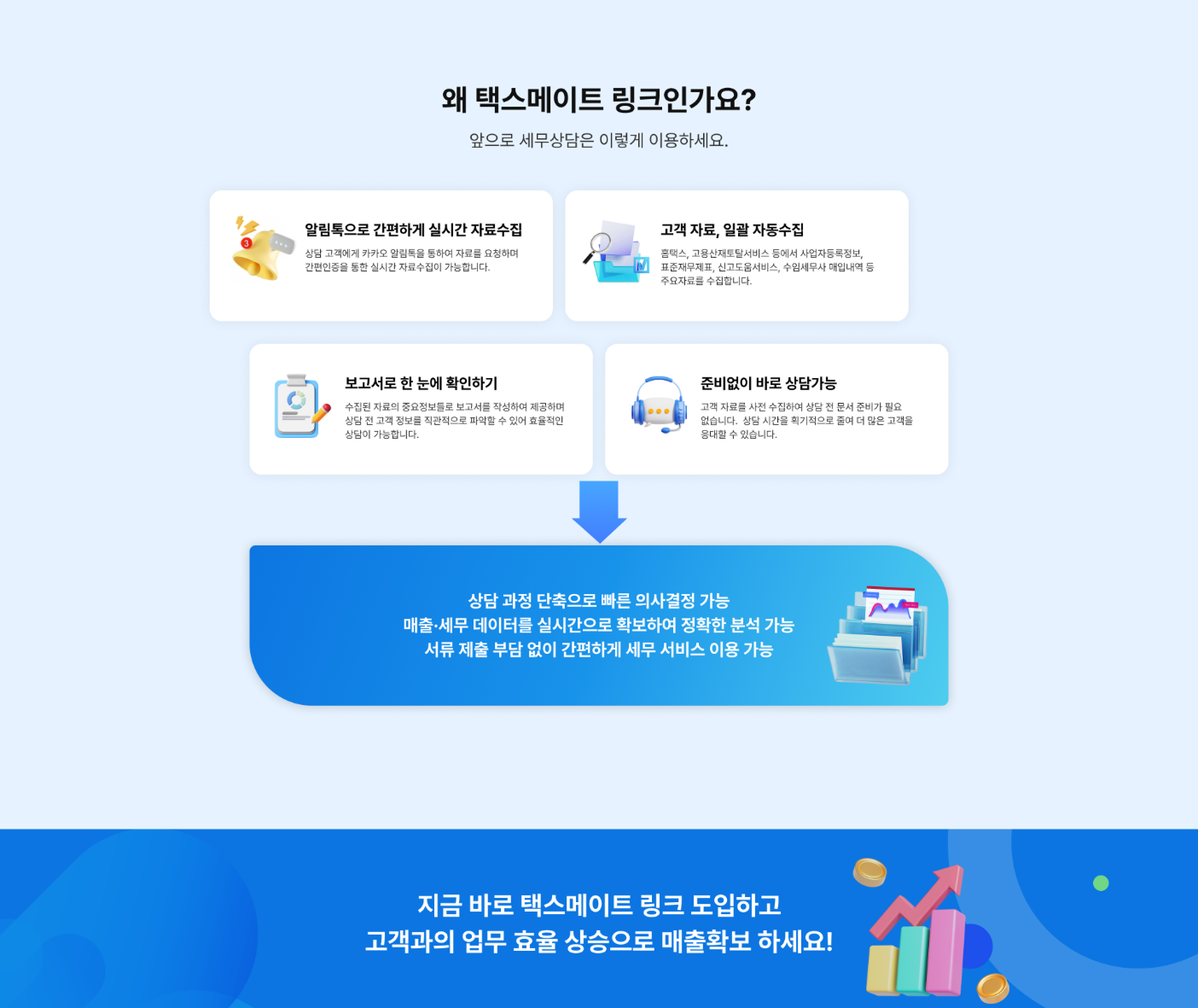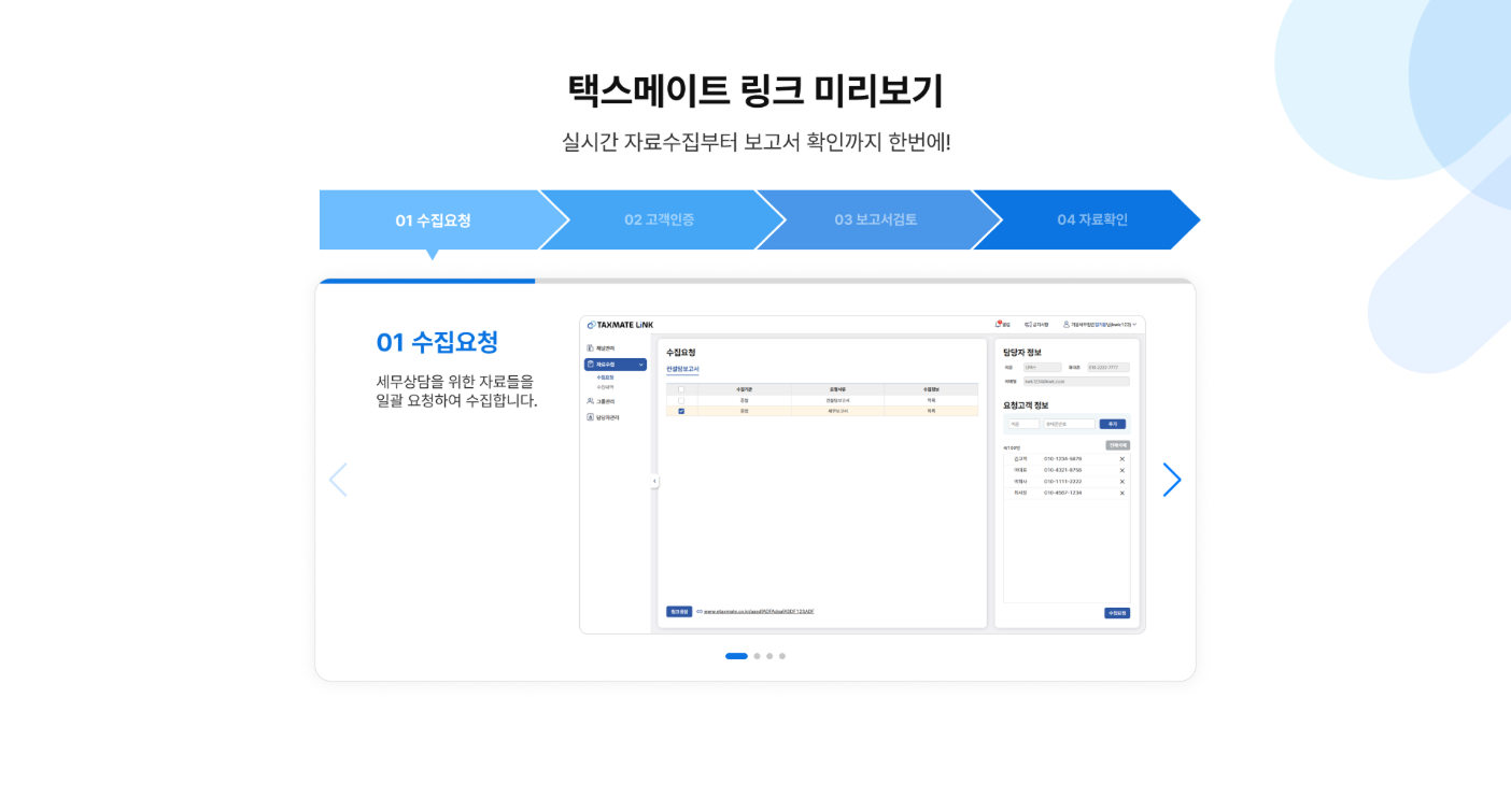 [택스메이트 링크] 상담 업무 지원 서비스! 택스메이트 링크는?기존 택스메이트(경정청구 솔루션)를 통한 경험과 노하우를 바탕으로고객 상담 업무 시 고객에게 필요한 자료를 요청하고 받는 과정을 간소화하여 업무의 생산성과 효율성을 높이기 위한 서비스입니다.! 서비스 장점- 자료수집 대상으로 부터 요청 및 취합까지의 시간과 비용-> 실시간 자료 수집 & 고객 자료 취합 무제한- IT전문 인력 부족 등 스크래핑 및 서버운용의 어려움-> 클라우드 서비스 & 보기쉬운 간편UI! 아래와 같은 고민을 가진분들께 필요합니다.- 고객에게 기관별(홈택스, 고용산재, 정부24 등) 자료를 자주 요청하시는분- 대면상담이 아닌 유선/채팅 상담 과정 중 고객 정보 실시간 확인이 필요하신 분! 이용가격(부가세 별도)- 월 3만원~ [6월 무상제공중 / 6월가입자_7월까지 무상제공)[수집자료 목록]표준재무제표증명원종소세/법인세 신고안내문나의 세무대리인 조회매입세금계산서 내역원천세체납세액세금신고내역근로자고용정보현황 등+ 추가 요청자료 반영가능- Demo 요청 시 별도 안내 Sass형 서비스1. 유선문의 후 계정생성 제공2. 이 후 회원가입 체계자체구축형 서비스1. 유선문의 후 이용규모 및 요청사항 정의2. 사이트 구축 후 제공 Sass형 서비스로 아래 정보 외 필요서식 없음1. 로그인 계정정보2. 사업자등록증자체 구축형 희망시 별도협의
