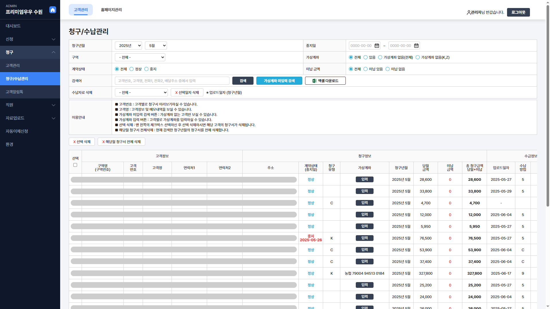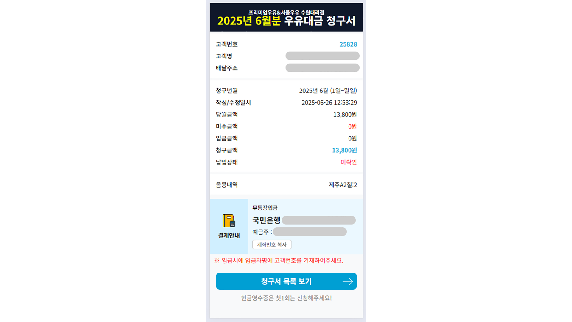 ## 솔루션 안내 ## 안녕하세요. 저희 솔루션은 대리점 고객을 편리하게 관리하기 위한 기능을 제공합니다.가장 대표적으로 모바일 고객 청구서 생성 및 발송, 고객 안내알림톡을 대량 발송하는 기능입니다.엑셀을 통해 청구서를 대량으로 업로드하실 수 있으며 알림톡도 편하게 발송하실 수 있습니다.매월 저렴하게 구독비용으로 이용하세요! ## 솔루션 주요기능 ## - 모바일 청구서/급여명세서 : 월별로 업로드한 고객 청구서 및 직원 급여명세서를 모바일로 보실수 있도록 제공합니다. - 모바일 자동이체신청서 : 모바일로 자동이체를 편하게 신청하실 수 있도록 제공합니다. - 고객 청구자료와 직원 급여자료 업로드기능 : 엑셀로 작성한 자료들을 대량 업로드를 통해 편하게 관리하실 수 있습니다. - 알림톡 예약발송기능 : 원하시는 날짜와 시간에 청구서 및 급여명세서, 배송안내 등의 알림톡 예약발송하실 수 있습니다. 1. 솔루션 구독 문의 및 이용상담2. 결제 진행3. 업체 관련자료 및 알림톡 문구 준비4. 서버/사이트 세팅 및 커스터마이징5. 테스트 진행6. 서비스 개시 - 대리점 사업자정보- 대리점 카카오톡 채널 가입정보- 대리점 기타 청구서 및 직원관리 관련 자료