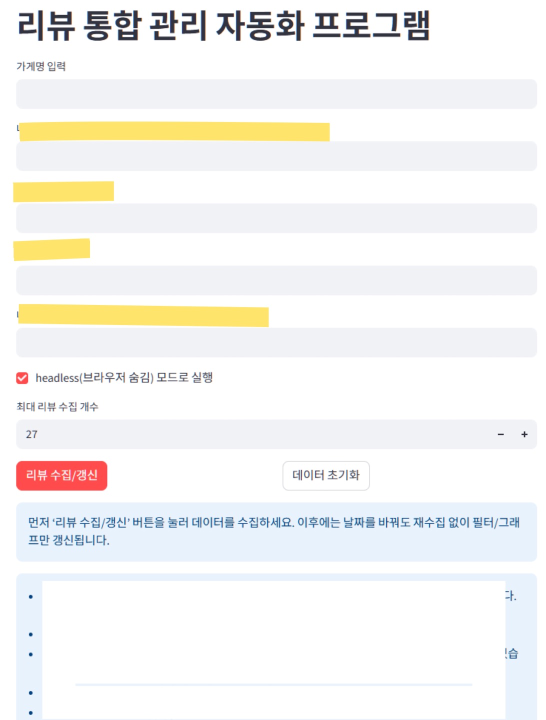 다양한 온라인 리뷰 페이지의 후기를 수집하고, AI를 활용해 긍정/부정/중립으로 분석하는 프로그램입니다. 수집한 리뷰는 월별/주별 통계와 그래프로 시각화되며, 필요한 경우 엑셀 파일로 내려받아 활용할 수 있습니다.프로그램 주요 기능- 최대 200개의 리뷰 자동 수집- AI 감성 분석(긍정/부정/중립)- 월별/주별 건수 및 비율 통계- 기간별 필터링 기능- 분석 결과 엑셀 다운로드활용 사례- 고객 리뷰 모니터링 및 관리- 부정 리뷰 빠른 파악과 대응- 마케팅/서비스 개선 자료 분석 1. 의뢰 접수- 구매 후 채팅으로 운영 환경(OS 등)과 요청 사항 확인2. 프로그램 세팅- 요청하신 조건에 맞게 기본 옵션 및 환경 설정3. 프로그램 제공- 실행 파일 또는 소스코드 전달4. 사용 안내- 프로그램 실행 및 설정 방법 안내(문서 또는 영상 제공)5. 사후 지원-제공 횟수 내에서 오류 수정 및 간단한 기능 보완 - 프로그램 실행 환경 정보 제공 (운영체제, 기본 브라우저 종류 등)- 리뷰 수집 대상 페이지의 URL 목록- 원하는 최대 수집 개수와 기본 옵션(기간, 출력 형식)- 프로그램 전달 및 안내를 위한 이메일 또는 파일 수신 가능 경로