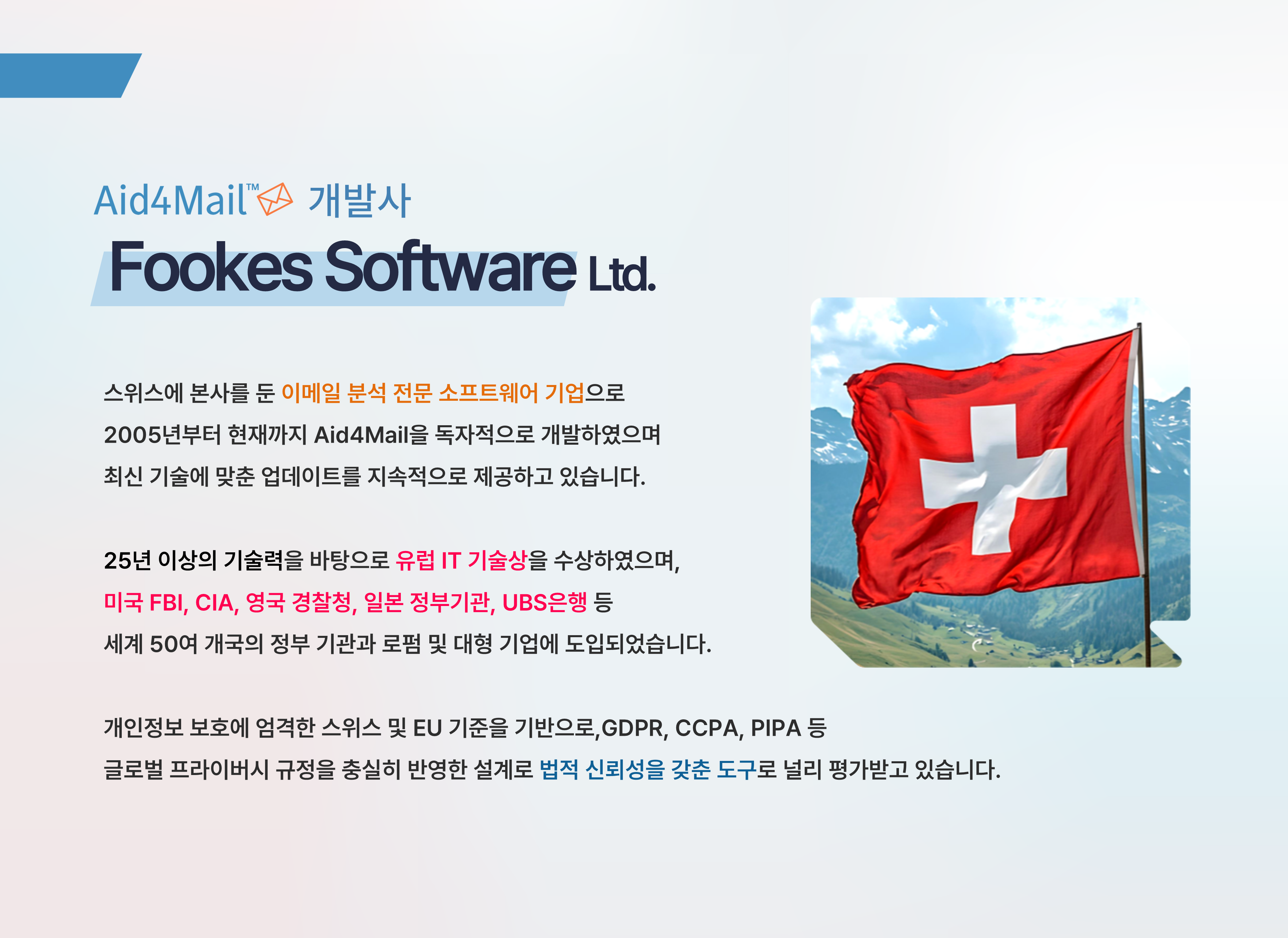 웨일브릿지가 직접 설치 · 세팅해드립니다Aid4Mail은 스위스 Fookes Software에서 개발된글로벌 이메일 포렌식 & 변환 소프트웨어입니다.이메일 데이터의 정확한 백업, 변환, 증거 추출에 특화되어 있으며,대기업, 법률기관, 포렌식 수사기관에서 널리 사용되고 있습니다.웨일브릿지는 Aid4Mail의 공식 파트너사로,고객이 직접 구매하신 Aid4Mail 라이선스를 기반으로설치, 초기 세팅, 관리를 지원해드립니다.또한 UiPath와 연계한 이메일 및 업무 자동화 구축까지 확장 가능합니다.--------------------------------------------[에디션 주요 기능] Converter 다양한 이메일 형식 간 정확한 변환 지원 (PST, MBOX, PDF, JSON 등 20여 종)간편하게 메일 추출과 변환이 필요한 경우에 적합 Investigator포렌식·eDiscovery 전용: 메타데이터·해시값 보존, 법적 증거 제출에 최적화전문적인 메일 추출과 변환이 필요한 경우에 적합 Enterprise서버 설치, USB 사용, 명령줄 기반 자동화 및 API 연동 등 기업용 환경에 최적화기업 단위의 메일 추출과 변환이 필요한 경우에 적합--------------------------------------------[서비스 내용](무료) Aid4Mail 정식 설치 및 초기 세팅· 고객 보유 라이선스 기반· 방문 설치 또는 보안 환경에 맞춘 원격 관리 제공· 로컬/망분리 환경에서도 안전하게 구축(옵션) UiPath 연동 자동화 구축 가능· 반복적인 이메일 변환·추출·보고 자동화· ERP/CRM/웹사이트 업로드 등 시스템과 연계 가능· 원하는 시간대에 24시간 자동화 수행--------------------------------------------[ 구축 적용 예시 ]· 대형 로펌의 수십명의 이메일 증거 추출 및 PDF 변환 자동화· 물류 업체의 거래처 이메일 자동 수집 엑셀 가공 ERP 업로드· 공공기관의 망분리 환경 내 이메일 백업 아카이빙· 퇴사자 이메일 백업 및 인수인계· 기업 메일 플랫폼 이전 시 메일 데이터 마이그레이션 (네이버 Outlook)· 외국계 기업의 인수합병(M&A) 시 이메일 감사 자료 정리· 은행 고객 응대 이메일 JSON 변환 후 고객 DB 연동 및 AI 답변 생성· PST 메일 데이터를 HTML로 변환하여 Email Viewer로 브리핑 진행· 수만건의 메일 데이터 제출 전 개인정보 및 보안 기준 필터링--------------------------------------------언제든지 편하게 문의 주세요! 언제든지 크몽으로 연락 주시면 10분 이내로 신속하고 친절하게 답변 및 상담 진행해드리도록 하겠습니다. Aid4Mail 라이선스 구매 또는 구매 문의.이메일 백업 또는 변환에 대한 원하시는 사항에 대해 편하게 알려주세요.