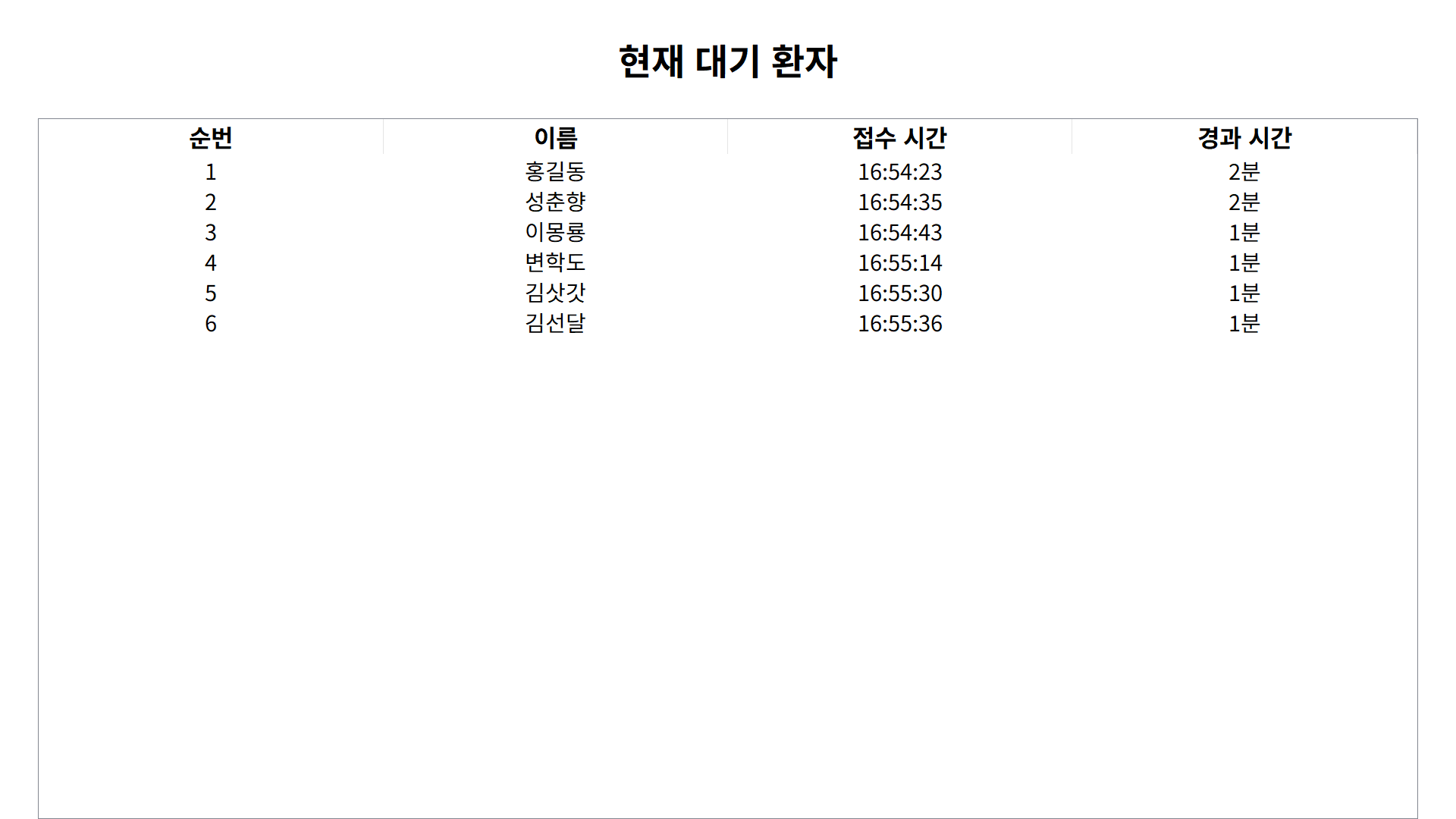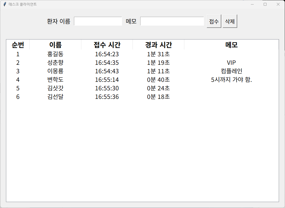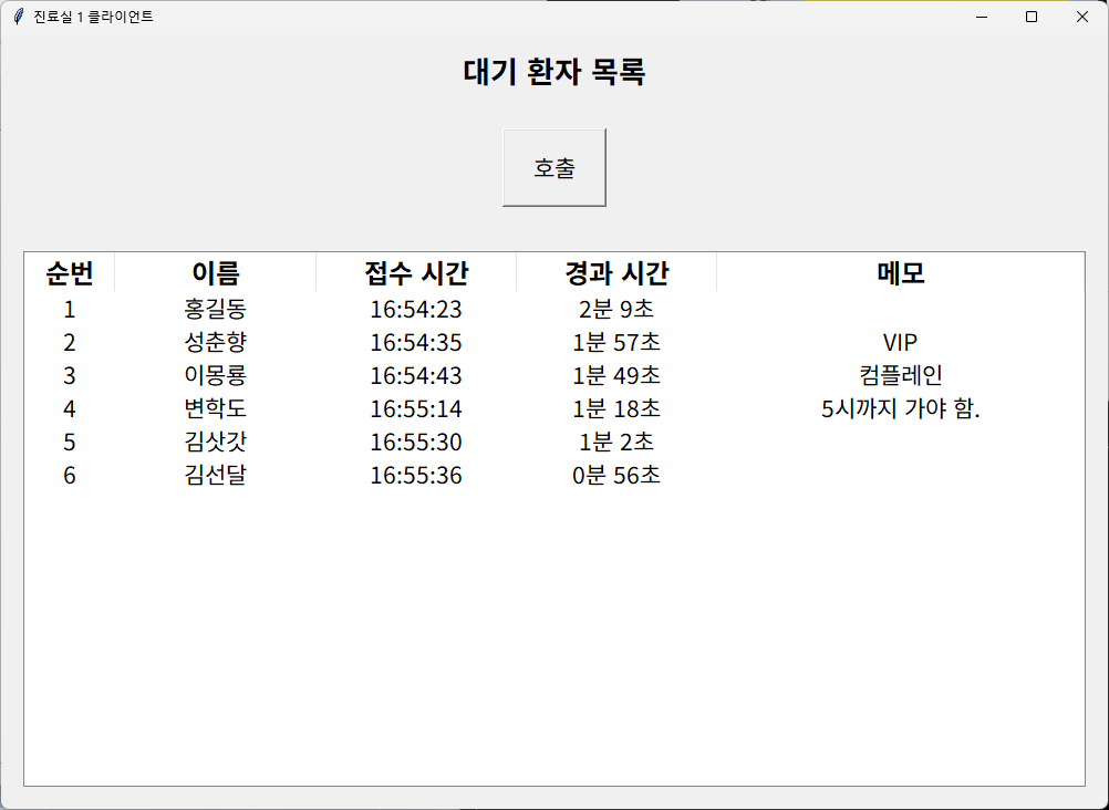 병의원 행정 전문 컨설턴트입니다.근무하는 병의원에 진료 대기/호출 프로그램이 없어, 견적을 알아보던 중 비용이 너무 비싸서파이썬으로 직접 코딩해 프로그램을 만들어버렸습니다.EMR/CRM 프로그램과 연동 서비스는 어려우며,이 프로그램을 별도로 실행하여 사용합니다. 사용 방법은 아주 가볍고 단순합니다.데스크 PC에서는 대기자 추가, 삭제 및 메모 내용을 입력합니다. (메모 내용은 노출되지 않습니다.)진료실 PC에서는 대기자를 선택해 호출할 수 있습니다.대기실 모니터에서는 '순번'/'이름'/'등록 시간'/'경과 시간'을 표시합니다.그 외 원하는 기능이 있으시면 커스텀으로 적용해드립니다. (기능 추가 및 삭제 가능)병의원뿐 아니라, 고객 대기/호출 기능이 필요한 업종에서 모두 저렴하게 사용 가능합니다.제가 알아본 시중 프로그램이나 EMR/CRM 부가 서비스 가격의,반값보다 저렴하게 배포해드립니다.월 비용 없이, 최초 설치 시 영구적으로 사용 가능하며, A/S도 계속 지원해드리겠습니다. 전문가에게 문의하기(채팅) - 솔루션 상담 - 원격 지원얼마든지 문의 하시고, 서비스 여부 결정하시면 됩니다. 1. 서버 프로그램 설치 PC2. 데스크 클라이언트 설치 PC3. 진료실 클라이언트 설치 PC4. 모니터 프로그램 설치 PC네 가지 프로그램(클라이언트)의 각각 설치 PC를 지정해서 알려주시면, 원격으로 설치해드립니다.한 대의 PC에 여러 프로그램을 설치해서 다용도로 사용하시는 방법도 가능합니다.[전문가에게 문의하기] 버튼을 누르고 상담 부탁드려요 :)