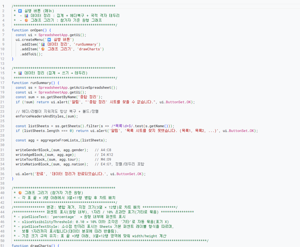 매일 반복되는 업무 때문에 퇴근이 늦어지지 않으신가요?데이터 정리, 주문 관리, 통계 작성, 알림 메일 발송…조금만 쌓여도 엑셀/시트 작업이 꼬이고, 실수까지 생기곤 합니다.또한, 내부에서만 쓸 간단한 앱이 필요할 때개발자가 없어 막막하셨던 경험도 많으실 겁니다.제가 드리는 해결책구글 시트와 자동화 시스템을 활용해반복 작업을 줄이고, 내부용 맞춤 앱까지 제작해드립니다.반복 업무 자동화데이터를 자동으로 정리하고, 중복·실수 없는 관리 가능알림 및 메일 발송조건에 맞춰 자동 발송/리마인더 발송, 칼퇴 보장신청·주문 관리인원 제한, 예약 마감, 주문 분류까지 자동으로 처리통계 및 보고 자동화누적 데이터를 한 번에 집계하고, 그래프로 깔끔하게 정리내부용 맞춤 웹앱 제작팀원 누구나 접속해 입력·조회·검색할 수 있는 전용 페이지관리 도구, 대시보드, 추천 시스템 등 원하는 기능 구현 가능무엇을 해야 할지 막막하시다면, 시트만 공유해 주세요. 제가 직접 검토 후 가장 적합한 자동화 방안을 제안드립니다.기대 효과반복 작업을 줄여 업무 효율 극대화정리 오류 최소화로 데이터 정확도 향상알림과 메일 발송 자동화로 관리 부담 감소통계와 그래프 자동화로 보고·분석 간소화맞춤형 웹앱으로 내부 관리 및 외부 서비스 확장 가능데이터 보안 안내의뢰자의 데이터는 외부에 공유되거나 악용되지 않습니다.모든 작업은 의뢰자가 제공한 사본 시트를 기준으로 진행됩니다.만약 작업 과정에서 데이터 유실이나 손상이 발생할 경우, 책임 소재는 전적으로 제게 있습니다.안심하고 맡기실 수 있도록, 보안과 신뢰를 최우선으로 하고 있습니다. 1. 상담 및 요구사항 확인자동화/웹앱 제작 목적과 필요 기능을 확인합니다.구체적인 데이터 구조(시트, 메일, 폼)를 검토합니다.2. 견적 산출 및 안내확인된 범위와 난이도에 따라 맞춤 견적을 안내드립니다.기본 패키지 외 추가 기능(웹앱, AI 추천 등)에 따른 비용 협의가 가능합니다.3. 작업 환경 준비구글 시트 사본 및 예시 데이터 공유연동할 메일·폼·웹앱 요구사항 정리4. 시스템 설계 및 개발Google Apps Script 기반 자동화 로직 구현웹앱(UI/UX) 제작 및 데이터 연동반복 테스트로 오류 최소화5. 검수 및 수정제작된 기능을 실제 환경에서 테스트요청사항 반영 후 최종 수정6. 납품 및 적용 가이드 제공완성된 자동화 시스템/웹앱 전달사용 매뉴얼 및 관리 가이드 제공필요 시 트리거(자동 실행) 설정 지원 구글 시트 자동화 및 통합 관리 시스템 제작을 위해 아래 자료가 필요합니다.1. 구글 시트 사본(원본 데이터 소실을 방지하기 위해 작업용 사본을 제공해 주셔야 합니다.)2. 원하시는 자동화 범위(어떤 과정을 자동화하고 싶은지 알려주세요.)(단순 정리, 메일 발송, 통계 요약, 알림 등 원하는 영역을 선택하시면 됩니다.)(편의를 위해, 제작자가 데이터를 검토 후 맞춤 자동화 방안도 제안 가능합니다.)3. 가공 데이터(실제 데이터 대신 예시 데이터를 주시면, 테스트 환경에서 제작 후 적용해드립니다.)맞춤형 웹앱(Web App) 제작을 위해 아래 자료가 필요합니다.1. 연동할 구글 시트 사본(웹앱과 연결할 데이터가 담긴 시트 사본이 필요합니다.)2. 웹앱 목적 및 기능 요구사항(예: 데이터 입력/조회, 조건 기반 추천, 내부 관리용 대시보드, 외부 공개용 설문/안내 페이지 등)3. 디자인/사용 환경 요청(선택사항)(PC/모바일 중 어디에 주로 사용할지)UI 구성(간단한 입력창, 슬라이드, 카드형 보기 등)(특정 브랜드 컬러/로고 적용 여부)