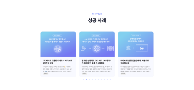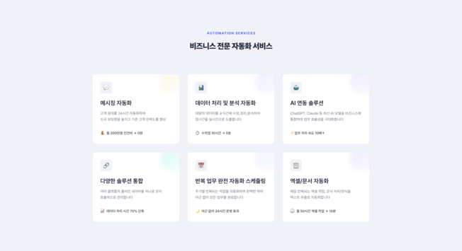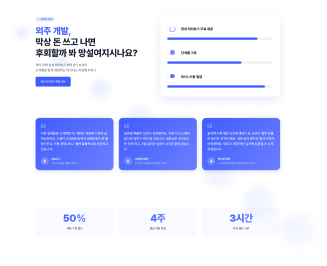 3일 만에 비즈니스 자동화, BATI.AI외주 개발, 돈 쓸 때마다 결과물이 불확실해 고민이신가요?BATI.AI는 "완성 미리보기" 무료 제공, 단계별 구축, 50% 비용 절감으로귀사의 업무 효율과 성장성을 극대화하는 비즈니스 자동화 전문 파트너입니다.주요 서비스1) 랜딩페이지 & 홈페이지:귀사의 매출 확대와 신뢰도 향상을 위한 맞춤형 랜딩페이지, 상시 업데이트 지원2) 인트라넷 & 시스템:조직의 협업·관리 효율을 높이는 대규모 인트라넷 솔루션, 단계적 확장 구조3) 자동화 기능:- 메시징 자동화: 24시간 고객 응대, 실시간 신규 유입 및 만족도 상승- 데이터 처리/분석 자동화: 수작업5분, 대량 데이터 실시간 분석- AI 연동: GPT/Claude/Genimi 등 최신 모델 기반, 업무 처리 속도 10배- 솔루션 통합: 여러 플랫폼의 데이터를 한 곳에 모아 효율 관리- 반복 업무 스케줄링: 야근 없이 24시간 운영- 엑셀/문서 자동화: 월 50시간 작업10분 자동화BATI.AI만의 강점1) 완성 미리보기로 리스크 ZERO:계약 전 결과물 영상·AI 데모로 미리 확인2) 단계별 구축·합리적 결제:부담 없이 핵심만 먼저, 필요에 따른 확장3) 50% 비용‧기간 절감:독자 기술력으로 평균 개발기간 4주1주, 비용 최대 반값4) 안정적 유지/보수 및 기술 지원:완료 후에도 전문팀이 운영까지 지속 지원5) 한국형 서비스 최적화:결제/알림 등 국내 환경 맞춤, 신규 API 계속 업데이트성공 사례 및 실사용 후기- 글로벌 브랜드, B2B 기업 등 다양한 실전 자동화 적용“경쟁사 대비 효율적으로 운영”, “3일 걸리던 실무가 3시간으로”, “팀의 일하는 방식이 아예 바뀌었다” 등 만족 후기 다수무료 미리보기·1:1 컨설팅 바로 신청 가능!계약 전에 샘플을 직접 확인하고, 단계별 맞춤 자동화로비용은 낮추고, 결과는 빠르게 만드세요.BATI.AI — 빠르고 확실한 비즈니스 자동화,이제는 크몽에서 직접 경험하세요. BATI.AI 서비스 제공 절차1) 상담 및 니즈 파악- 1:1 무료 상담 신청- 비즈니스 현황과 자동화 목표, 필요한 핵심 기능 정확히 진단2) 실제 데이터 기반 미리보기 제공- 고객의 실제 데이터를 활용해 ‘완성 미리보기’ 데모 제공- 자동화 결과물·프로세스를 영상·스크린샷으로 직접 확인3) 단계별 구축 및 견적 안내- 핵심 기능부터 “빠른 조립”으로 개발 시작- 옵션별 견적, 진행 일정 및 확장 가능성 상세 안내4) 본격 개발 및 테스트- 검증된 BATI.AI 플랫폼 활용해 각종 자동화/솔루션 구축- 중간 진행 사항 공유 및 실시간 피드백 반영5) 최종 결과물 전달·사용법 안내- 완성된 결과물 전달, 실전 환경에서 직접 시연- 사용법 상세 설명서·영상 제공, 빠른 운영안착 지원6) 유지 보수 지원 (6개월)- 실사용 중 발생하는 문제 대응- 전문팀이 유지 보수 지원 BATI.AI 서비스 시작 전의뢰인이 준비하면 좋은 사항1) 자동화 목표와 기대 효과- 해결하고 싶은 구체적인 업무 불편, 반복 상황- 기대하는 개선 효과(예: 시간 절감, 실수 감소, 매출/응대 증가)2) 현행 업무 프로세스 정리- 현재 수작업으로 진행하는 단계별 업무 흐름- 실제 사용하는 시스템, 툴, 엑셀 파일 등 자료3) 자동화 대상 데이터/문서/양식- 자동 처리하고 싶은 데이터 예시(엑셀, 구글시트, CSV, DB 등)- 활용 중인 견적서, 보고서, 메시지 템플릿 등 문서/양식 샘플4) 연동이 필요한 시스템/서비스 목록- 필수적으로 연동해야 하는 내부 시스템, 외부 플랫폼(예: 결제, ERP, SMS, 이메일 등)- 계정 정보, 접근 권한 부여 준비5) 예산·구축 일정 희망 기준- 원하는 예산 및 예상 가능한 개발 희망 일정- 우선 자동화가 필요한 핵심 영역(완료순서 우선순위)6) 참여·의사결정 담당자 지정- 빠른 피드백/최종 결정 가능한 담당자 지정- 필요 시 실무자와의 소통 채널 개설