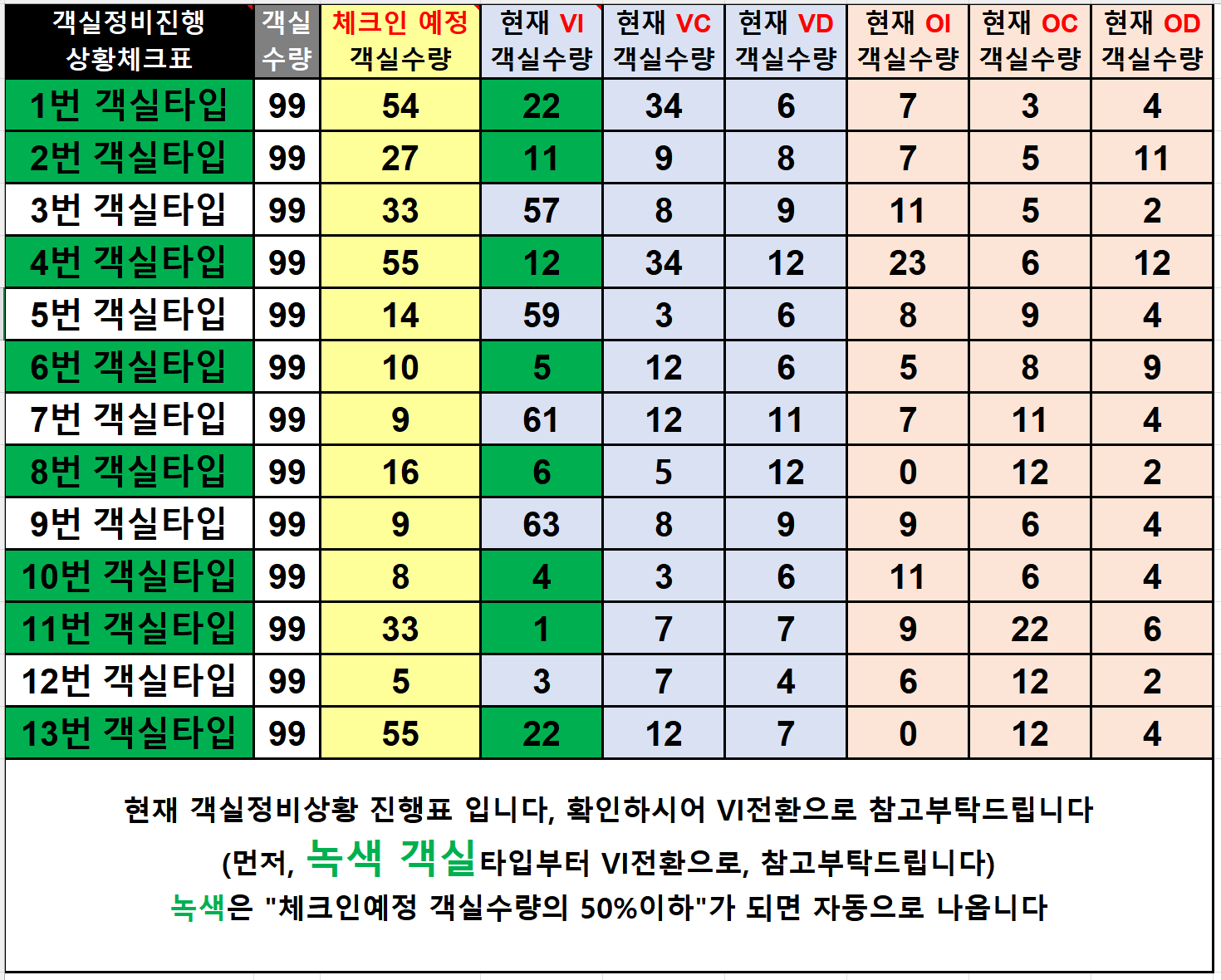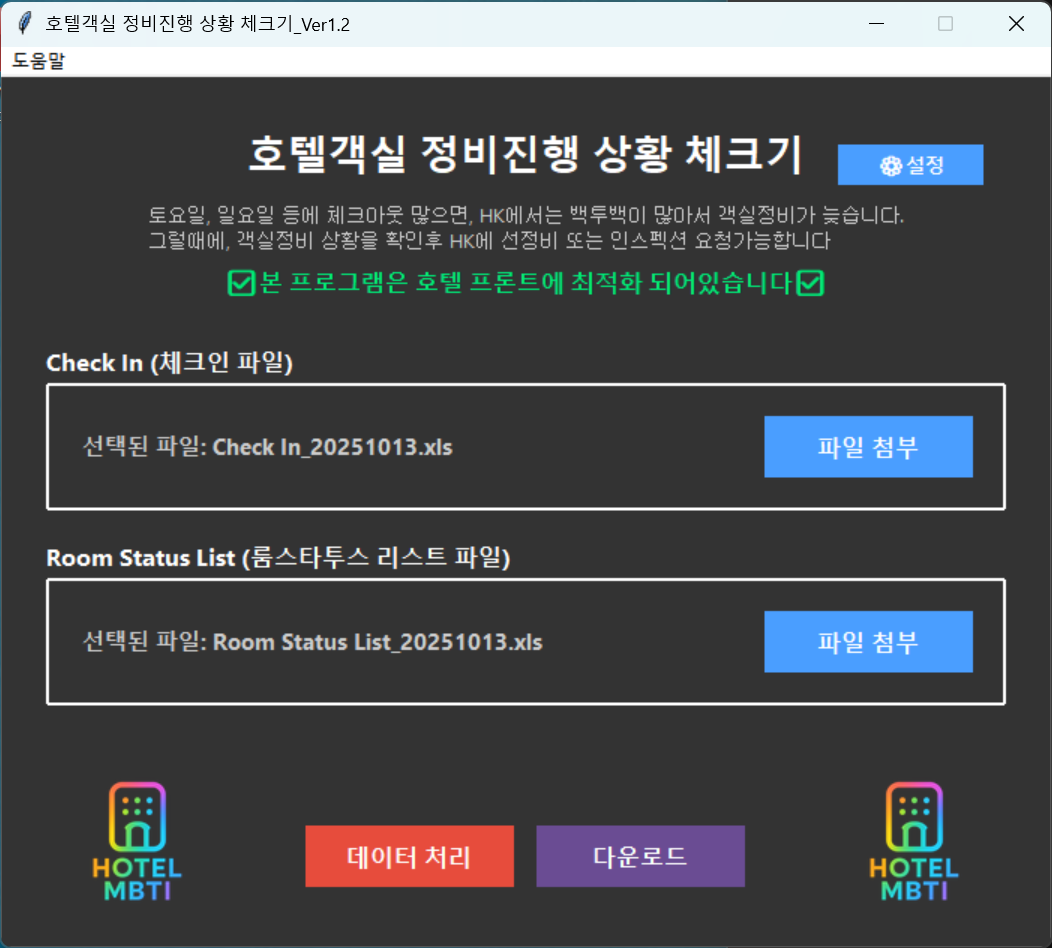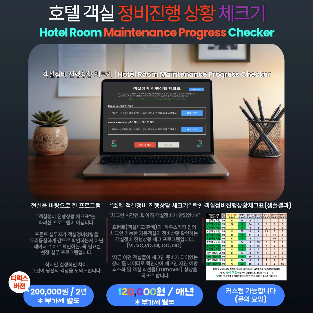 “호텔 객실정비 상황 체크기”란?“이제 체크인 시간인데, 아직도 객실정비 안되었네?”이 한마디로 시작되는 체크인 지연·컴플레인·매출손실을 예방하고 싶으세요? 그럼 도입해보세요.프로그램 한줄 소개• “객실정비 진행상황 체크기”는 화려한 기능의 프로그램이 아닙니다.• 프런트 실무자가 객실정비상황을 감(感)으로 확인하지 않고, 데이터 수치로 확인하도록 만든, 작지만 결정적인 차이를 만드는 현장실무형 도구입니다. 그 차이가 당신의 걱정을 덜어드립니다.• 프런트(객실재고·판매)와 하우스키핑 팀의 협력을 위해서, 데이터로 체크인 가능한 가용객실의 정비상태를 확인하는 현장 실무 프로그램입니다.(상태코드: VI, VC, VD, OI, OC, OD)왜 필요한가?• 감(感)으로 확인하던 정비상태 데이터 수치로 정확히!• “지금 어떤 타입의 객실이 더 필요한지” 즉시 파악 체크인 지연 최소화• 턴오버(회전율: Turnover) 향상 객실 부족예상 시나리오를 사전에 확인하여 해결방안 마련 및 시간 절약핵심 가치• 단순·직관: 화려함 대신 현장 효율에 집중한 UI• 정확 및 빠름: 체크인·배정·룸스테이터스 확인 및 분석주요 기능• 정비상태: VI/VC/VD/OI/OC/OD 수량을 한 번에 체크• 체크인 가용객실 준비 현황: 지금 바로 배정 가능한 객실 수량 확인• 객실정비률 50% 이하: 체크인 예정 객실수 대비 정비율이 50% 이하일 때 자동 색상 표시(녹색)• 엑셀 저장하기: 수동작업 가능 및 리체크 활용 가능현장 효과(체감)• 각 객실타입 정비율 확인 및 체크인 지연 예방 가능• 체크인 예정 객실수 대비 정비현황을 한눈에 확인• 체크인 지연 최소화 회전율 매출기회 고객케어• 직원의 감(感) 의존 객실수량 데이터 기반 정확도• 청소 피크 타임: 객실타입을 즉시 파악하여 인력 추가 배치한 줄 요약체크인 지연을 줄이고 객실 회전율을 높이는, 프런트·하우스키핑이 객실정비 진행상태(VI/VC/VD/OI/OC/OD)를 데이터로 즉시 확인하는 실무형 도구입니다.직원들의 편의 및 정확성을 위해 도입해 보세요. 현실을 바탕으로 한 프로그램 1️⃣2️⃣3️⃣4️⃣5️⃣1️⃣고객 상담 (크몽의 영상·스크린샷·간단 설명)>원본 파일(호텔 PMS"윙스4.0"의 당일 체크인 파일, Room Status List)을 꼭 보내주세요2️⃣실행 가능 여부 체크 (기술 검토)>요청하신 작업이 기술적으로 가능한지 사전 검토합니다.※ 불가능한 경우에는 솔직하게 안내드립니다.3️⃣상세 기능 요청 및 조율 (프리미엄 패키지에만 해당 / 스탠다드 및 디럭스 제외)>작동 방식, 반복 조건, 예외 상황, 출력될 결과물 등을 함께 조율하여 자동화를 설계합니다.(기존에 셋팅된 기능에 추가요청시에 추가비용 발생됩니다.)3️⃣개발 진행 (제작 진행시작) >보내주신 원본파일을 참고하여 자동화 프로그램 제작 시작(작업 중간에도 진행 상황을 공유)5️⃣기능 테스트 & 피드백 (이미지 사진공유 / 1회 수정 피드백) ※ 본 프로그램 "PMS 윙스 PMS4.0"을 기반으로 최적화 되어 있습니다.(그 외의 PMS를 사용하시는분들께서도 구매를 원하시면 구매전에 문의하셔야 됩니다)※ 의뢰인께서는 원본 파일(호텔 PMS"윙스4.0"의 당일 체크인 파일, Room Status List)을 꼭 보내주세요.※ 호텔의 다른 PMS 사용자분들께서도 원하시면 구매전에 문의 부탁드립니다. 가능여부를 확인후 말씀드리겠습니다.