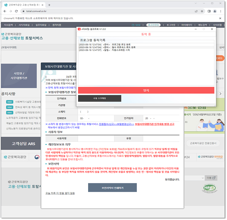 중앙 서버 스케줄러 + 클라이언트 자동 스크래퍼 + API 연동 기반 통합 자동화 시스템고객사의 4대보험 신청/조회 업무를 자동화하기 위해 중앙 스케줄러 서버, API 연동, 클라이언트 PC 기반 자동 실행 프로그램을 연동한 완전 자동화 시스템을 구축했습니다.이제 사용자는 별도 조작 없이자동 로그인 신청 실행 결과 수신까지의 전 과정을 프로그램에 맡기면 됩니다. 사용 사례매달 반복되는 4대보험 신고 자동 스케줄링으로 야간/휴일에도 처리세무·노무 자료 추출 자동화 수작업 대비 훨씬 빠르고 정확한 결과 제공 주요 기능노무법인 고객사에서 요청한 신청·조회 내역 자동 수집클라이언트 PC에서 자동 실행되는 스크래퍼로 실시간 작업 처리공단 사이트에 인증서 로그인 후 4대보험 신청·조회 자동 수행신청 결과는 안녕소프트 서버 DB에 자동 기록 및 리포트화 추천 대상노무법인/세무사무소: 여러 고객사의 4대보험 업무를 매달 반복 처리해야 하는 경우중소기업 인사·총무 담당자: 매번 수기로 신청·조회를 반복하며 실수를 줄이고 싶은 분대량 신고를 처리해야 하는 대기업·기업 대행사업무 자동화를 통해 정확도와 생산성을 동시에 높이고 싶은 조직 도입 효과“반복 작업의 시간을 줄이고, 실수를 없애는 완벽한 솔루션!”자동화된 데이터 처리: 사람이 직접 입력·확인하던 업무를 자동화오류 제거: 실수율을 0%에 가깝게, 재작업 없이 정확하게시간 절약: 몇 시간 걸리던 작업을 단 몇 분 만에 처리ERP, RPA 자동화 전문 개발사 안녕소프트입니다.저희는 S-OIL STLC 협력사로, 800건 이상의 윈도우 프로그램과 웹 기반 솔루션을 납품한 경험을 바탕으로, 세무·노무 자동화, 고객·매출 관리, 공장 자동화, 데이터 크롤링 및 엑셀/PDF 변환 등 다양한 맞춤형 시스템을 제작하고 있습니다.고객의 업무 흐름을 정확히 파악하여 불필요한 과정을 줄이고,합리적인 비용으로 현장 중심의 자동화 솔루션을 제공합니다. 1)고객 맞춤 컨설팅2)기획 및 견적 도출3) 컨설팅 기반 프로그램 제작 4)시운전 진행 5)수정/보완 문제 해결 6)최종 인계 유지 및 보수 기획서가 있다면 첨부기획서가 없다면:-현재 사용 중인 시스템 및 업무 방식-원하는 기능과 시스템에 대한 구상-개발 희망 일정-참고 자료나 레퍼런스(있다면)