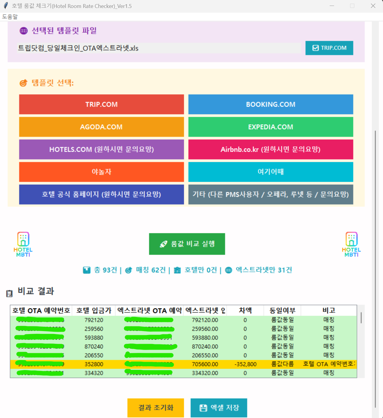 “호텔 룸값 체크기” 란?(동영상 설명서)> “오늘도 룸값은 제대로 입력됐을까?”, ”마감을 돌려도 될까?“ 호텔의 나이트오디터(Night Auditor)라면 매일 밤 이런 걱정을 해보셨을 겁니다.객실 요금 하나하나 확인하다 보면 어느새 시간은 훌쩍,,, 잘못된 계산의 실수는 호텔의 매출조정 및 본인 개인손실로 이어집니다.이제 그 불안과 피로를 줄여줄 해결책이 등장했습니다.호텔의 나이트오디터(Night Auditor)의 파트너로 “호텔 룸값 체크기” 프로그램입니다.현실을 바탕으로 한 프로그램“호텔 룸값 체크기”는 호텔 현장 실무자가 오직 나이트오디터(Night Auditor)의 실제 고민을 해결하기 위해 만들어졌습니다.•국내외OTA와 호텔PMS의 비교 차액값 출력•”맞춤형 호텔PMS“와 “국내외 OTA” 가능핵심 기능1.자동 매칭 & 검증PMS(호텔 관리 시스템) 데이터를 불러와 엑스트라넷OTA예약의 데이터의 객실 요금을 비교.2.불일치 룸값 요금 즉시 확인가능잘못된 요금, 누락, 중복까지 체크.3.엑셀 저장 및 바로열기야근 근무자가 직접 수동으로 체크가능. 4.호텔현장 맞춤 커스텀마이징각 호텔의 상황에 맞게 셋팅 가능.기대되는 변화•나이트오디터(Night Audtor)의 피로 감소수작업 검증에 쓰던 30분~1시간을 단 몇 분으로 단축.•정확도 극대화실수로 놓치던 조식포함된 패키지 요금 계산까지 꼼꼼히 검증.•운영 효율 상승직원들은 룸값 숫자들의 확인 체크시간을 줄이면서, “고객 서비스와 경험 개선”에 더 집중할 수 있음.이런 호텔에 특히 추천합니다•야간 근무 인력이 적어 업무 부담이 큰 중소형 호텔 또는 객실 300개이상 호텔(분양형, 생활형숙박시설 등)•OTA 판매 비중이 높아 요금 검증이 복잡한 도심 비즈니스 호텔•프로모션, 패키지 요금의 변경이 잦은 리조트 & 부티크 호텔호텔의 밤을 바꾸는 작은 차이“호텔 룸값 체크기”는 매출을 극대화 시키는 기능의 프로그램이 아닙니다.호텔의 나이트오디터(Night Auditor)의 밤과 함께하는 파트너로서, 꼭 필요한 실무 프로그램 입니다.작지만 결정적인 차이. 그것이 당신의 시간을 세이브해드립니다.호텔에서 직원의 시간을 ‘SAVE’을 원한다면, 지금 바로 “호텔 룸값 체크기”를 도입해보세요.호텔의 밤은 더 편안해지고, 아침은 더 완벽해집니다.=================================기업체 및 관공서 등 반복되는 서류 자동화 문의 및 견적 환영합니다. 많은 관심 감사드립니다. 현실적인 실무자(나이트오디터(Night Auditor))를 위한 프로그램1️⃣고객 상담 (크몽의 영상·스크린샷·간단 설명)>원본 파일(호텔 PMS"윙스4.0"의 당일 체크인의 "Global Guest File 파일", "각 템플릿별의 엑스트라넷 OTA의 당일 체크인 파일들")을 꼭 보내주세요예)1) TRIP.COM에서 엑스트라넷 OTA의 당일 체크인 파일2) BOOKING.COM에서 엑스트라넷 OTA의 당일 체크인 파일3) AGODA.COM에서 엑스트라넷 OTA의 당일 체크인 파일4) EXPEDIA.COM에서 엑스트라넷 OTA의 당일 체크인 파일5) NOL.COM(야놀자)에서 엑스트라넷 OTA의 당일 체크인 파일6) YEOGI.COM(여기어때)에서 엑스트라넷 OTA의 당일 체크인 파일2️⃣실행 가능 여부 체크 (기술 검토)>요청하신 작업이 기술적으로 가능한지 사전 검토합니다.※ 불가능한 경우에는 솔직하게 안내드립니다.3️⃣상세 기능 요청 및 조율 (프리미엄 패키지에만 해당 / 스탠다드 및 디럭스 제외)>작동 방식, 반복 조건, 예외 상황, 출력될 결과물 등을 함께 조율하여 자동화를 설계합니다.(기존에 셋팅된 기능에 추가요청시에 추가비용 발생됩니다.)4️⃣개발 진행 (제작 진행시작) >보내주신 원본파일을 참고하여 자동화 프로그램 제작 시작(필요시 작업 중간에도 진행상황 공유)5️⃣기능 테스트 & 피드백 (파일 공유 / 1회 수정 피드백) ※ 본 프로그램 "호텔 PMS 윙스 PMS4.0"을 기반으로 최적화 되어 있습니다.(그 외의 PMS를 사용하시는분들께서도 구매를 원하시면 구매전에 문의하셔야 됩니다)※ 의뢰인께서는 원본 파일(호텔 PMS"윙스4.0"의 당일 체크인의 "Global Guest File 파일"과 "각각의 템플릿별 엑스트라넷 OTA의 당일 체크인 파일들")을 꼭 보내주세요.예)1) TRIP.COM에서 엑스트라넷 OTA의 당일 체크인 파일2) BOOKING.COM에서 엑스트라넷 OTA의 당일 체크인 파일3) AGODA.COM에서 엑스트라넷 OTA의 당일 체크인 파일4) EXPEDIA.COM에서 엑스트라넷 OTA의 당일 체크인 파일5) NOL.COM(야놀자)에서 엑스트라넷 OTA의 당일 체크인 파일6) YEOGI.COM(여기어때)에서 엑스트라넷 OTA의 당일 체크인 파일※ 호텔의 다른 PMS 사용자분들께서도 원하시면 구매전에 문의 부탁드립니다. 가능여부를 확인후 말씀드리겠습니다.