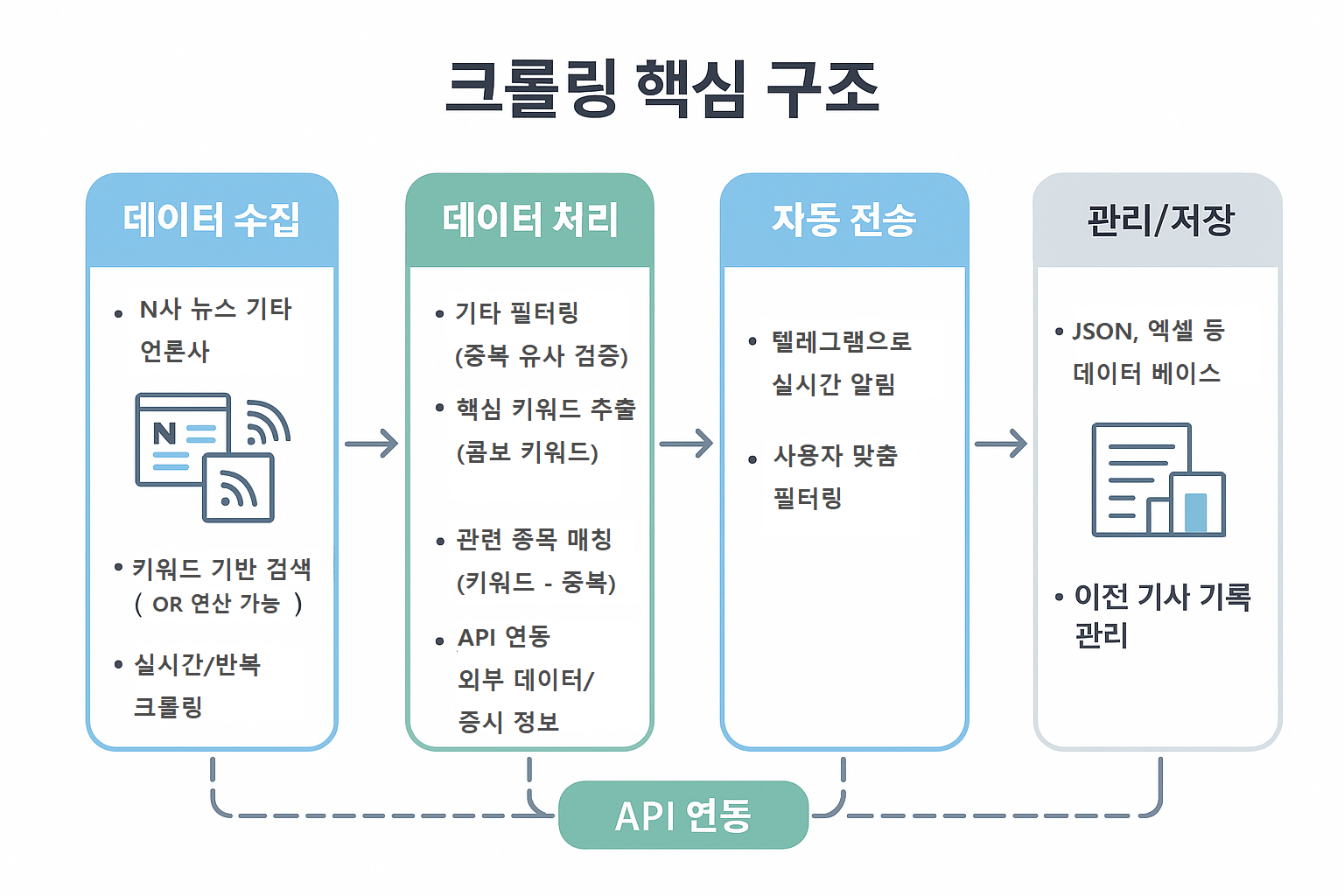 단순한 크롤링이 아닙니다.본 서비스는 뉴스·섹터·거래대금 기반 자동화 분석 스크립트를 구축하고텔레그램으로 실시간 송출까지 가능한 통합 시스템을 제공합니다.파이썬을 기반으로 콤보 키워드 검색, 관련주 자동 매칭,중복/유사/최초 기사 판별, 섹터별 기사 집중도 분석 등이 포함되어 있으며,필요 시 증권사 API 연동 확장까지 지원합니다.단순한 코드 판매가 아닌,귀하의 목적(예: 뉴스 기반 테마 모니터링, 종목 키워드 분석 등)에 맞게완제품을 커스터마이징 및 세팅해드리는 형태의 레슨 서비스입니다.이런 분께 추천드립니다뉴스 데이터를 활용해 테마·이슈 기반 종목 흐름을 빠르게 파악하고 싶은 분크롤링 + 데이터 분석 + 실시간 알림을 한 번에 운영하고 싶은 분파이썬을 이용한 자동화 시스템을 구축하고 싶은 분**타 사 크롤링은 한계가 명확합니다.크롤링을 접해 보신분은 잘 아시겠지만 특정 키워드로 기사를 검색하면 중복이나 유사 기사들이 수십개가 날라옵니다. 따라서 키워드 수를 늘리면 타이틀만 약간 다른 기사들이 계속 들어오기 때문에 결국 안쓰게 됩니다. 혹은 키워드 수를 2~3개로 압축하게 됩니다.제가 만든 코드는 인공지능 급으로 정확도가 95%이상으로 중복, 유사 기사들을 걸러서 최초 기사만 텔레그램으로 송출합니다.아래는 사용 예시입니다. (터미널 화면)----------------------------------------------------------------------[08:13:22] 66초 후 크롤링됩니다.[08:14:34] 갱신된 기사 있음: 2건갱신 시점: 2025-10-31 08:14 | 이번 배치 기사 수: 21. xxx, 희토류 풀었다…무역전쟁 '휴전' xx언롭사 / 2025-10-31 08:10:10 관련주: 유니온, 유니온머티리얼, 노바텍, POSCO홀딩스, 삼화전자 [기사 링크](https://000.000/0471974) (유사)2. xx 사이버트럭, 출시 2년 안돼 xx번째 리콜 뉴xx언론사 / 2025-10-31 08:10:11 [기사 링크](https://xxxx.xx/0008576102) (중복)[08:14:34] 68초 후 크롤링됩니다----------------------------------------------------------------------터미널 화면입니다만, 중복, 유사 판정된 기사는 텔레그램으로 송출이 안되며 아래와 같이 최초 판정된 기사만 텔레그램으로 송출됩니다.(터미널 화면)----------------------------------------------------------------------[08:16:54] 61초 후 크롤링됩니다.[08:18:02] 갱신된 기사 있음: 4건갱신 시점: 2025-10-31 08:18 | 이번 배치 기사 수: 42. 삼성SDI, xxx 배터리' 상용화 속도 머xxx언론사 / 2025-10-31 08:12:39 [기사 링크](https://xxx.xxxx/0001110296) (최초)4. 트럼프, 방한 마치고 귀국하자 백악관 핼러윈 행사 주최 언론사S / 2025-10-31 08:12:40 [기사 링크](https://xxx/0012057326) (중복)[텔레그램] 메시지 전송 완료[08:18:03] 61초 후 크롤링됩니다.----------------------------------------------------------------------텔레그램 송출된 화면 예시.----------------------------------------------------------------------갱신 시점: 2025-10-31 08:18 | 이번 배치 기사 수: 11. 삼성SDI, xxx 배터리' 상용화 속도 머xxx언론사 / 2025-10-31 08:12:39 [기사 링크](https://xxx.xxxx/0001110296) (최초)----------------------------------------------------------------------또한 매 시각 상위 섹터, 거래대금(코스피/코스닥) 상위 TOP10을 텔레그램 알람으로 송출되며, 중복과 유사로 쌓였던 기사는 아래 예시와 같이 집계되어 텔레그램으로 송출됩니다.----------------------------------------------------------------------키워드별 상위 기사 요약 (2025-10-30 08:55)1. 엔비디아 세계 최초 시총 (6건)2. 신라면세점 업계 최초 대만 (2건)3. 배전반 본격 진출LS일렉트릭일렉시스 맞손 (2건)4. 투자능력고사 주식남녀 한미 관세 (2건)5. 다올證 한온시스템 기업 가치 (2건)6. 핑크퐁아기상어 잇는다더핑크퐁컴퍼니 차세대 IP (2건)7. 수원시 동절기 도로 제설 (2건) 1. 완성형 파이썬 스크립트 제공2. 텔레그램 실시간 송출 시스템 구축3. 거래대금·섹터별 기사 빈도 분석 기능4. 중복·유사 기사 필터링 로직 탑재5. 키워드/콤보 키워드 기반 기사 수집6. 관련 종목 자동 매칭 기능7.증권사 API 연동 가이드 (확장 지원) 파이썬이 돌아갈 수 있는 환경의 (인터넷이 접속) 컴퓨터를 준비해 주십시요. 또한 텔레그램 메세지를 확인할 수 있는 휴대폰이 필요합니다.
