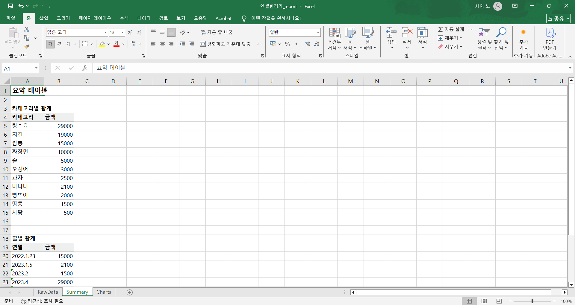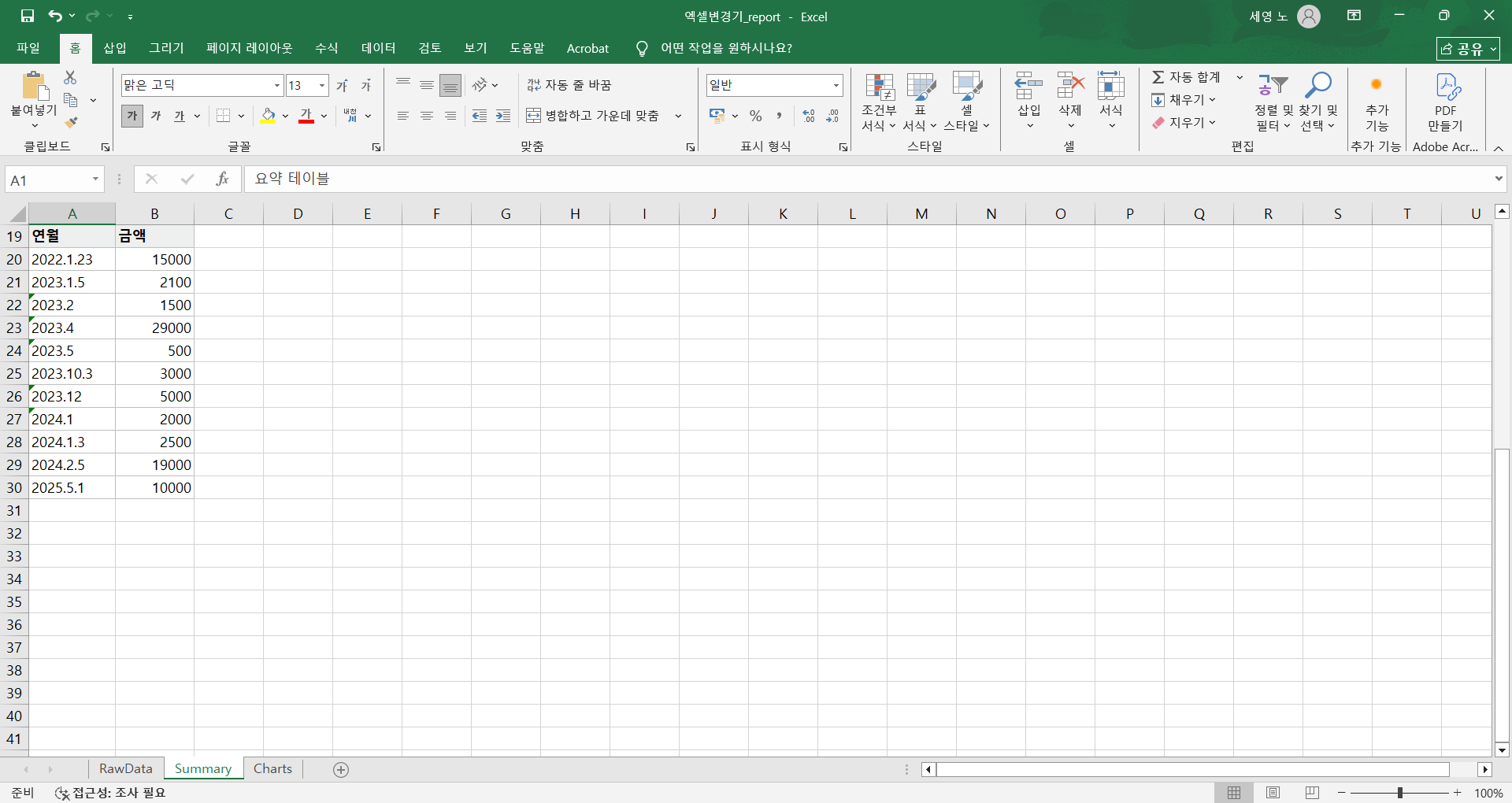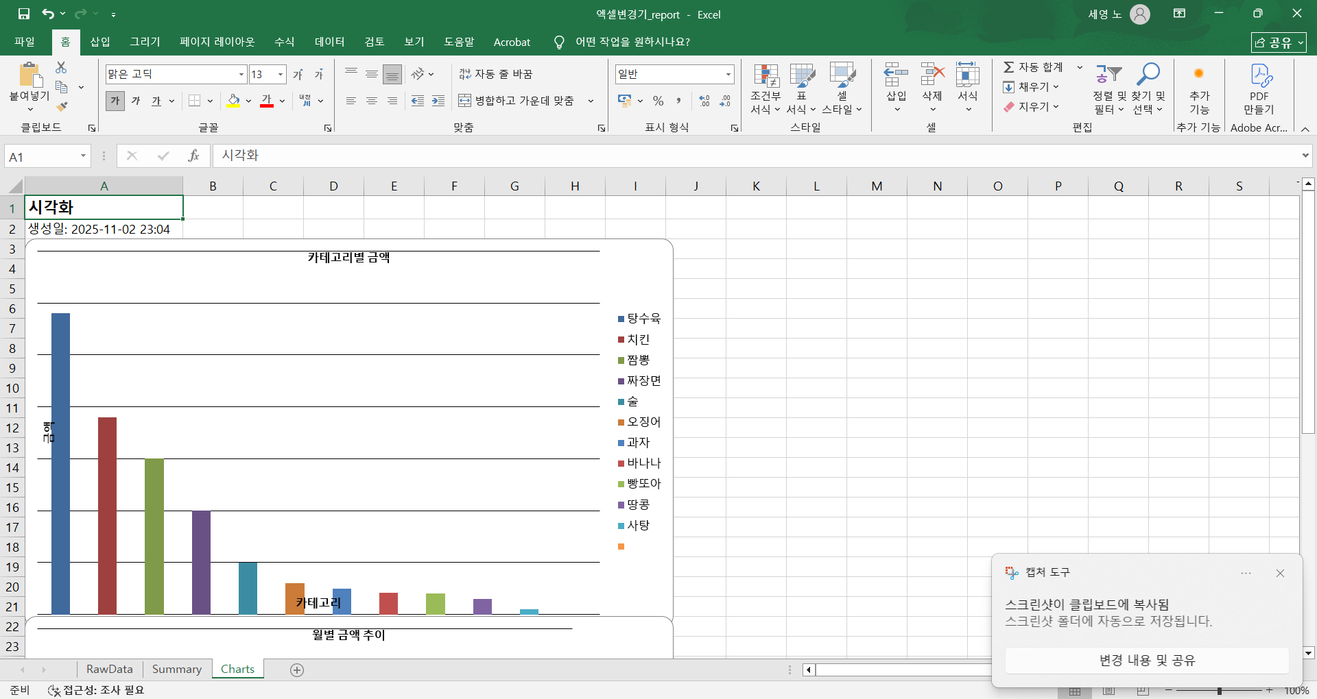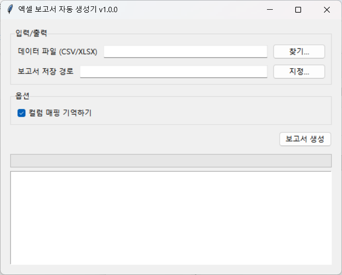 🧾 엑셀 자동 보고서 생성기날짜 / 카테고리 / 금액 3가지 컬럼만 있으면 자동으로 요약 보고서를 만들어주는 프로그램입니다.엑셀이나 CSV 데이터를 불러오면자동으로 월별 합계, 카테고리별 합계, 차트 시각화 시트를 생성합니다.복잡한 수식이나 피벗테이블 없이 클릭 한 번으로 완성된 보고서를 받을 수 있습니다.기능 요약날짜, 카테고리, 금액 3개 항목만 자동 인식다양한 날짜 형식(2024.1, 24.1.5, 2023-04-13 12:50) 자동 처리Summary 시트: 월별/카테고리별 합계 자동 계산Charts 시트: 막대형 + 라인형 차트 자동 생성RawData 시트: 원본 데이터 그대로 보존exe 단일 실행 파일 제공 (Python 설치 불필요)이런 분께 추천드립니다매출이나 지출 데이터를 엑셀로 관리하는 분매달 보고용 합계표를 만드는 사무직·회계 담당자반복적인 수작업을 자동화하고 싶은 분엑셀을 잘 몰라도 리포트를 자동으로 만들고 싶은 분결과물 예시RawData : 원본 데이터 자동 정리Summary : 월별 및 카테고리별 합계표Charts : 자동 생성된 시각화 그래프제공 형태exe 실행 파일 (즉시 사용 가능)요청 시 파이썬 원본 코드 제공작업 및 수정 안내작업 기간: 1일 이내수정: 1회 (실행 오류·호환성 문제 무상 수정)FAQQ. 날짜 형식이 제각각인데 괜찮나요?A. 네, 24.1, 2024-1-5, 2023.4.13 12:50 등 대부분 자동 인식됩니다.Q. 어떤 데이터가 필요하나요?A. 날짜 / 카테고리 / 금액 이 세 컬럼만 있으면 됩니다. (열 이름은 자동 탐지됩니다.)Q. 회사용 맞춤 버전도 가능한가요?A. 가능합니다. 구조가 다를 경우 추가 협의로 커스터마이징 제작해드립니다. 🧭 서비스 제공 절차 (완제품 exe 제공형)1️⃣ 주문 접수고객이 “엑셀 자동 보고서 생성기” 프로그램을 주문합니다.별도의 데이터 전달은 필요하지 않습니다.2️⃣ 프로그램 제작 및 검증최신 버전 기준으로 exe 파일을 빌드하고실행 안정성 및 파일 호환성을 확인합니다.3️⃣ exe 실행 파일 전달주문 후 1일 이내, exe 실행 파일을 전달드립니다.Python이나 Excel 매크로 설치가 필요 없습니다.4️⃣ 사용 방법 안내프로그램 실행 데이터 파일 불러오기 자동 보고서 생성월별 합계, 카테고리별 요약, 차트 자동 생성 기능 포함5️⃣ 사후 지원실행 오류 또는 호환성 문제 발생 시 1회 무상 수정 지원이후 기능 확장(맞춤 컬럼 추가 등)은 별도 협의 가능합니다.요약:고객은 exe 파일만 받으면 바로 사용 가능,데이터를 따로 전달할 필요가 없는 완제품 자동화 프로그램 형태다. 1. 데이터 파일 준비 (본인 PC에 있는 파일)프로그램은 고객님의 컴퓨터에서 직접 실행됩니다.날짜 / 카테고리 / 금액 3가지 컬럼만 포함된엑셀(.xlsx) 또는 CSV(.csv) 파일을 준비해두시면 됩니다.(열 이름은 자유롭게 설정 가능하며 자동 인식됩니다.)2. 추가 설치 불필요Python, Excel 매크로, 기타 프로그램 설치가 필요 없습니다.exe 파일만 실행하면 자동으로 보고서가 생성됩니다.3. 권장 환경Windows 10 이상 (64bit)Excel 2016 이상 또는 CSV 파일 사용 가능기본 한글 폰트(맑은 고딕) 설치 권장4. 주의사항프로그램은 대부분의 일반적인 날짜 형식을 자동 인식하지만,너무 특이하거나 일관성이 없는 날짜 표기는 일부 누락될 수 있습니다.한 파일 내 데이터량이 5만 행 이상일 경우 처리 속도가 다소 느려질 수 있습니다.보안 프로그램 또는 Windows SmartScreen이 ‘외부 파일’로 인식해 실행을 차단할 수 있습니다.이 경우, “추가 정보 실행” 버튼을 눌러 직접 실행해주시면 됩니다.이 파일은 제작자가 직접 빌드한 단일 실행 파일로, 외부 전송 기능이 없습니다.(필요 시 바이러스 검사 인증 결과를 요청하시면 제공합니다.)