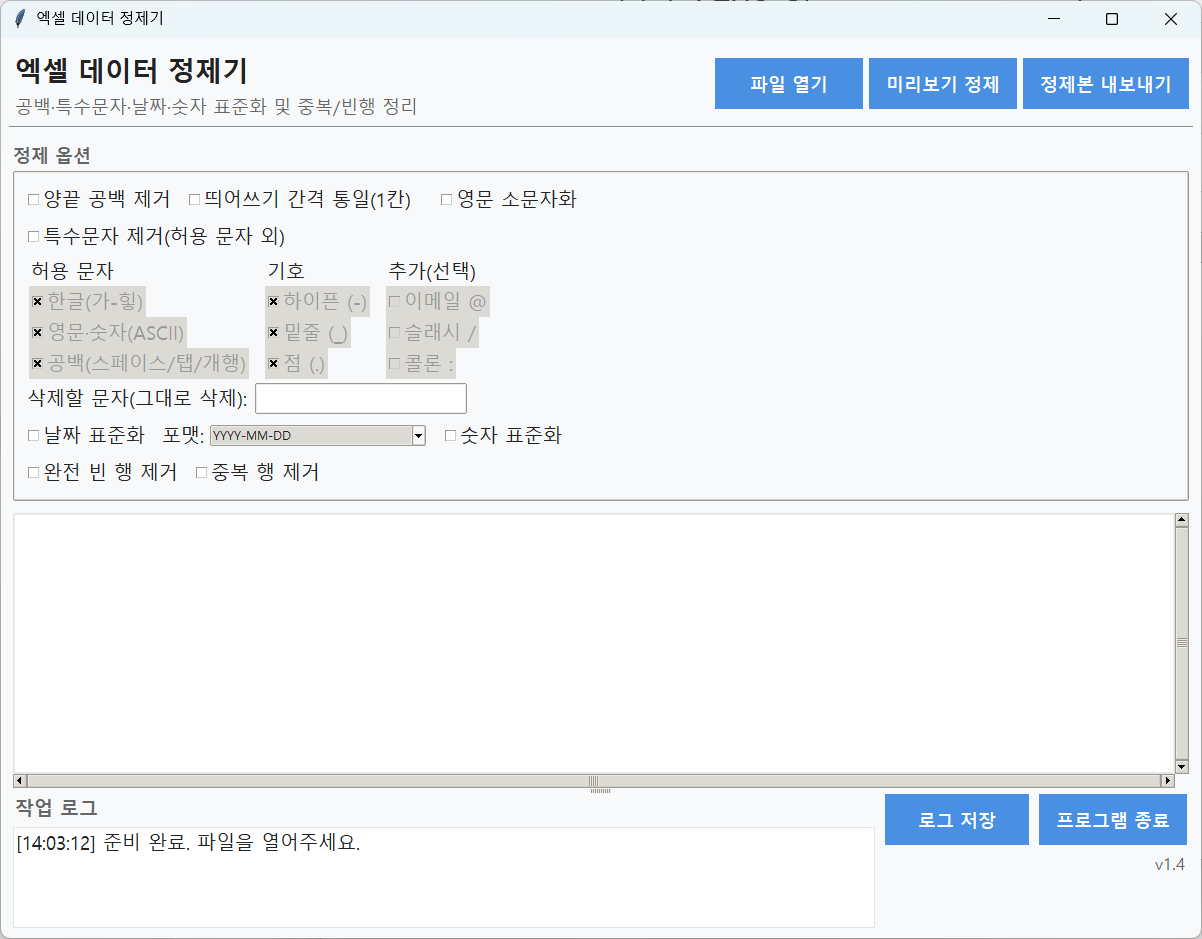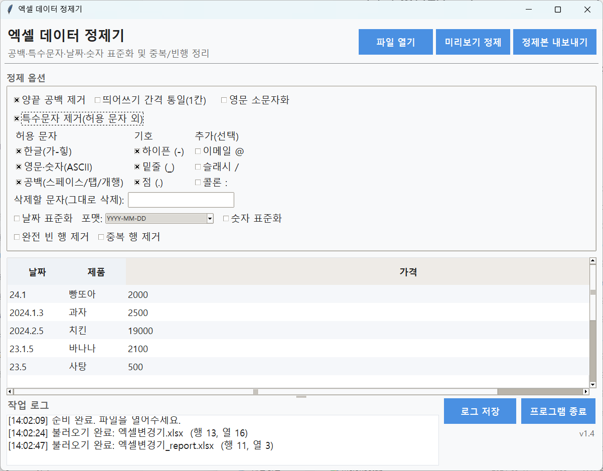 서비스 소개엑셀 데이터 정제·표준화 자동화 프로그램은엑셀/CSV 데이터를 단 1초 만에 깨끗하게 정리해주는 자동화 도구입니다.불필요한 공백, 특수문자, 날짜·숫자 형식 불일치,중복 행, 완전 빈 행 등 데이터를 분석 전에 한 번에 정제할 수 있습니다.직접 수동 편집하거나 복잡한 함수·매크로를 쓸 필요가 없습니다.주요 기능문자 정리문자열 양끝 공백 제거띄어쓰기 간격 통일(공백 1칸으로)영문 자동 소문자화특수문자 제거 및 허용 문자 설정허용 문자(한글/영문/숫자/공백/기호) 직접 선택불필요한 특수문자 일괄 삭제“삭제할 문자”를 직접 지정 가능 (예: ()[]# 등)날짜·숫자 표준화다양한 날짜 형식을 자동 인식하여 YYYY-MM-DD 등으로 통일연월만/월일만 있는 데이터 자동 보정쉼표 포함 숫자(1,234)도 실수형으로 정규화데이터 정리완전 빈 행 자동 제거 (공백만 있는 행 포함)중복 행 자동 제거원본 대비 행 수 변화 로그 자동 기록미리보기 & 로그 시스템최대 500행 미리보기 표시정제 과정 전체 로그 저장 가능원본 파일은 절대 손상되지 않음🧭 사용 예시고객명단, 설문결과, 거래내역, 매출표 등외부 시스템에서 받은 CSV 불러오기 후 자동 정리분석/리포트 전 데이터 전처리 용도🪄 사용 방법프로그램 실행 후 [파일 열기]클릭정제 옵션을 선택 (공백/특수문자/날짜/숫자 등)[미리보기 정제]로 결과 확인[정제본 내보내기] 클릭 새 엑셀로 저장(선택) 로그 파일로 정제 이력 보관제공 내역엑셀 데이터 정제기실행파일(.exe)사용 설명서(PDF)(옵션) 소스 코드 및 주석 포함 버전🧩 기술 스펙Python + Pandas + Tkinter 기반 Modern UI윈도우 10/11 호환엑셀(.xlsx), CSV(.csv) 지원한글 폰트·UI 완전 대응안전성 안내정제는 원본을 복사하여 처리하므로,원본 데이터는 절대 손상되지 않습니다.모든 정제 결과는 별도 저장 경로로 내보내집니다.문의정제 옵션을 맞춤화하고 싶거나기업용/대용량 버전이 필요하신 경우 문의해 주세요.요청 시 맞춤 기능(파일 병합, 폴더 일괄처리 등)도 구현 가능합니다. 🧾 서비스 제공 절차의뢰 및 파일 접수구매 후, 정제할 엑셀 또는 CSV 파일을 전달해주세요.어떤 항목을 정리하고 싶은지(예: 특수문자 제거, 날짜 통일 등) 간단히 알려주세요.파일 내 개인정보나 민감한 데이터가 있을 경우 암호화된 버전으로 전달해도 됩니다.정제 옵션 설정전달받은 파일을 분석 후, 적절한 정제 옵션 세트를 구성합니다.예: “공백 제거 + 특수문자 정리 + 날짜 표준화 + 중복 행 제거”필요 시, 사용자 맞춤 패턴(허용 문자·삭제 문자 등)도 반영합니다.정제 과정 시뮬레이션프로그램에서 실제 데이터를 불러 미리보기 정제를 진행합니다.정제 전/후 차이 및 로그를 확인하여 이상 여부를 점검합니다.옵션 조정이 필요할 경우 이 단계에서 수정이 가능합니다.정제본 제작 및 검수확인된 설정으로 전체 데이터를 정제합니다.완성된정제본(.xlsx) 파일을 검수 후 전달드립니다.모든 정제 과정의 로그(.txt) 파일도 함께 제공됩니다.납품 및 설치 지원완성본(정제된 파일)과 프로그램 실행파일(.exe) 을 함께 전달드립니다.설치가 어려운 경우, 원격으로 설치 안내를 도와드립니다.(요청 시) 소스 코드 및 주석 포함 버전 제공 가능합니다.사후 지원전달받은 파일에서 예외 형식(날짜·숫자 인식 오류 등)이 발견될 경우,1회 무상 수정 지원을 제공합니다.프로그램 오류 발생 시, 동일 버전 내에서 무상 업데이트를 진행합니다. 🧰 의뢰인 준비사항정제할 파일 준비엑셀(.xlsx) 또는 CSV(.csv) 파일 형태로 준비해주세요.파일 용량이 크더라도 괜찮습니다. (최대 약 50MB까지 처리 가능)여러 파일을 동시에 정제해야 하는 경우, 압축(zip) 형태로 묶어서 전달해주세요.정제 방향 선택다음 항목 중 원하시는 정제 방향을 선택하거나 자유롭게 요청 가능합니다.공백 제거 (양끝/중간 중복 공백)특수문자 제거 (허용 문자 직접 지정 가능)날짜 형식 통일 (예: YYYY-MM-DD)숫자 통일 (쉼표, 소수점 처리 등)완전 빈 행 및 중복 행 제거선택을 안 하셔도 괜찮습니다.전문가가 파일을 분석 후 자동으로 가장 안전한 옵션 조합을 적용합니다.결과물 저장 형태 지정 (선택사항)기본적으로 원본파일명_cleaned.xlsx 형태로 결과를 제공합니다.다른 이름으로 저장하거나 폴더를 지정하고 싶으시면 알려주세요.특이사항 전달 (선택사항)날짜나 숫자 형식을 특정 포맷으로 맞추고 싶을 때(예: “YYYY/MM/DD HH:MM” 또는 “소수점 2자리까지”)삭제하지 말아야 할 특정 문자가 있을 때(예: @, /, #, - 등)특정 시트만 정제하고 싶을 때설치 관련 (실행파일 버전만 해당)윈도우 10 이상 PC 권장압축 해제 후 ExcelCleaner.exe 실행만으로 바로 사용 가능별도의 설치나 관리자 권한 불필요