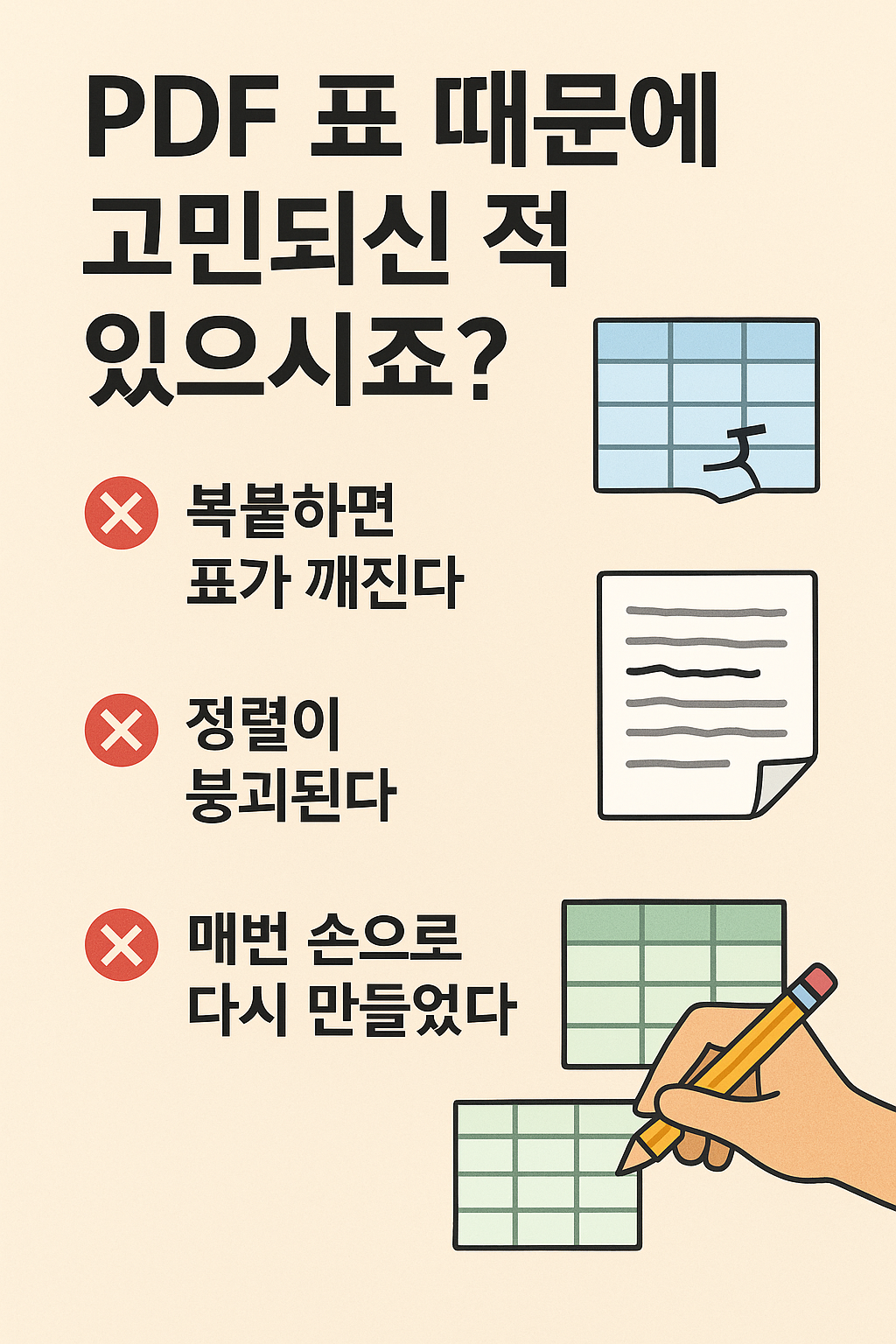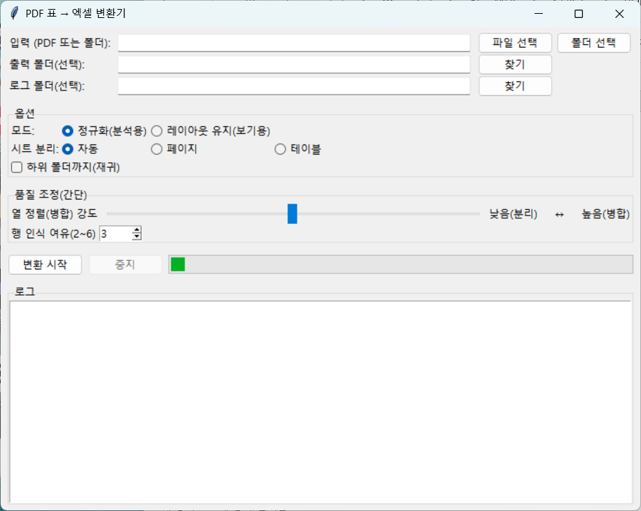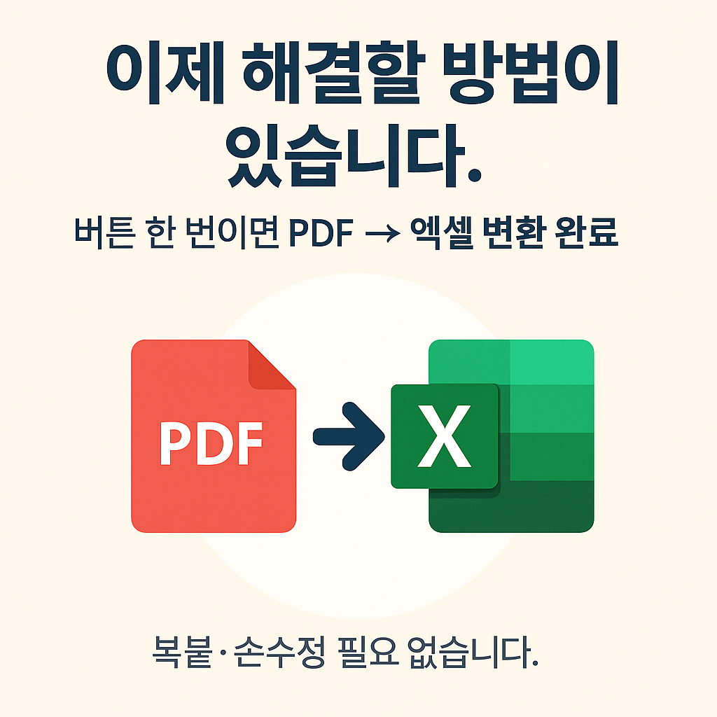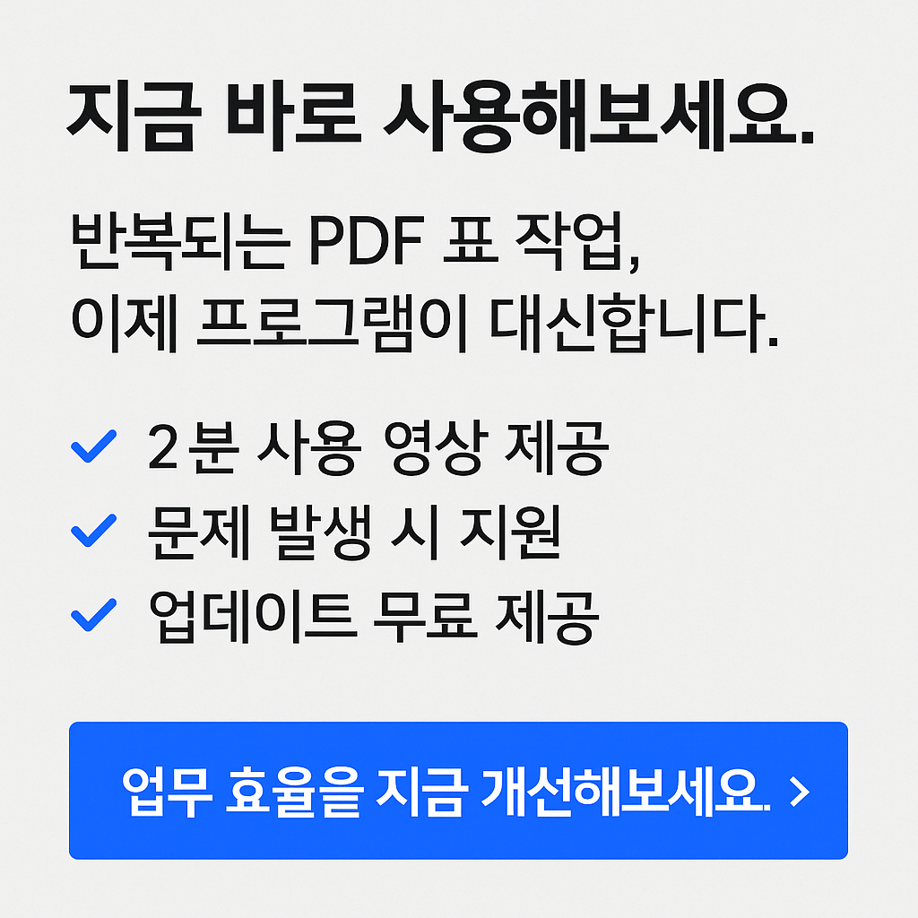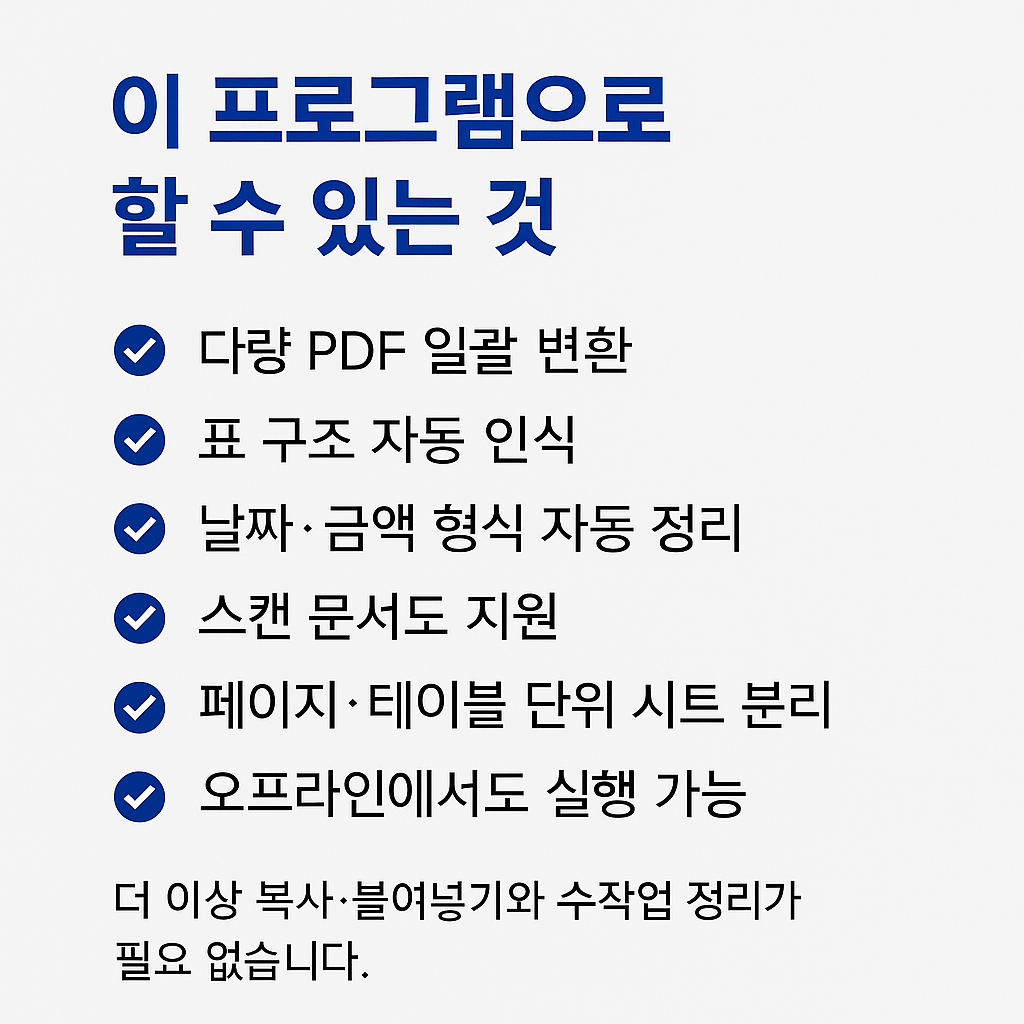 무료 테스트 제공PDF 1~2개 보내주시면변환 가능 여부와 권장 설정을 먼저 안내드립니다.작업 전 샘플 결과 제공수정 1회 포함표 구조 최대한 유지PDF 표 때문에 시간 버리고 계신가요?PDF를 엑셀로 옮기면셀 다 깨지고정렬 틀어지고OCR PDF는 복사도 안 되는그 상황, 이제 끝내세요.제공 기능클릭 1번으로 엑셀 파일 자동 변환PDF 표 구조 최대한 유지숫자 / 날짜 자동 인식여러 PDF 파일 일괄 처리변환된 엑셀은 바로 제출 가능한 형태OCR PDF도 지원합니다.사용 전 확인모든 PDF가 100% 동일하게 변환되지는 않습니다그래서 무료 테스트를 먼저 진행합니다가능 여부 확인 후 작업 진행합니다이런 분께 적합합니다세무·행정 영수증 정리카드 매출표 / 거래내역 정리스캔 문서 PDF 엑셀화반복 보고서 자료 정리 주문 후 안내 메시지 발송프로그램 다운로드 링크, 실행 영상 링크, 간단 설치 안내 제공 프로그램 실행PDF 변환할 파일 또는 폴더 선택옵션(자동/페이지/테이블, 품질, 행 인식 등) 설정 PDF 엑셀 변환 진행버튼 1회 클릭으로 자동 변환여러 개의 PDF도 일괄 처리 가능 결과 확인변환된 엑셀 파일 저장 위치 안내정상 변환 확인실제 변환 결과 예시 보기 문제 발생 시 지원PDF 일부가 깨지거나 표가 어긋날 경우옵션 추천 또는 해결 방법 안내 업데이트 제공기능 개선 또는 오류 수정 발생 시 무상 제공구매 전에 테스트가 필요하신 경우PDF 1개 보내주시면 변환 가능 여부와가장 적합한 설정값을 안내해드립니다. 1️⃣ 변환할 PDF 파일 (1개 또는 여러 개)표(테이블)가 포함된 PDF라면 대부분 변환 가능합니다.PDF가 스캔본(사진)일 경우기본 DPI(해상도)가 200 이상이면 인식률이 더 좋습니다비밀번호 걸린 PDF손글씨·이미지 기반 표문서 여백이 심하게 틀어진 PDF(이 경우 변환 전에 샘플 테스트 먼저 진행해드립니다.)PDF 1개 보내주시면변환 가능 여부추천 설정값기대 결과물3가지 항목을 안내해드립니다.2️⃣ Windows PC (윈도우 환경 전용)프로그램은 exe 실행형이며 설치 필요 없습니다.3️⃣ 저장 위치(폴더)만 준비변환된 엑셀 파일이 저장될 경로만 지정하시면 됩니다.