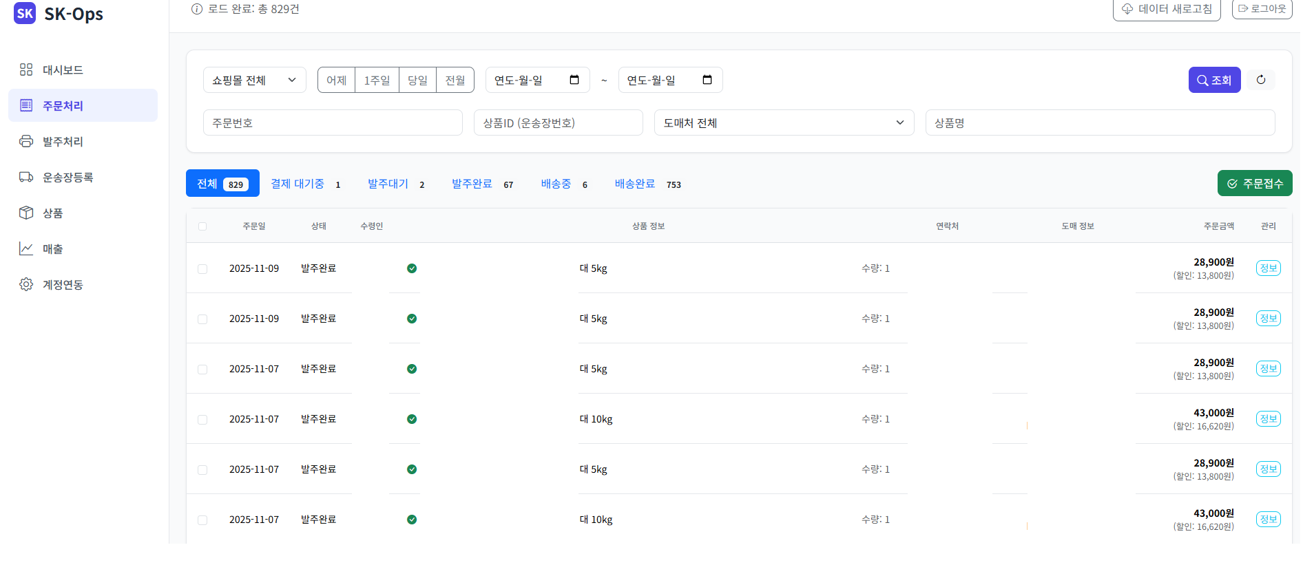개발 배경단순히 주문 내역을 긁어오는 스크립트를 넘어, 실제 업무 흐름 전체를 개선할 수 있는 시스템 입니다. 쿠팡의 공식 Open API를 활용하여 안정적으로 데이터를 연동하고, 주문 처리부터 발주, 운송장 등록까지의 과정을 하나의 대시보드에서 유기적으로 관리할 수 있습니다.주요 기능이 시스템은 다음과 같은 핵심 기능들을 통해 판매자의 업무 효율을 극대화합니다.기능설명 사용자 인증 시스템안전한 로그인을 통해 여러 사용자가 자신만의 데이터를 관리할 수 있습니다. 쿠팡 API 연동 주문 수집버튼 클릭 한 번으로 설정된 기간의 모든 주문을 쿠팡 서버에서 직접 가져옵니다. 상품 자동 매칭쿠팡의 상품 코드를 내부 상품 DB와 매칭하여, 판매된 상품의 원가를 자동으로 연결합니다.🧾 발주 자동화 (엑셀 생성)매칭된 상품 정보를 기반으로, 거래처별 발주 양식에 맞춰 엑셀 파일을 자동으로 생성하고 발주 완료 처리합니다. 운송장 일괄 등록엑셀 파일을 업로드하면 수령인/연락처를 기준으로 주문을 찾아 운송장 번호를 자동으로 입력하고 쿠팡에 전송합니다. 매출/수익 대시보드수집된 데이터를 바탕으로 매출, 비용, 순이익 등의 핵심 지표를 시각화하여 한눈에 파악할 수 있습니다.🧰 기술 스택Backend: Flask (Python), SQLAlchemyFrontend: HTML, CSS (Bootstrap), JavaScript (Vanilla), Chart.jsDatabase: SQLiteAPI: Coupang Open API (HMAC 인증) 1️⃣ 메인 대시보드 주문 현황과 매출 추이를 한눈에 볼 수 있습니다. 2️⃣ 주문 처리 및 상품 매칭 수집된 주문을 상태별로 필터링하고, 판매 상품을 내부 원가DB와 매칭합니다. 3️⃣ 운송장 엑셀 일괄 등록 엑셀 업로드만으로 수십, 수백 건의 운송장 정보를 한 번에 입력할 수 있습니다. 의뢰 후 1:1 채팅을 통해 현재 주문/발주/운송장 관리 방식을 구체적으로 파악합니다.쿠팡 API 연동을 위한 계정 정보(Access Key, Secret Key) 및테스트용 샘플 데이터를 요청드립니다.필요한 기능(예: 자동 발주 양식, 거래처별 분류, 수익 계산 방식 등)을정리하고 개발 범위를 확정합니다.결제 전, 무료로 기본 상담 가능합니다.“의뢰인의 실제 업무 흐름에 맞춘 실용적인 자동화 툴”단순히 데이터를 가져오는 코드가 아닌,현업 효율을 극대화하는 통합 솔루션을 만들어드립니다. 1. 쿠팡 파트너 계정 및 Open API 인증 정보2. 내부 상품 데이터 (원가 DB용)3. 발주 양식 또는 거래처별 엑셀 포맷