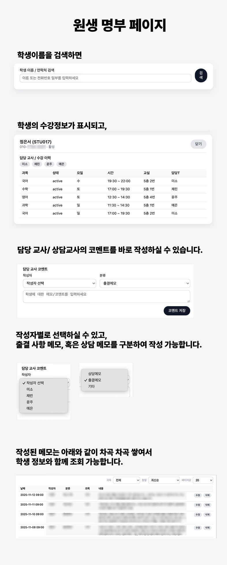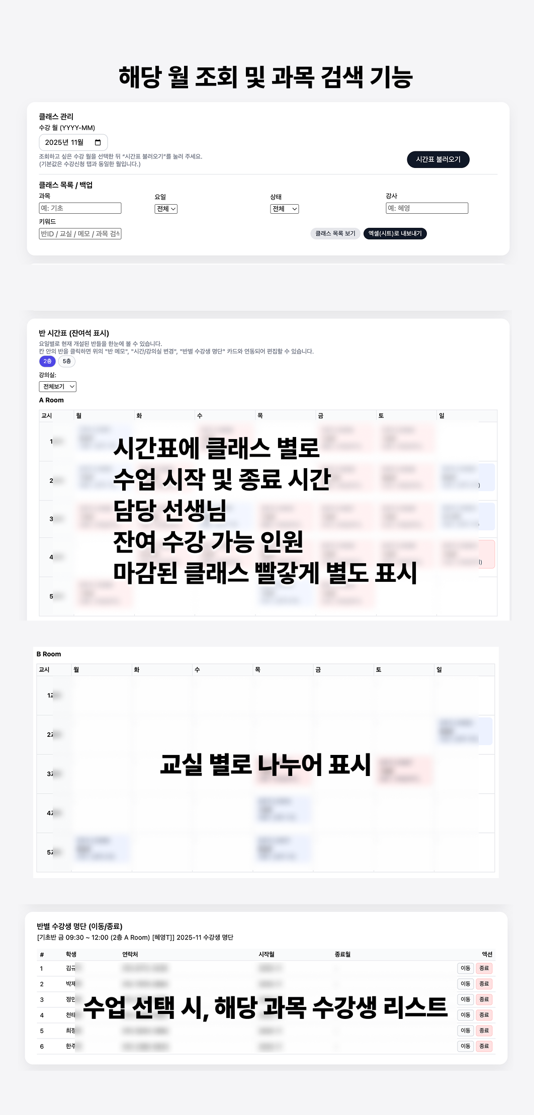 원생·시간표·교사 관리까지 한번에학원 운영 자동화를 위한 All-in-One 관리 시스템 구축 서비스학원 규모가 커질수록출결, 시간표, 상담 기록, 교사 스케줄, 반 편성 같은 기본 운영 업무가 기하급수적으로 늘어나서 많이 힘드셨을 거예요.엑셀 · 카톡 · 종이로 관리하다 보면 누락, 실수, 중복이 반복되고요.이 서비스를 통해 원장님 학원에 완전히 맞춘 전용 관리 시스템을 구축해드립니다.기존에 존재하던 툴이 아니라, 원장님 학원의 운영 방식을 기준으로 설계하는 커스텀 SaaS 형태입니다.1. STANDARD학원 운영의 기초를 체계화하고 싶은 분에게 적합합니다.주요 기능• 원생 관리• 시간표 관리• 상담 기록 관리• 검색과 상담 기록 조회가 가능한 원생 명부• 교실별·층별·반별 관리가 가능한 시간표적합 대상– 기본적인 원생/출결/시간표 관리가 필요할 때– 기존 엑셀 관리에서 벗어나 시스템을 구축하고 싶은 학원2. DELUXESTANDARD 기능 + 교사 인력 관리까지 필요한 경우.주요 기능• 원생 관리• 시간표 관리• 교사 근태 관리• 출결 + 상담 기록 관리• 학원생 명부• 교실별·층별·반별 관리가 가능한 시간표• 교사별 근무 일정·스케줄 관리적합 대상– 5인 이상 강사진– 반편성이 자주 변경되는 학원– 상담 기록과 출결을 함께 관리해야 하는 경우3. PREMIUMDELUXE 기능 + 평생 유지보수 포함주요 기능• DELUXE 패키지의 모든 기능• 시스템 평생 유지보수 포함(기능 수정, 운영 중 발생 문제 대응, 최적화 조정 등)적합 대상– 내부 전담 개발자가 없거나– 학원 운영이 빠르게 확장되고 있어 관리 시스템을 지속적으로 개선해야 하는 경우– 장기적으로 안정된 시스템을 원할 때 작업 방식1. 현재 학원 운영 구조 파악 (원생, 반편성 방식, 시간표 구조, 교사 스케줄 등)2. 자동화 로직 개발 및 연결3. 내부 테스트 & 리비전4. 최종 구축 후 사용 매뉴얼 전달 1. 학원 기본 정보 부탁드립니다.과목, 원생 수, 분반 등3. 시스템에서 반드시 필요한 기능을 알려주세요. • 시간표 구조 • 원생 정보에 포함해야 하는 항목4. 시간표·반편성 구조• 교실 수 • 층별/반별 구성 방식 • 요일·시간대별 수업 운영 방식 • 반 변경이 잦은지 여부5. 내부 운영 프로세스 • 교사 스케줄 관리 방식 • 상담 기록을 누구(원장/강사)가 입력하는지