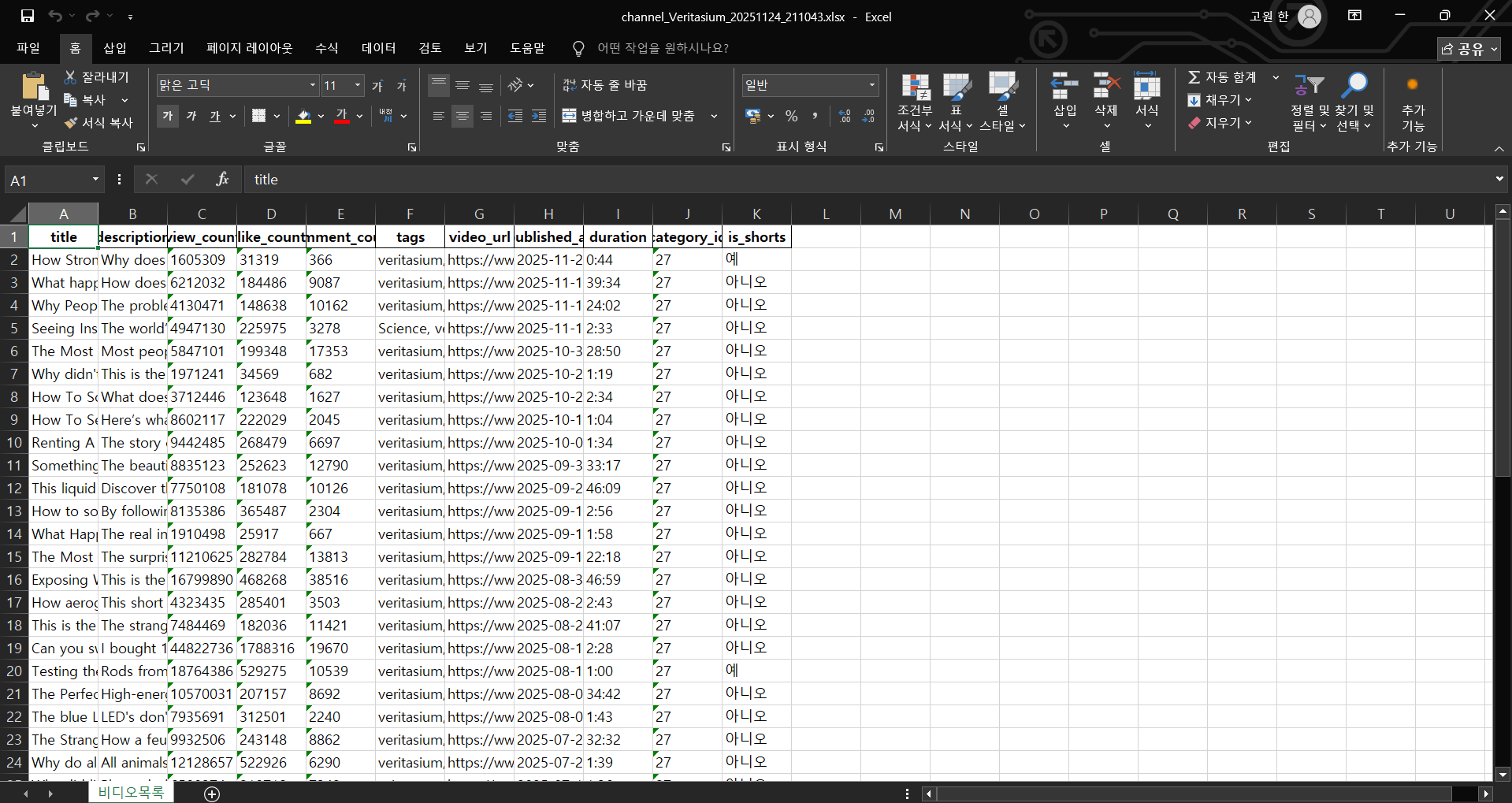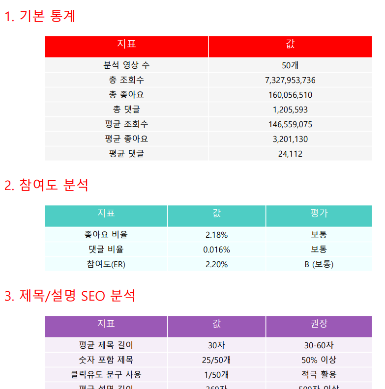 원하시는 유튜브 채널의 영상 데이터를 추출하여 엑셀 파일로 제공해드립니다!분석, 리포트 제작, 콘텐츠 전략 수립 등 다양한 용도로 활용하실 수 있습니다.추출 가능한 영상 데이터 항목은 다음과 같습니다title (제목)description (설명)view_count (조회수)like_count (좋아요 수)comment_count (댓글 수)tags (태그 목록)video_url (영상 링크)published_at (업로드 날짜)duration (영상 길이 – 읽기 쉬운 형식)category_id (카테고리)is_shorts (Shorts 여부)필요하신 경우, 추가적인 분석 옵션도 함께 제공해드립니다!분석 옵션의 경우 다음 분석 결과를 PDF 파일로 제공합니다.1.기본 통계총 영상 수, 조회수, 좋아요, 댓글평균 조회수/좋아요/댓글2. 참여도 분석좋아요 비율, 댓글 비율참여도(ER) + 등급 (S/A/B/C)3. SEO 분석평균 제목/설명 길이숫자/클릭유도 문구 사용 비율해시태그 사용 비율Shorts 영상 비율4. 시각화 차트조회수 분포 히스토그램참여 유형 파이 차트TOP 5 영상 바 차트5. TOP 5 영상조회수 TOP 5참여도 TOP 5 1. 원하시는 유튜브 채널의 링크를 보내주세요2. 추출된 영상 데이터의 엑셀파일 , (PDF 파일)을 보내드립니다 ;) 영상 데이터 추출을 위한 유튜브 채널의 링크를 보내주세요 !