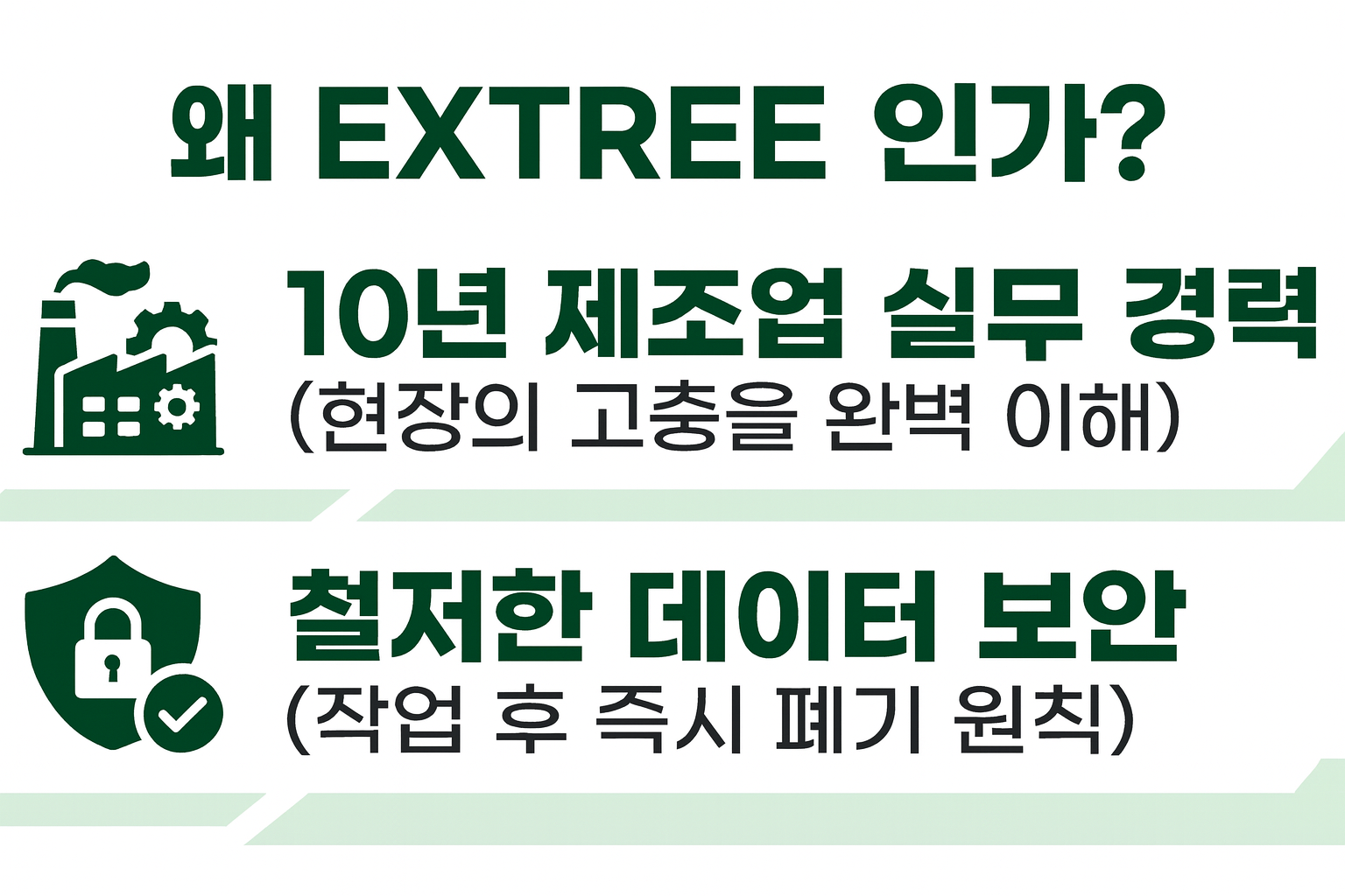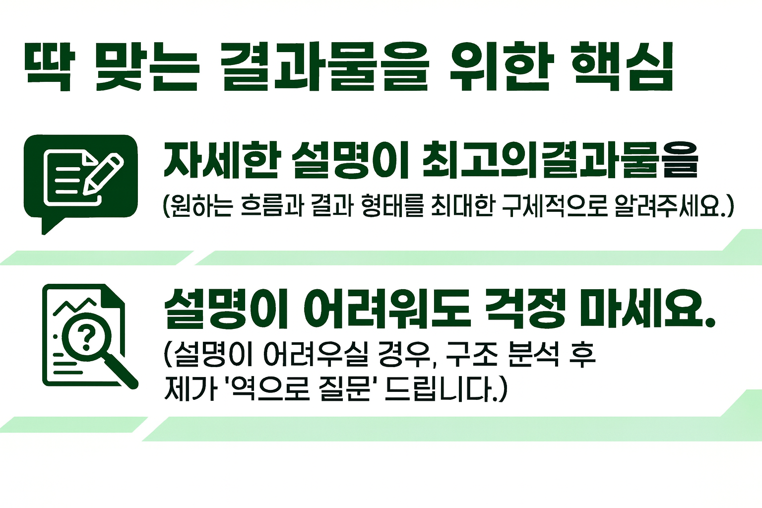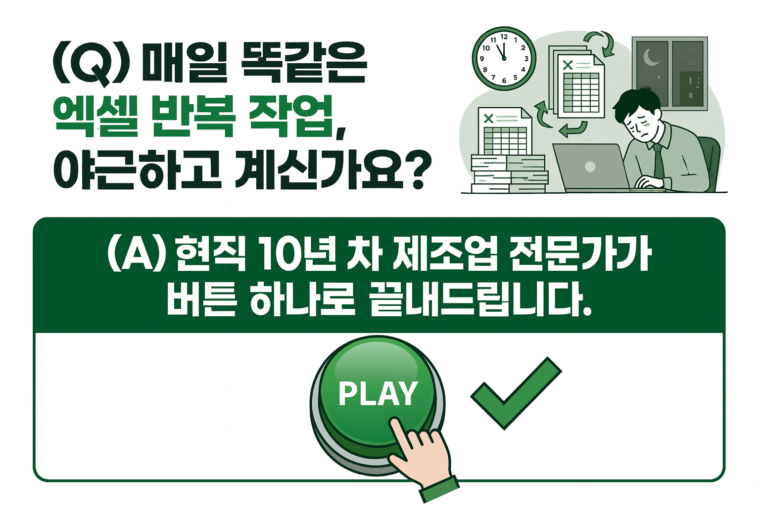 반복적인 수작업, 시간이 오래 걸리는 정리 작업, 조건이 복잡한 보고서 작성 등업무 흐름을 방해하는 부분을 VBA/엑셀 자동화로 최적화해드립니다.10년 이상 제조업 공정·데이터·스케줄 관리 환경에서 실제 자동화를 개발해온 경험을 기반으로,실무에서 바로 사용할 수 있는 안정적이고 유지보수가 쉬운 자동화 기능을 제작합니다.엑셀 파일 하나만으로도 해결할 수 있는 업무가 정말 많습니다.현재 업무에서 “이것만 자동화되면 훨씬 편할 텐데…”라고 느끼신 적이 있다면 편하게 문의 주세요.업무 시간을 줄이고 더 중요한 일에 집중하실 수 있도록 도와드리겠습니다.※ 단순 기능부터 복잡한 구조까지 모두 가능합니다.※ STANDARD의 문서 생성 기능은 단순 시트 복사·저장 등 기본 기능에 한합니다.※ 정확한 작업 범위 확인을 위해 결제 전 꼭 문의 부탁드립니다. 1. 문의 - 자동화가 필요한 업무 흐름 또는 예시 파일을 보내주시면 검토를 시작합니다.2. 검토 및 설명 - 기능 구조를 파악한 뒤 가능한 해결 방식과 작업 범위를 안내드립니다.3. 견적 및 기간 안내 - 범위 확정 후 정확한 금액과 예상 작업 기간을 안내드립니다.4. 작업 진행 - VBA 개발 및 테스트를 진행하고, 실제 업무 환경에서 문제없이 동작하도록 검증합니다.5. 전달 및 확인 - 작업물을 전달드리고, 정상적으로 작동하는지 확인해드립니다.6. 피드백 및 수정 - 패키지에 포함된 횟수 내에서 필요한 수정사항을 반영합니다. - 코드 오류에 의한 수정은 횟수 차감이 없습니다.7. 구매 확정 - 모든 과정이 완료되면 구매 확정으로 마무리됩니다. 작업 요청 시 필요한 정보작업에 사용할 엑셀 파일 또는 샘플 데이터자동화되었으면 하는 작업 흐름 설명원하는 결과 형태 (예시 화면, 표, 출력 방식 등)※ 자세히 설명해주실수록 업무에 딱 맞는 자동화 기능 제작이 가능합니다.※ 설명이 부족해도 괜찮습니다. 전달해주신 자료를 기반으로 제가 구조를 먼저 파악하고, 필요한 부분은 추가로 질문드리겠습니다. 편하게 말씀해 주세요. 데이터 보안 안내절대 비밀 보장: 작업 과정에서 전달받은 파일·데이터는 작업 완료 후 즉시 안전하게 폐기합니다.외부 유출 0% 원칙: 의뢰인의 동의 없이 외부 공유·보관·포트폴리오 사용은 절대 없습니다.안심 의뢰: 보안이 걱정되신다면, 민감 정보가 가려진 ‘샘플 파일’로도 충분히 제작 가능합니다.(보안이 중요한 제조업 환경에서 10년 이상 실무 경험으로 익힌 철저한 보안 기준을 준수합니다)
