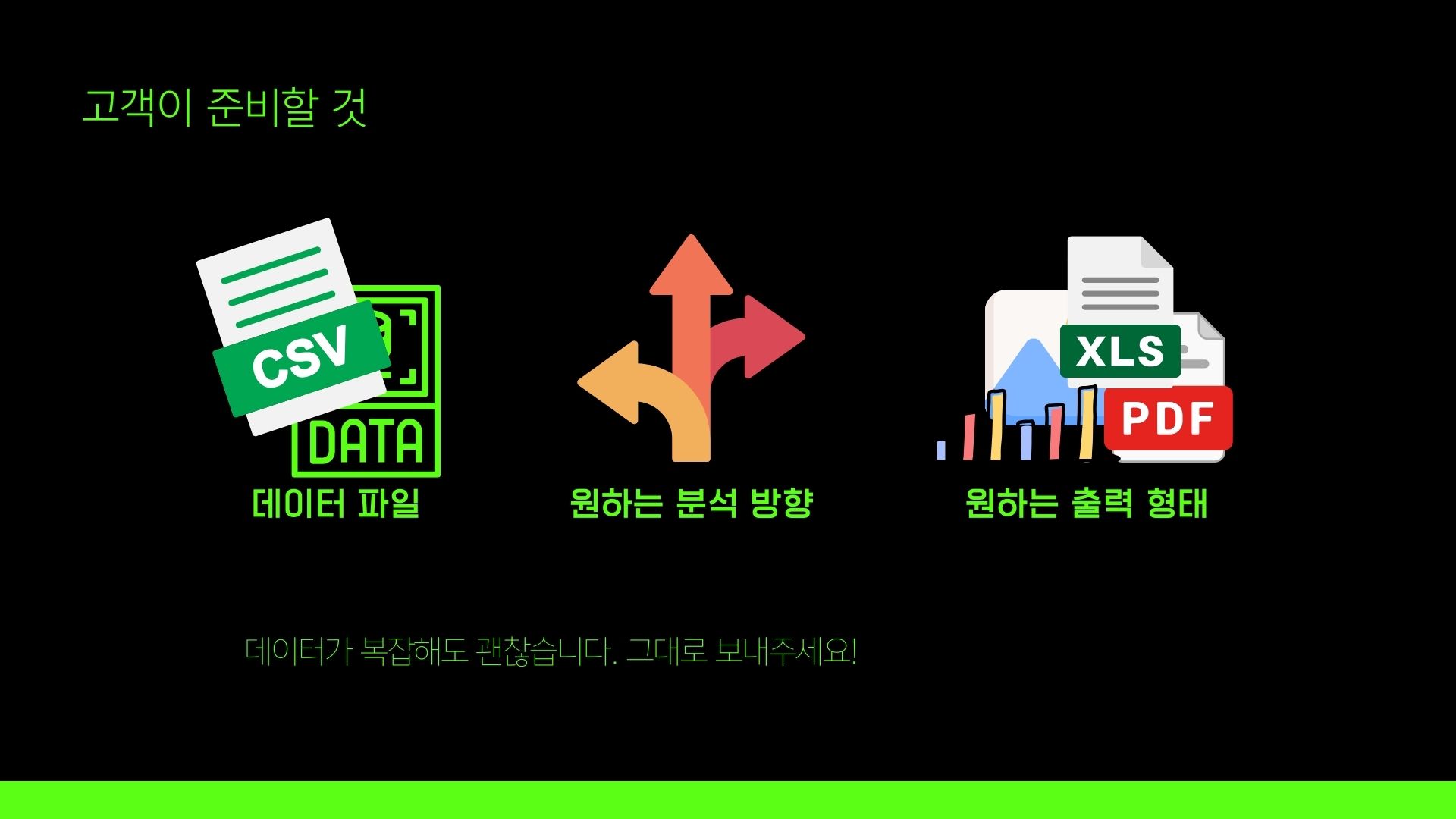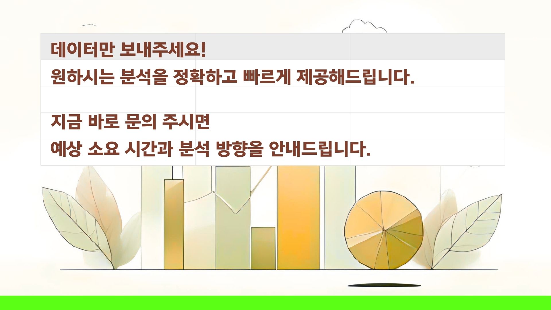 CSV·엑셀 데이터를 정확하고 빠르게 정리·분석해드립니다.누락값 및 중복 제거, 형식 통일, 여러 파일 병합, 기초 통계 분석,그래프·차트 시각화까지 업무에 필요한 모든 데이터 작업을 제공합니다.또한 반복되는 업무를 자동화할 수 있는 Python 스크립트 제작도 가능합니다.데이터만 보내주시면 가장 효율적이고 깔끔한 분석 결과를 전달드립니다.초보자도 이해할 수 있도록 명확한 설명과 함께 작업해드립니다 1) 의뢰 상담 - 파일 확인 및 작업 범위 안내 - 필요한 분석 방향 확인2) 파일 전달 - CSV 또는 엑셀 파일 업로드 - 필요 시 예시 서식 전달3) 분석 및 전처리 작업 - 형식 통일, 중복 제거, 누락값 처리 - 통계 분석 및 시각화 옵션 적용4) 결과물 전달 - 정리된 파일 / 그래프 / PDF 보고서(옵션) - 자동화 스크립트 제공(고급 옵션 시)5) 수정 반영 - 1회 기본 수정 포함 - CSV 또는 엑셀 파일 원본 - 원하는 분석 방향 or 샘플 결과물 - 특정 규칙이 있다면 텍스트로 정리 - 필요한 출력 형태(엑셀/CSV/PDF/이미지) - 마감 기한데이터가 엉켜 있거나 복잡해도 괜찮습니다.있는 그대로 보내주셔도 분석 가능합니다.