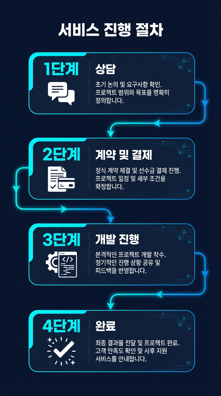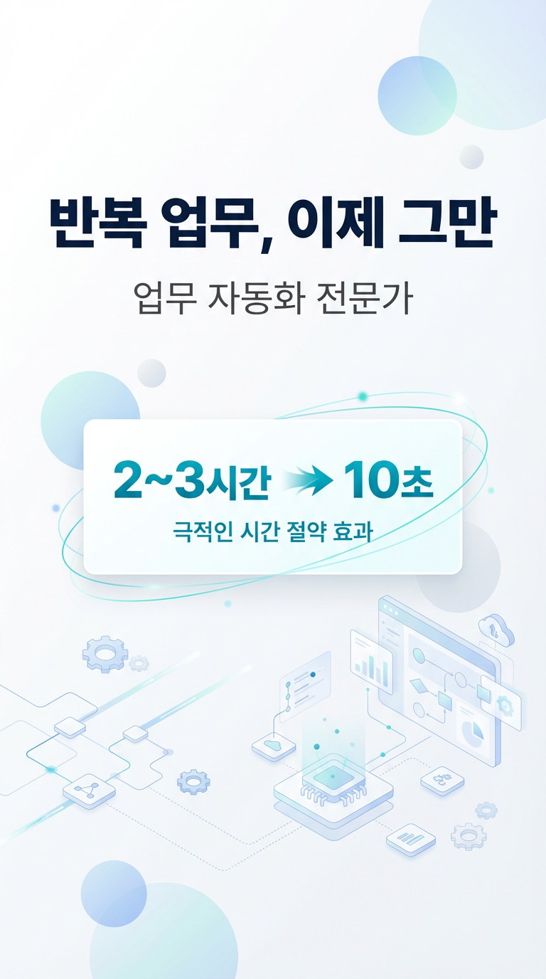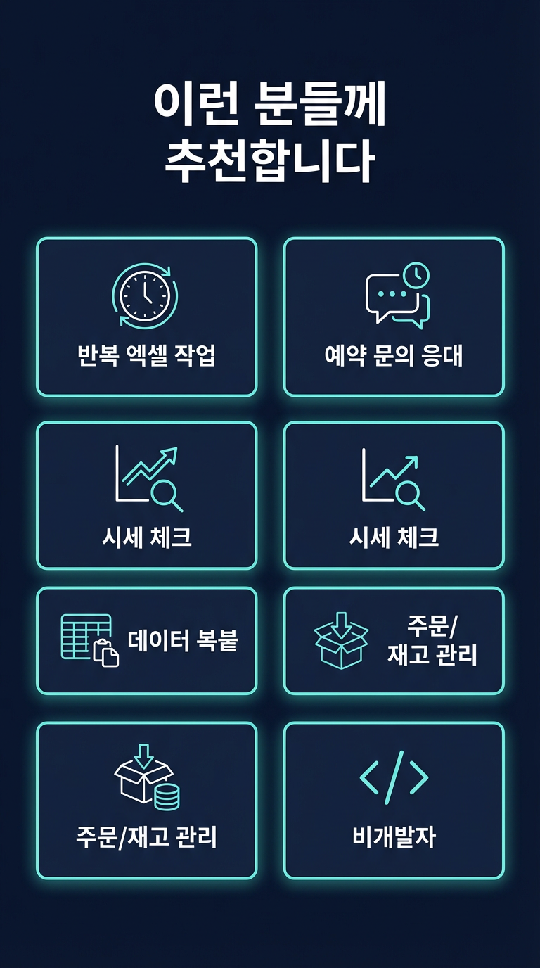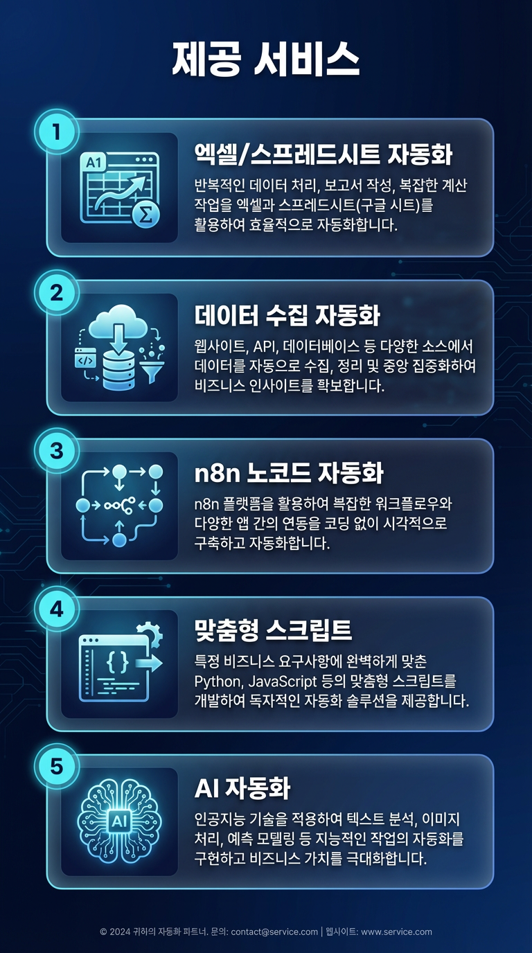 [공지] 오픈 베타 기념 선착순 50% 파격 할인 이벤트현재 더 많은 성공 사례와 포트폴리오를 확보하기 위해 한시적으로 오픈 베타 가격을 적용하고 있습니다. 3년 차 현직 백엔드 개발자의 고퀄리티 자동화 시스템을 기존 대비 50% 이상 할인된 금액으로 경험해 보세요!기간: 포트폴리오 10건 확보 시 종료 (종료 후 정상가 전환 예정)대상: 신규 문의 고객 선착순STANDARD 정상가 80,000 -> 39,000원DELUXE정상가 260,000 -> 129,000원PREMIUM정상가 1,300,000 -> 620,000원이런 분들께 추천합니다* 매일 반복되는 엑셀 작업으로 2~3시간을 낭비하시는 분* 자영업자로 예약 문의 반복에 지치신 분* 주식·코인 등 시세를 매일 체크해야 하는 분* 여러 사이트 데이터를 일일이 복사/붙여넣기 하시는 분* 쇼핑몰 주문/재고 관리에 시간을 뺏기시는 분* 프로그래밍은 모르지만 업무를 자동화하고 싶은 분이 외에도 “이거 자동화 가능할까?” 싶은 건 무엇이든 편하게 문의하세요.방법은 대부분 존재합니다.다수의 AI 챗봇, 자동화 시스템, 데이터 연동, 대규모 트래픽 프로젝트를 구축해왔습니다.주요 경력AI 기반 챗봇/업무 자동화 시스템 실무 구축여러 플랫폼 API 연동 및 대규모 데이터 처리 경험실시간 다양한 마켓 시세 수집 및차별점1:1 맞춤 상담으로 상황에 꼭 맞는 자동화 설계비개발자도 쉽게 사용할 수 있는 UI/매뉴얼 제공유지보수·확장 가능한 구조로 제작제공하는 서비스 엑셀 / 스프레드시트 자동화여러 파일 자동 병합/정리데이터 가공·변환·계산조건부 필터링·분류정기 리포트 자동 생성Google Sheets API 연동예시“매일 10개 부서에서 받는 엑셀을 합쳐 보고서 만드는 작업”버튼 하나로 10초 만에 완성 데이터 수집 자동화경쟁사 가격 및 상품 정보 수집SNS·리뷰 데이터 수집정기 업데이트 + 알림 기능 제공예시“경쟁사 5개 쇼핑몰 가격을 매일 체크해야 하는 작업”매일 아침 자동으로 엑셀로 정리 n8n 기반 노코드 자동화시각적인 플로우 기반 업무 자동화여러 앱/서비스 간 자동 연동조건 분기·스케줄링직접 수정 가능한 워크플로우 전달예시“구글폼 응답 슬랙 알림 구글시트 저장 이메일 발송”모든 과정이 자동으로 진행지원 연동Google(시트/드라이브/Gmail/캘린더) / Slack / Discord / Telegram네이버 / 카카오 API / 스마트스토어 / 쿠팡 등 맞춤형 자동화 스크립트 / 프로그램개인 예약 사이트 자동화문의·고객응대 챗봇이메일 자동화데이터베이스 및 API 통합운영 프로세스 전반 자동화 구축예시"본인 플랫폼에 링크 추가 -> 해당 예약사이트 이동 -> 예약 및 챗봇 처리-> 사장님께 알람 전달"모든 과정이 자동으로 진행 AI 자동화 (고급)ChatGPT·Claude API 활용자동 요약/번역/분석AI 챗봇 제작맞춤형 AI 워크플로우 구축연동 가능 서비스구글 전 서비스(시트·드라이브·Gmail)Slack / Discord / Telegram네이버 API / 카카오 API스마트스토어 / 쿠팡 / 11번가OpenAI / Anthropic / Google 등 다양한 AI API작업 전 꼭 확인해주세요상담 후 기술적 실현 가능성을 먼저 검토합니다API 사용 시 추가 비용이 발생할 수 있으며 사전 안내해드립니다 1단계: 상담요청사항 전달필요시 보이스 상담 (Discode)상담 내용:자동화 가능 여부 확인기술적 실현 가능성 검토예상 작업 기간 및 비용 안내최적의 솔루션 제안산출물:간단한 작업 계획서 (메시지)예상 소요 시간추천 패키지만족하시면 구매 진행2단계: 계약 및 결제[구매 시작]진행 방법:적합한 패키지 선택 후 결제결제 완료 즉시 작업 시작 작업 착수3단계: 개발 진행[작업 중]중간 보고:방향성 확인 및 피드백 수렴필요시 조정소통 방식:크몽 메시지 상시 확인 (평일 1시간 이내 답변)중요한 확인사항은 보이스 미팅진행 상황 주기적 업데이트고객 확인:기능 확인수정 요청 (무료 수정 범위 내) 최종 개발 진행 4단계: 완료[작업 완료]제공 항목:완성된 자동화 스크립트/프로그램상세 사용 매뉴얼설치 파일 또는 실행 파일n8n 워크플로우 JSON (해당시)테스트:의뢰인 환경에서 직접 테스트문제 발생시 즉시 수정완벽한 작동 확인교육 (패키지별 상이):스탠다드: 문서 가이드듀렉스: 30분 화면 공유 교육프리미엄: 1~2시간 화면 공유 교육 최종 확인 및 수정 요청추가 문의 언제든 환영리뷰 부탁드립니다 상담 전 준비사항1. 자동화하고 싶은 작업 설명현재 어떤 작업을 하고 계신가요? 얼마나 자주 하시나요? (매일/매주/매월) 보통 얼마나 시간이 걸리나요?2. 샘플 자료 (있다면) 현재 사용 중인 엑셀 파일 참고할 만한 문서/이미지3. 원하시는 결과물 어떤 형태를 원하시나요? (엑셀/시트/파일/이메일 등) 어떻게 실행하고 싶으신가요? (버튼 클릭/자동 스케줄/수동 실행)4. 작업 환경 사용 OS: Windows / Mac사용 중인 프로그램 (있다면) 클라우드 사용 여부 (구글/AWS 등) 이렇게 문의 주시면 더 빨라요!예시:---------[자동화 희망 작업]매일 아침 10개 엑셀 파일을 열어서특정 데이터만 복사해서 하나의 파일로 만듭니다.[현재 소요 시간]매일 1~2시간[원하는 결과]버튼 하나만 누르면 자동으로 합쳐지면 좋겠어요.[환경]Windows 11, 엑셀 2019 사용중---------필수 확인사항계정/권한 관련: API 사용시 API 키 발급 필요 구글 시트 연동시 구글 계정 권한 설정 필요법적 확인: 