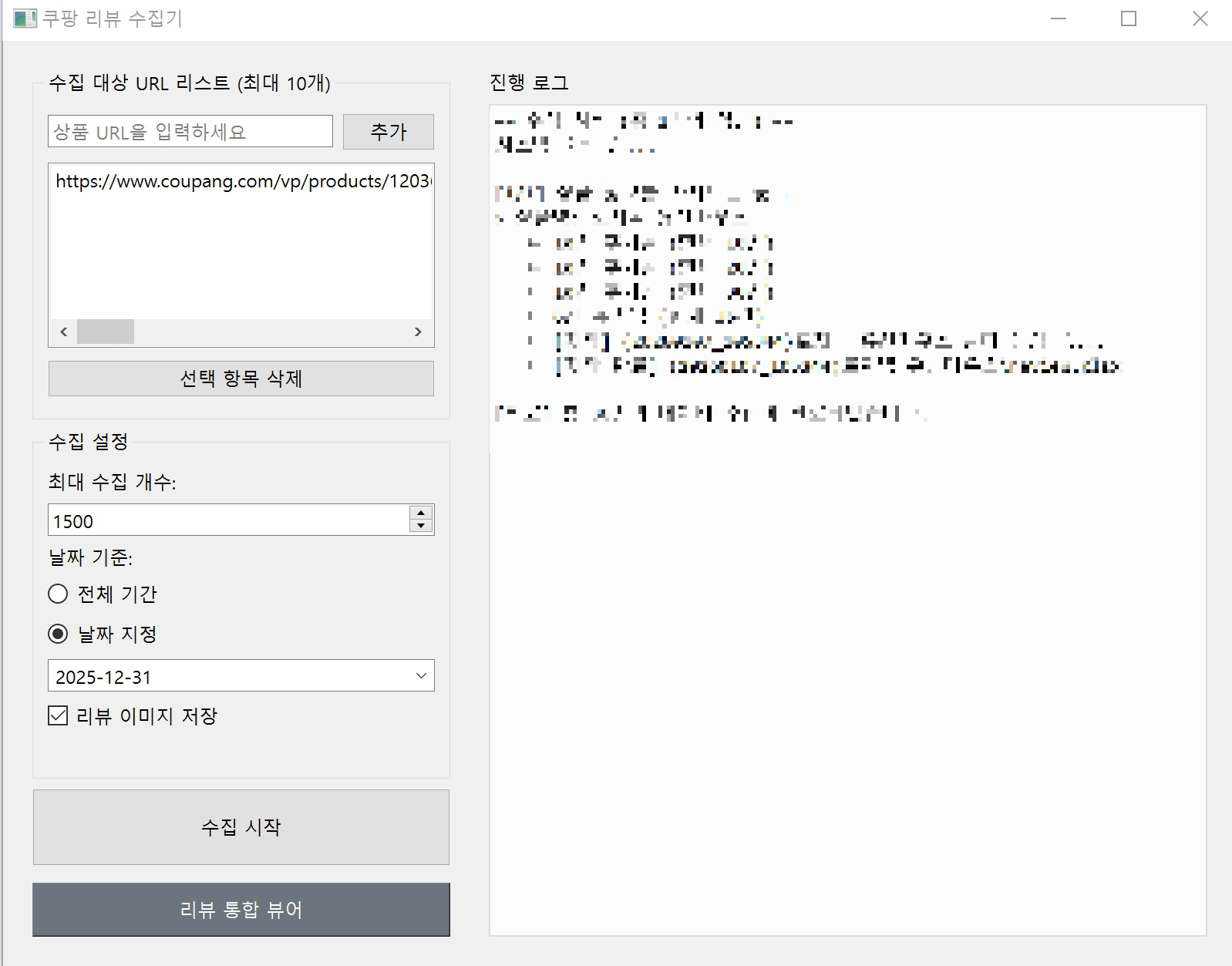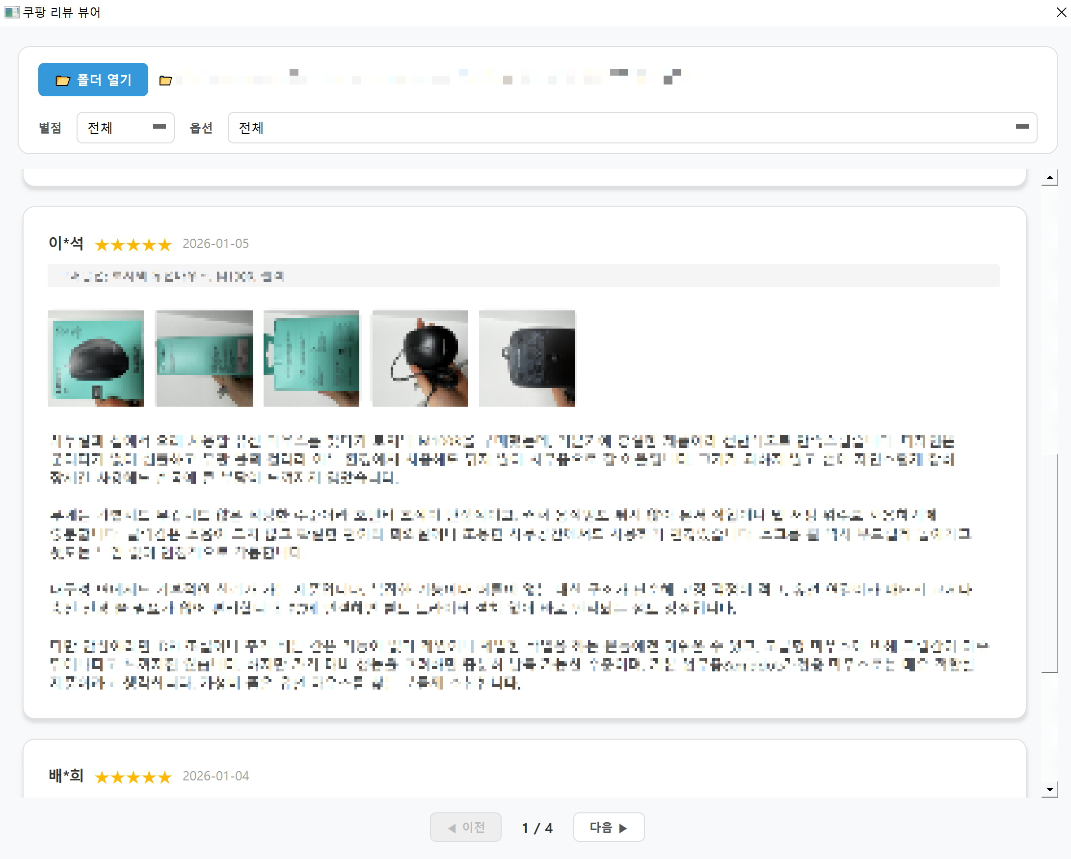 [쿠팡 전용] 클릭 한 번으로 끝내는 상품 리뷰 & 이미지 추출기"시장 조사를 위해 수천 개의 리뷰를 일일이 복사하고 계신가요?""리뷰 이미지만 따로 저장하느라 업무 시간이 부족하시진 않나요?"이제 단순 반복 작업은 프로그램에 맡기고, 여러분은 더 중요한 '전략 기획'에만 집중하세요!쿠팡의 상품 URL만 입력하면 별점부터 내용, 이미지 파일까지 엑셀로 깔끔하게 정리해 드립니다.주요 기능 및 특징다중 URL 지원: 한 번에 최대 10개의 상품 링크를 입력하여 연속 수집이 가능합니다.이미지 일괄 다운로드: 리뷰에 첨부된 실사용 이미지 수집별점별 맞춤 리뷰 수집: 1점(불만족)부터 5점(최고)까지 특정 별점만 선택하여 따로 모아볼 수 있습니다.통합 뷰어 제공: 엑셀뿐만 아니라 전용 뷰어를 통해 수집된 리뷰를 한눈에 검토할 수 있습니다.전문가의 약속단순히 판매하고 끝내지 않습니다. 쿠팡의 로직 변경이나 업데이트 상황에 맞춰 향후 무료 업데이트를 지속적으로 지원해 드릴 것을 약속드립니다.2026년 1월 기준 최신 로직으로 완벽하게 동작 검증을 마쳤습니다.지금 바로 문의해 주세요! 여러분의 소중한 시간을 10배로 아껴드리겠습니다. 서비스 제공 절차결제 및 프로그램 발송: 결제 확인 후 실행 파일을 즉시 전달합니다.동작 검증: 구매자님의 PC 환경에서 프로그램이 정상 작동하는지 확인합니다.최종 확정: 작동 이상 무 확인 후 구매 확정을 진행합니다. (※ 작동 불가 시 100% 환불 보장) 의뢰인 준비사항쿠팡 상품 링크(URL): 추출을 원하시는 상품의 주소만 준비해 주세요.윈도우 OS 환경: 본 프로그램은 Windows 환경에 최적화되어 있습니다.