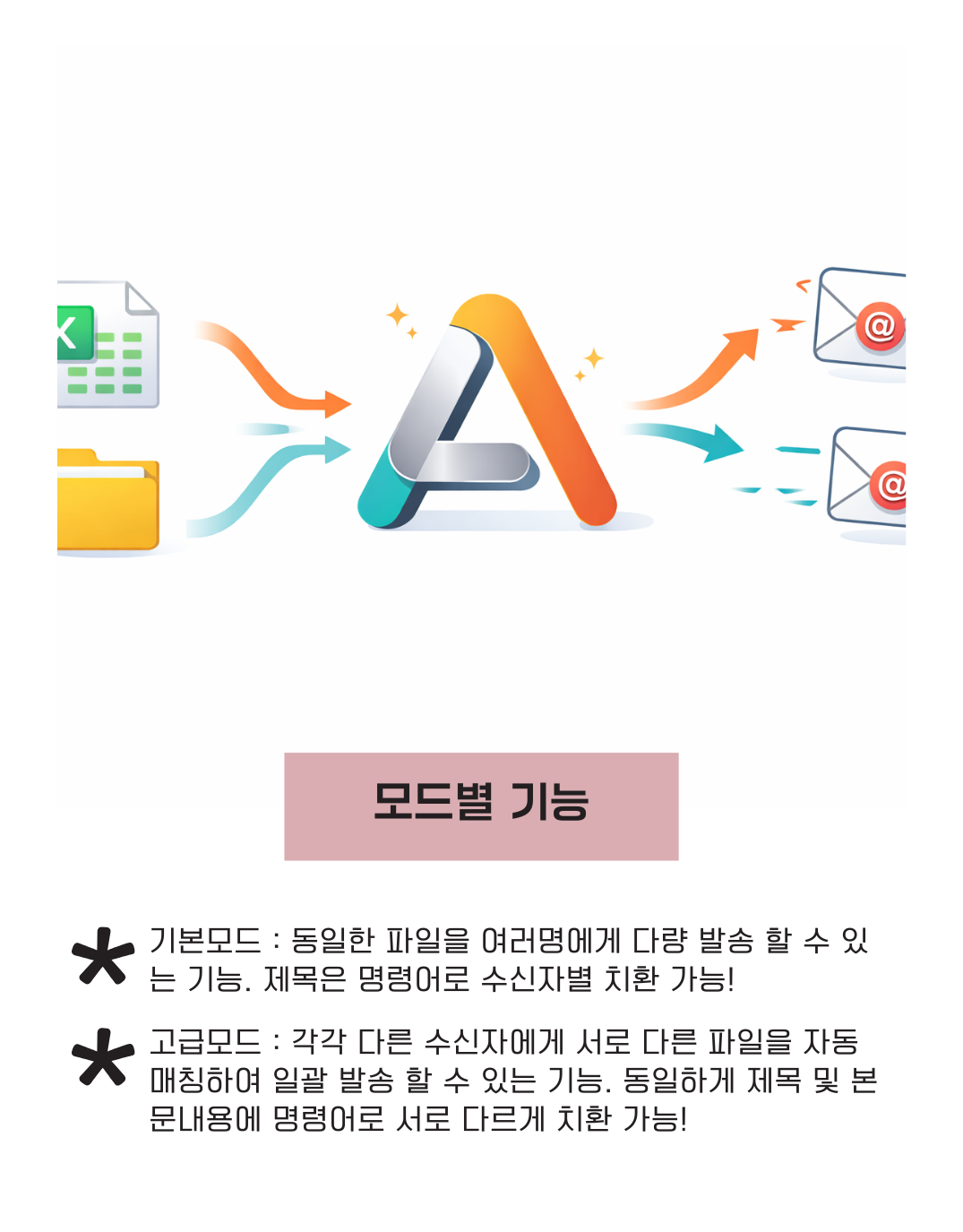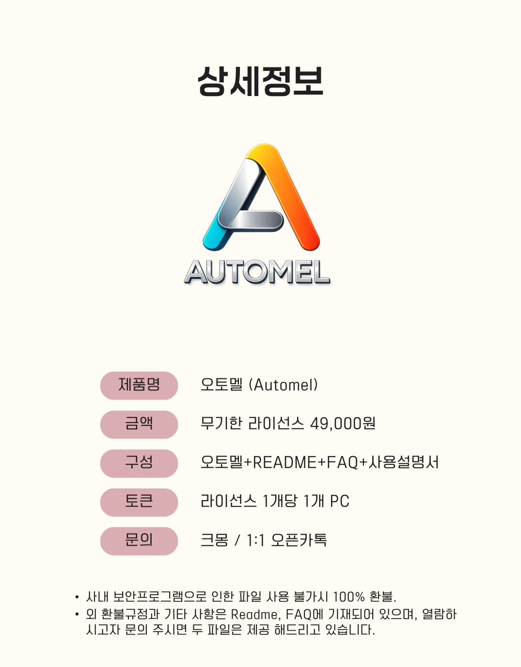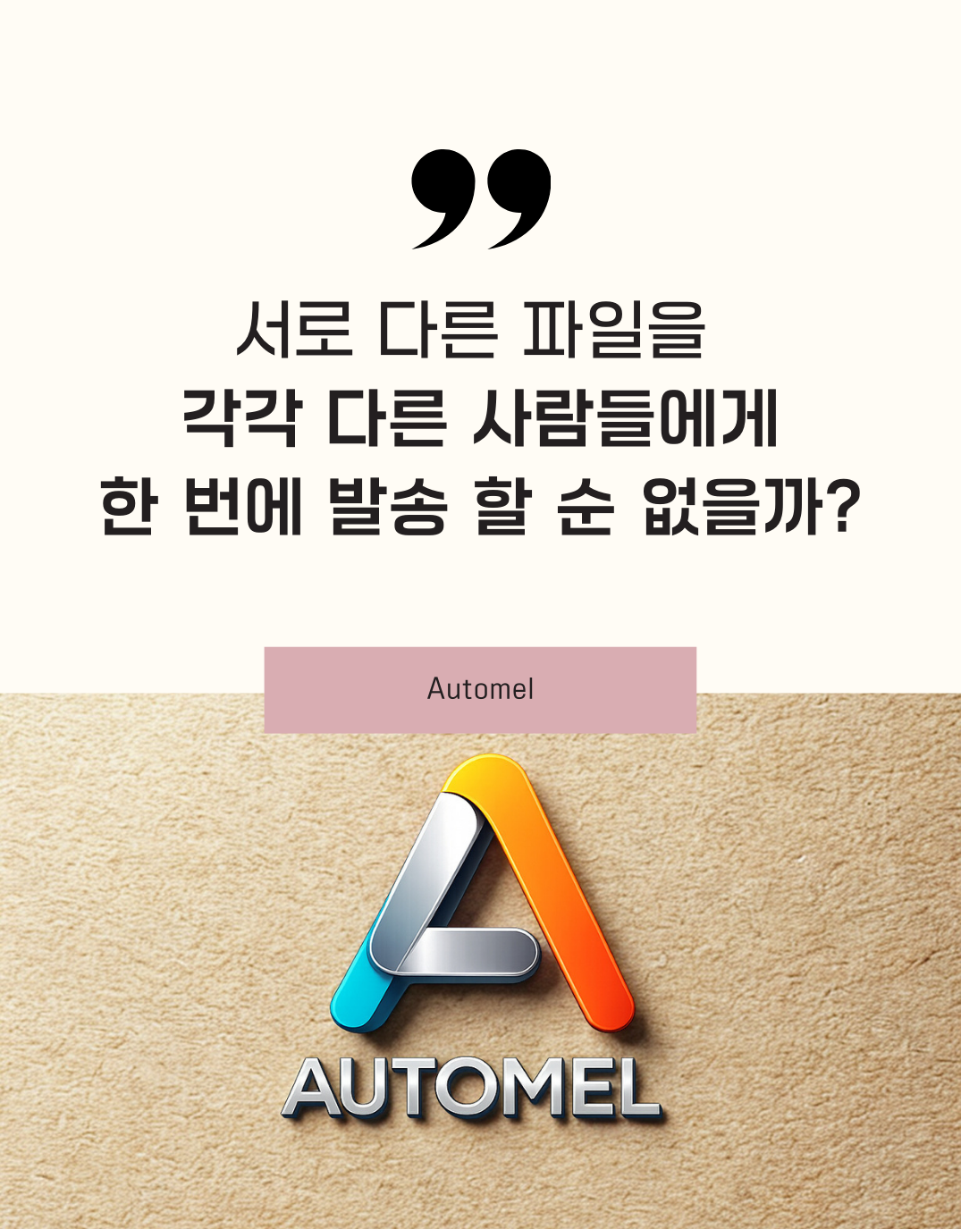 오토멜(AutoMel)은각기 다른 파일을 자동으로 매칭하여거래처별 정산, 견적서, 제안서, 급여명세서 등 메일을 한 번에 발송할 수 있는업무 자동화 프로그램입니다.매달 반복되는 메일 발송 업무,엑셀 파일을 하나씩 나눠 첨부하고메일을 개별로 보내느라 번거로우셨다면오토멜로 간단하게 해결할 수 있습니다.[주요 기능]- 엑셀 파일 자동 분석 및 데이터 매칭- 수신자별 파일 자동 분리- 개인별 맞춤 메일 내용 자동 생성- 네이버 메일 SMTP 연동- 클릭 한 번으로 다중 메일 발송- 설치가 필요 없는 EXE 실행 파일[이런 분들께 추천합니다]- 매달 메일을 반복 발송하는 분- 엑셀 파일을 거래처별로 나눠 보내야 하는 분- 메일 발송 실수를 줄이고 싶은 분- 반복 업무를 자동화하고 싶은 실무자[사용 환경]- Windows 10 / 11- 엑셀 파일 (.xlsx)- 네이버 메일 계정 필요[제공 파일]- Automel 실행 파일 (EXE)- 사용자 매뉴얼- 네이버 SMTP 설정 가이드- FAQ 및 이용 안내 문서※ 본 상품은 디지털 파일 상품으로구매 후 바로 다운로드하여 사용 가능합니다. 1. 구매 완료 후 크몽을 통해 오토멜(AutoMel) 프로그램 파일을 즉시 다운로드할 수 있습니다.2. 파일 다운로드 ZIP 파일을 다운로드한 후 압축을 해제합니다.3. 프로그램 실행 Automel.exe 파일을 실행합니다. (설치 과정 없이 바로 실행됩니다)4. 초기 설정 네이버 메일 SMTP 설정 및 앱 비밀번호를 입력합니다. 제공된 매뉴얼을 참고하여 설정을 완료합니다.(ZIP 파일 내 설정방법 안내문 有)5. 사용 시작 엑셀 파일을 불러온 후 자동 매칭 및 메일 발송 기능을 이용하실 수 있습니다. 1. 발신용 네이버 메일 계정- 메일 발송을 위해 네이버 메일 계정이 필요합니다.- 일반 비밀번호가 아닌 ‘앱 비밀번호(어플리케이션 암호)’ 발급이 필요합니다.- 설정 방법은 제공되는 매뉴얼을 참고해 주세요.2. 엑셀 파일- 메일 발송 대상 정보가 포함된 엑셀 파일(.xlsx)이 필요합니다.- 엑셀 형식은 제공되는 예시 파일 및 매뉴얼 기준을 따라주세요.3. 사용 환경- Windows 10 또는 Windows 11 운영체제가 필요합니다.- Mac OS에서는 사용이 불가합니다.4. 기본 PC 사용 권한- 프로그램 실행 및 파일 접근이 가능한 PC 환경이 필요합니다.- 회사/공용 PC 사용 시 보안 프로그램 또는 방화벽에 의해 메일 발송이 제한될 수 있습니다.5. 사전 확인 사항- 구매 전 제공되는 설명 및 매뉴얼을 반드시 확인해 주세요.- 본 상품은 완성된 프로그램 제공 상품으로 별도의 커스터마이징 또는 추가 개발은 포함되어 있지 않습니다.