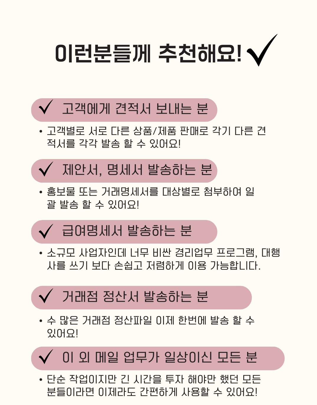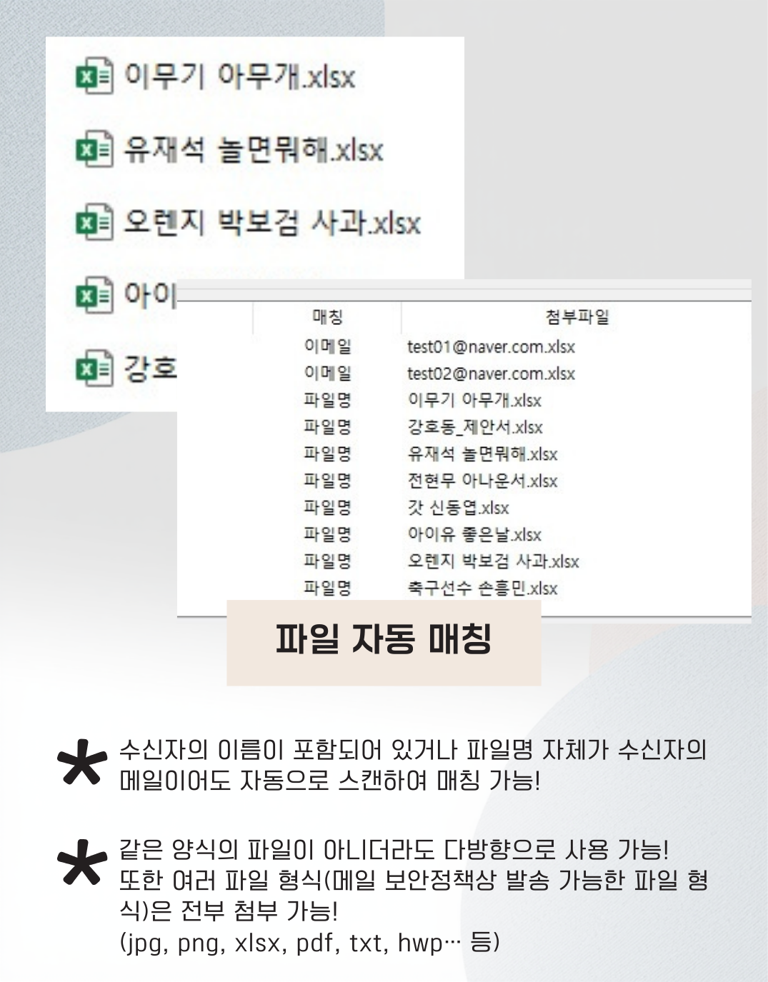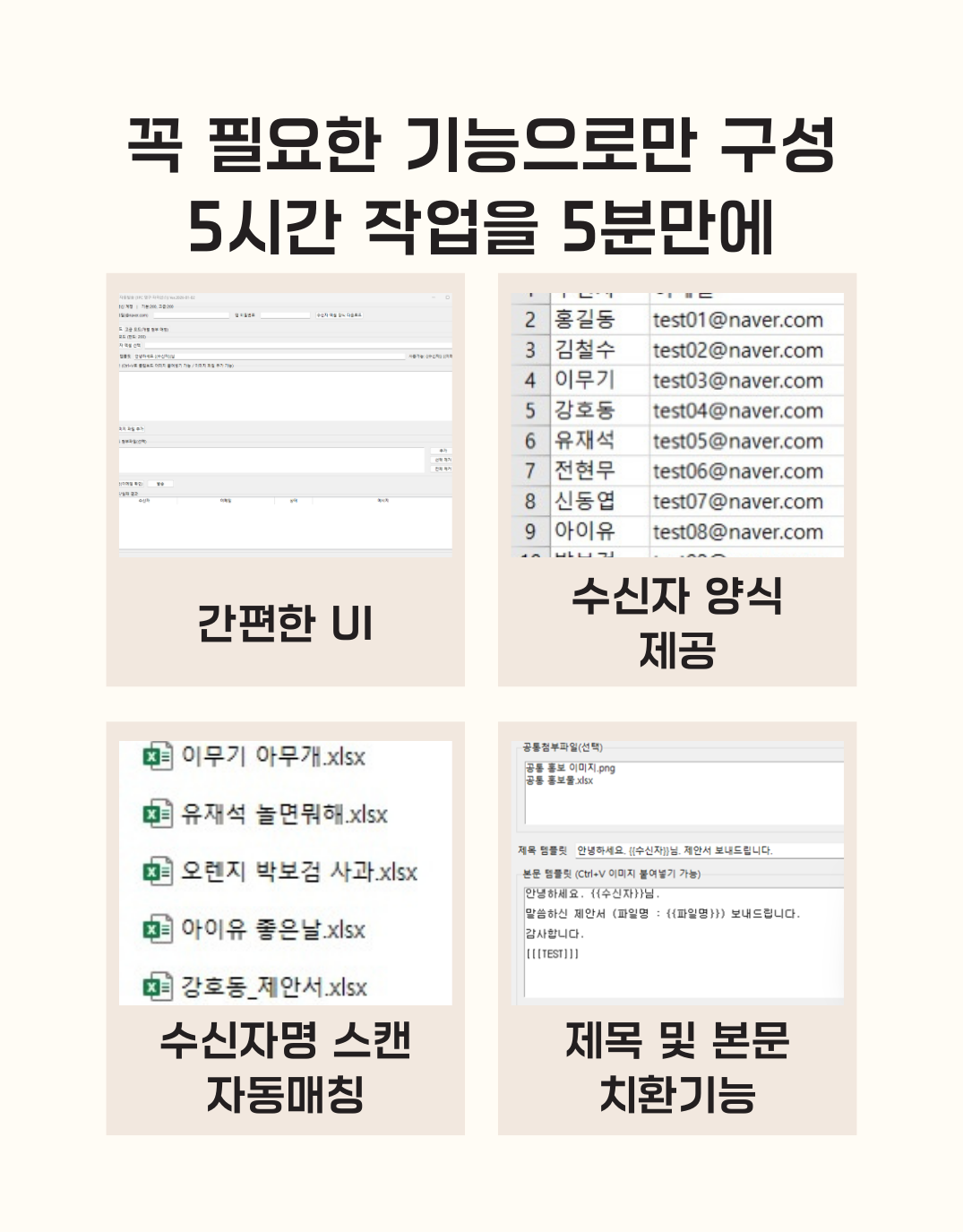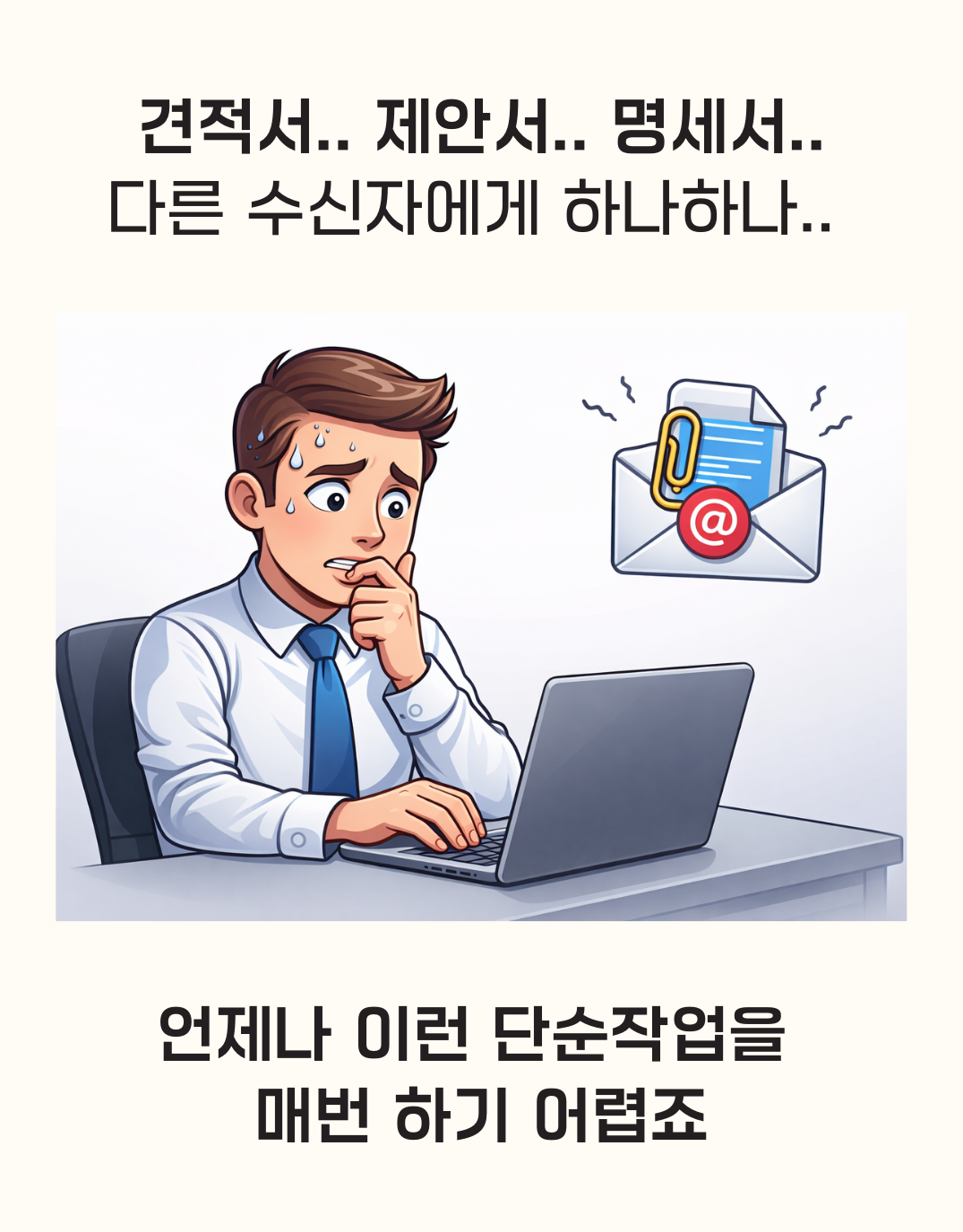 오토멜(AutoMel)은각기 다른 파일을 자동으로 매칭하여거래처별 정산, 견적서, 제안서, 급여명세서 등 메일을 한 번에 발송할 수 있는업무 자동화 프로그램입니다.매달 반복되는 메일 발송 업무,엑셀 파일을 하나씩 나눠 첨부하고메일을 개별로 보내느라 번거로우셨다면오토멜로 간단하게 해결할 수 있습니다.[주요 기능]- 엑셀 파일 자동 분석 및 데이터 매칭- 수신자별 파일 자동 분리- 개인별 맞춤 메일 내용 자동 생성- 네이버 메일 SMTP 연동- 클릭 한 번으로 다중 메일 발송- 설치가 필요 없는 EXE 실행 파일[이런 분들께 추천합니다]- 매달 메일을 반복 발송하는 분- 엑셀 파일을 거래처별로 나눠 보내야 하는 분- 메일 발송 실수를 줄이고 싶은 분- 반복 업무를 자동화하고 싶은 실무자[사용 환경]- Windows 10 / 11- 엑셀 파일 (.xlsx)- 네이버 메일 계정 필요[제공 파일]- Automel 실행 파일 (EXE)- 사용자 매뉴얼- 네이버 SMTP 설정 가이드- FAQ 및 이용 안내 문서※ 본 상품은 디지털 파일 상품으로구매 후 바로 다운로드하여 사용 가능합니다. 1. 구매 완료 후 크몽을 통해 오토멜(AutoMel) 프로그램 파일을 즉시 다운로드할 수 있습니다.2. 파일 다운로드 ZIP 파일을 다운로드한 후 압축을 해제합니다.3. 프로그램 실행 Automel.exe 파일을 실행합니다. (설치 과정 없이 바로 실행됩니다)4. 초기 설정 네이버 메일 SMTP 설정 및 앱 비밀번호를 입력합니다. 제공된 매뉴얼을 참고하여 설정을 완료합니다.(ZIP 파일 내 설정방법 안내문 有)5. 사용 시작 엑셀 파일을 불러온 후 자동 매칭 및 메일 발송 기능을 이용하실 수 있습니다. 1. 발신용 네이버 메일 계정- 메일 발송을 위해 네이버 메일 계정이 필요합니다.- 일반 비밀번호가 아닌 ‘앱 비밀번호(어플리케이션 암호)’ 발급이 필요합니다.- 설정 방법은 제공되는 매뉴얼을 참고해 주세요.2. 엑셀 파일- 메일 발송 대상 정보가 포함된 엑셀 파일(.xlsx)이 필요합니다.- 엑셀 형식은 제공되는 예시 파일 및 매뉴얼 기준을 따라주세요.3. 사용 환경- Windows 10 또는 Windows 11 운영체제가 필요합니다.- Mac OS에서는 사용이 불가합니다.4. 기본 PC 사용 권한- 프로그램 실행 및 파일 접근이 가능한 PC 환경이 필요합니다.- 회사/공용 PC 사용 시 보안 프로그램 또는 방화벽에 의해 메일 발송이 제한될 수 있습니다.5. 사전 확인 사항- 구매 전 제공되는 설명 및 매뉴얼을 반드시 확인해 주세요.- 본 상품은 완성된 프로그램 제공 상품으로 별도의 커스터마이징 또는 추가 개발은 포함되어 있지 않습니다.