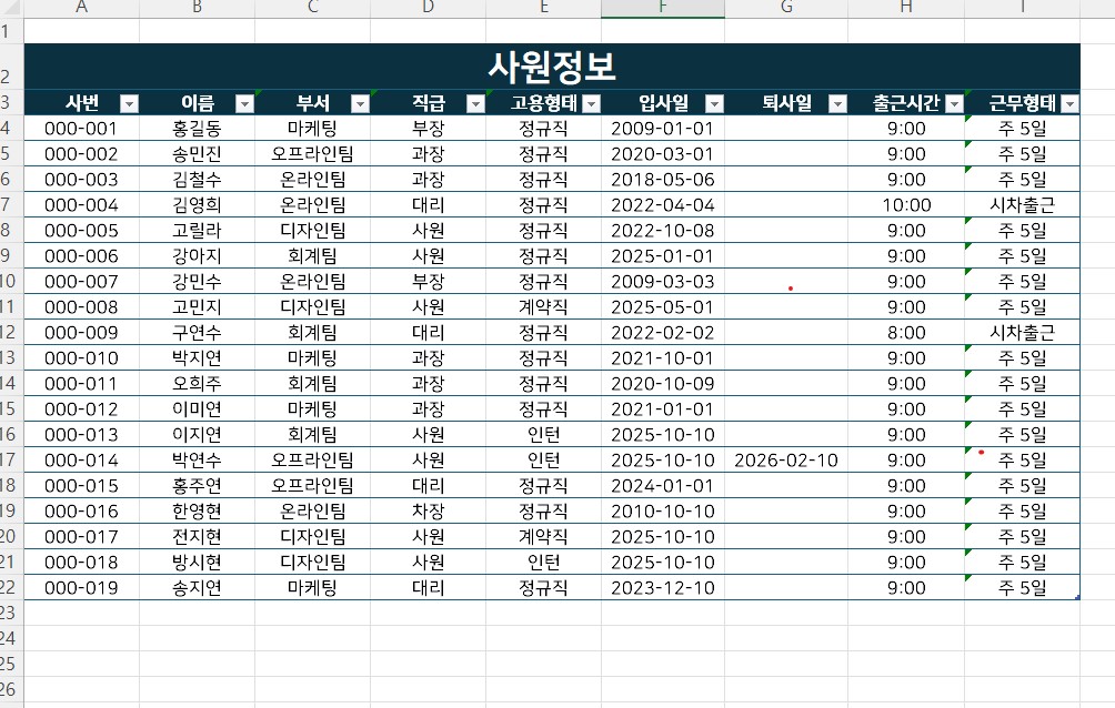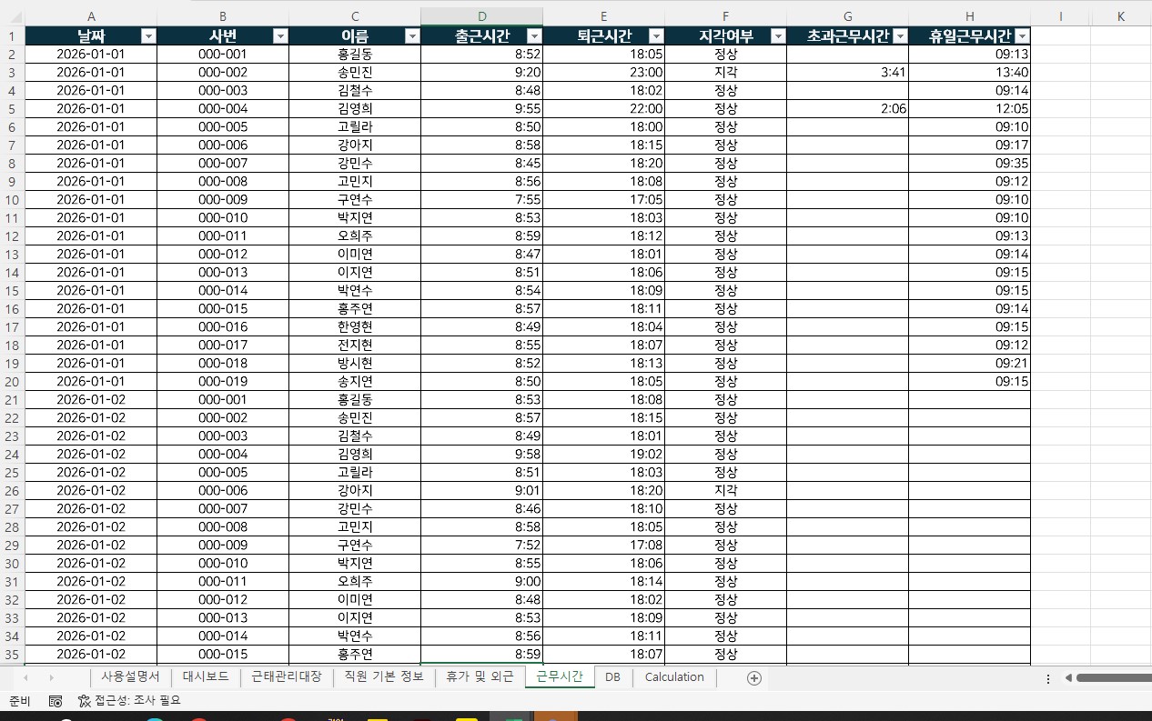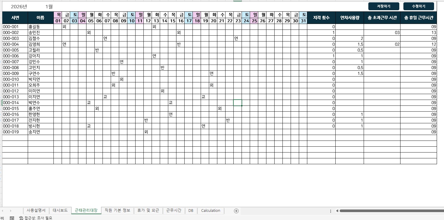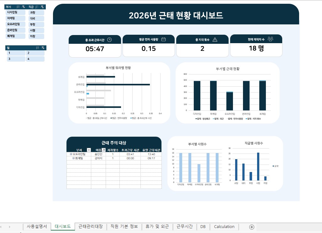 2026년 근태 관리 프로그램 사용자 매뉴얼본 문서는 2026년 근태 관리 프로그램의 효율적인 운영을 위한 사용자 매뉴얼입니다. 각 시트별 기능과 데이터 처리 절차를 숙지하여 업무에 활용하시기 바랍니다.1. 기초 데이터 입력프로그램 사용을 위한 기본 정보를 등록하는 단계입니다. 정확한 데이터 연동을 위해 기초 정보가 우선 입력되어야 합니다.[직원 기본 정보] 시트사번, 이름, 부서, 직급 등 임직원의 기초 인사 데이터를 입력합니다.본 시트에 등록된 정보는 프로그램 내 모든 시트의 기준 데이터로 활용됩니다.[휴가 및 외근] / [근무시간] 시트임직원의 일자별 상세 근태 내역(출퇴근 시간, 연차, 반차, 외근, 교육 등)을 입력합니다.입력된 데이터는 [근태관리대장] 시트로 자동 연동됩니다.2. 근태 현황 조회 및 데이터 관리입력된 근태 내역을 종합적으로 확인하고, 데이터베이스(DB)로 이관하는 단계입니다.[근태관리대장] 시트현황 조회: 입력된 근태 일정(외근, 연차, 교육 등)을 사원별 달력 형태로 조회할 수 있습니다.퇴사자 필터링: 작성 기준월에 이미 퇴사한 인원은 목록에서 자동으로 제외되어 현행화된 인원 관리가 가능합니다.데이터 저장 및 수정 (필수):저장하기: 월별 데이터 확인 후 버튼을 클릭하면 [DB] 시트로 데이터가 저장됩니다.수정하기: 데이터 변경 사항이 발생한 경우, 수정을 완료한 후 버튼을 클릭하여 기존 DB 데이터를 갱신합니다.3. 데이터 시각화 및 모니터링축적된 데이터를 분석하여 시각적 지표로 확인하는 단계입니다.[대시보드] 시트[DB] 시트에 저장된 데이터를 기반으로 부서별, 직급별 근태 현황을 시각화하여 제공합니다.집중 관리 대상: 지각 횟수 등 주요 근태 지표를 모니터링할 수 있습니다. (기본 설정은 지각 1회 이상 발생 시 표시되며, 기준은 조정 가능합니다.)4. 데이터 최신화 절차 (필수 사항)대시보드에 최신 데이터를 반영하기 위해서는 반드시 아래의 데이터 새로 고침 절차를 수행해야 합니다.[Calculation] 시트데이터 추가 또는 수정 작업 후 [Calculation] 시트로 이동합니다.엑셀 상단 메뉴의 [피벗 테이블 분석] 탭을 선택합니다.[새로 고침] 버튼을 누른 후 **[모두 새로 고침]**을 실행합니다.위 절차를 완료해야 대시보드의 차트와 표에 변경된 데이터가 정상적으로 반영됩니다.※ 기타 유의 사항본 파일은 업무 자동화를 위한 매크로가 포함되어 있습니다. 파일 실행 시 상단의 [콘텐츠 사용] 버튼을 반드시 클릭하여 매크로를 활성화해주시기 바랍니다.대시보드의 관리 기준 변경이나 프로그램 설정 관련 문의는 관리자에게 요청하시기 바랍니다. 엑셀 파일을 첨부해드립니다추가 수정이 필요하신 경우는 하자가 아닌 경우 추가 비용이 발생합니다 해당 파일은 근무관리에 대한 파일입니다해당 파일 기능을 정확히 확인 부탁드립니다별도의 준비사항은 없습니다