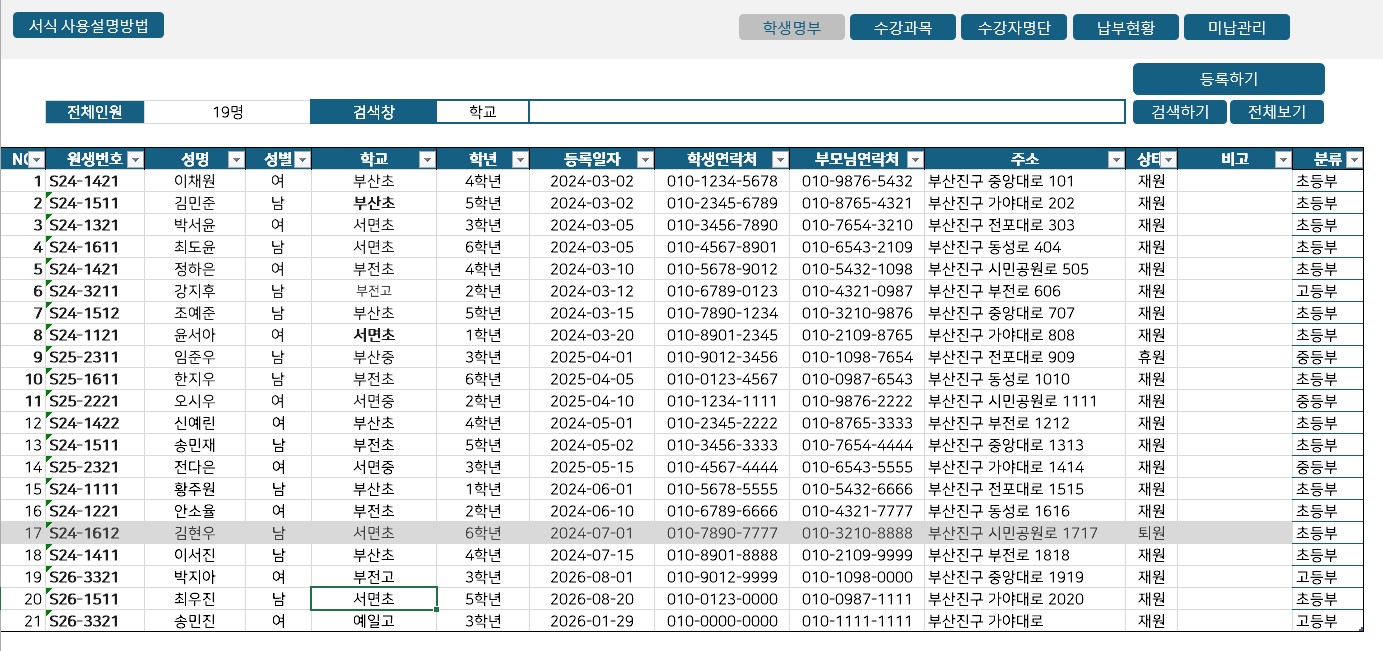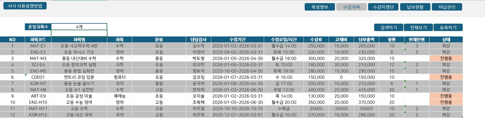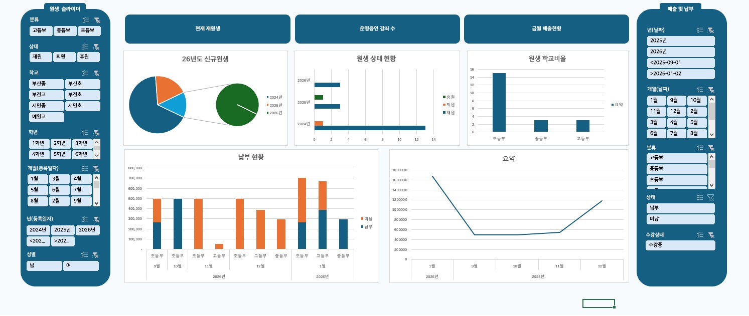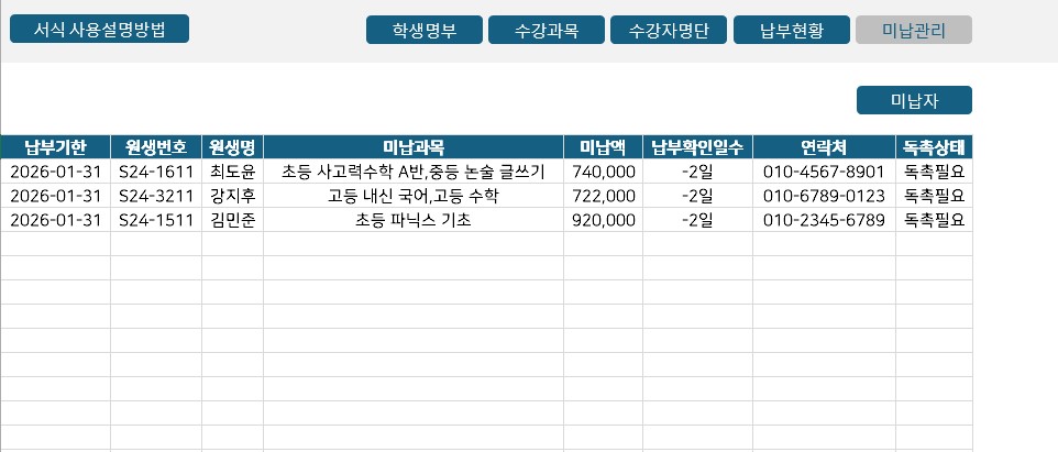학원 운영의 효율을 극대화하는 올인원 학원 관리 엑셀 프로그램안녕하십니까, 학원 운영의 번거로움을 덜어드리고자 개발된 학원 관리 엑셀 솔루션을 소개합니다.많은 원장님께서 학생 관리, 수납 관리, 매출 분석을 위해 매월 고가의 수수료를 지불하며 복잡한 프로그램을 사용하거나, 혹은 엑셀과 수기 장부를 병행하며 비효율적인 업무에 시달리고 계십니다. 본 프로그램은 이러한 고충을 해결하기 위해 원생 관리부터 매출 분석까지 하나의 파일에서 완벽하게 처리할 수 있도록 설계된 통합 관리 시스템입니다.본 프로그램의 핵심 특장점은 다음과 같습니다.1.합리적인 비용과 영구적인 사용매월 발생하는 고정 비용(구독료)이 전혀 없습니다. 단 한 번의 구매로 평생 소장이 가능하며, 추가 비용 없이 학원 내 모든 PC에서 자유롭게 사용할 수 있어 고정 지출을 획기적으로 절감할 수 있습니다.2.별도의 교육이 필요 없는 직관적인 사용성새로운 소프트웨어를 배울 필요가 없습니다. 누구나 익숙한 엑셀 환경을 기반으로 제작되었으나, 복잡한 함수나 수식을 몰라도 됩니다. 버튼 클릭만으로 등록, 수정, 조회가 가능한 자동화 매크로(VBA)가 탑재되어 있어 컴퓨터 활용 능력과 관계없이 즉시 업무에 투입할 수 있습니다.3.데이터 연동을 통한 업무 자동화원생 정보와 수강 과목을 각각 관리할 필요가 없습니다.원생 관리: 학생의 인적 사항과 재원 상태를 체계적으로 관리합니다.수강 등록 자동화: 학생과 과목을 선택하고 등록 버튼만 누르면, 수강료와 교재비, 수업 기간이 자동으로 계산되어 납부 목록에 생성됩니다.수납 및 미납 관리: 납부 처리 시 미납자 목록에서 자동으로 제외되며, 장기 미납자를 별도로 추출하여 집중 관리할 수 있습니다.4.경영 현황을 한눈에 파악하는 대시보드단순히 데이터를 쌓아두는 것에 그치지 않습니다. 입력된 데이터를 바탕으로 월별 매출 추이, 수강생 증감 현황, 미납 비율 등을 시각화된 차트와 표로 제공합니다. 원장님께서는 대시보드를 통해 학원의 성장 흐름을 정확하게 파악하고 데이터에 기반한 의사결정을 내릴 수 있습니다.5.행정 업무 시간의 획기적인 단축반복되는 수납 체크와 명단 정리 업무를 자동화함으로써 행정 업무 시간을 획기적으로 줄여줍니다. 이를 통해 원장님과 선생님께서는 행정 처리가 아닌, 학생 교육과 상담 등 학원의 본질적인 가치를 높이는 데에 더 많은 시간을 투자할 수 있습니다.복잡하고 비싼 관리 프로그램 대신, 가볍지만 강력한 기능을 갖춘 이 엑셀 솔루션으로 학원 운영의 체계를 완성해 보십시오. 1. 서비스 신청 및 결제고객님께서 상품 구매를 확정하고 결제를 완료하시면 주문이 시스템에 즉시 접수됩니다. 별도의 상담 과정 없이 비대면으로 신속하게 진행됩니다.2. 프로그램 및 매뉴얼 자동 발송결제 완료와 동시에 학원 관리 엑셀 원본 파일(.xlsm)과 상세 사용 설명서(PDF)가 고객님의 이메일 또는 구매 내역의 다운로드 경로를 통해 즉시 발송됩니다. (24시간 자동 발송)3. 파일 다운로드 및 보안 설정수령하신 엑셀 파일을 PC에 다운로드하여 실행합니다. 파일 실행 시 엑셀 상단에 나타나는 노란색 보안 경고창에서 [콘텐츠 사용] 또는 [편집 사용] 버튼을 클릭하여 매크로 기능을 활성화합니다.4. 기초 데이터 입력동봉된 사용자 매뉴얼을 참고하여 '원생관리' 및 '수강과목' 시트에 현재 운영 중인 학원의 기초 데이터(학생 명단, 개설 강좌, 수강료 등)를 입력합니다.5. 사용 개시 (영구 소장)입력이 완료되는 즉시 모든 자동화 기능을 사용할 수 있습니다. 이후 별도의 추가 비용이나 갱신 절차 없이 해당 파일을 영구적으로 소장하여 업무에 활용하시면 됩니다. 별도로 준비하신 자료는 없습니다제작된 파일을 전송하는 방식입니다구매 여부만 결정해주시면 됩니다