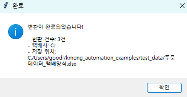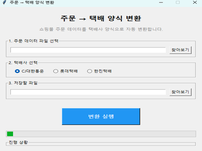 이런 분들께 추천합니다 - 매일 주문서를 택배 양식으로 복사/붙여넣기 하시는 분 - 여러 쇼핑몰 주문을 하나로 합쳐서 발송하시는 분 - 수작업 중 주소나 연락처 오타로 반송된 경험이 있으신 분 - 주문량이 많아 발송 준비에 시간이 오래 걸리시는 분 - 직원에게 업무 인수인계가 어려우신 분 1. 상담 및 요구사항 확인 - 사용 중인 쇼핑몰과 택배사 확인 - 주문서/발송양식 샘플 파일 수령 2. 분석 및 견적 안내 - 양식 분석 후 작업 범위 확정 - 최종 견적 및 일정 안내 3. 프로그램 개발 - 컬럼 매핑 및 변환 로직 개발 - 테스트 데이터로 검증 4. 1차 납품 및 테스트 - 실행 파일(.exe) 전달 - 의뢰인 테스트 및 피드백 5. 수정 및 보완 - 피드백 반영하여 수정 - 추가 요청사항 반영 6. 최종 납품 - 최종 프로그램 + 사용설명서 전달 - 사용법 안내 1. 쇼핑몰 주문서 샘플 (필수) - 실제 사용하는 주문서 엑셀 파일 - 개인정보는 임의 데이터로 대체 가능 2. 택배사 발송양식 샘플 (필수) - 택배사에서 요구하는 업로드 양식 - 또는 택배사명만 알려주셔도 됩니다 3. 변환 규칙 (선택) - 특별히 원하는 변환 규칙이 있으면 알려주세요 - 예: 상품명 20자 제한, 연락처 하이픈 제거 등 4. 추가 요청사항 (선택) - 여러 쇼핑몰 통합 여부 - 오류 데이터 분리 필요 여부