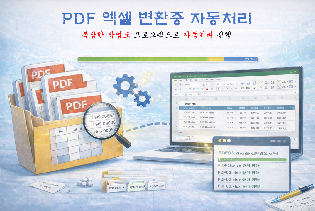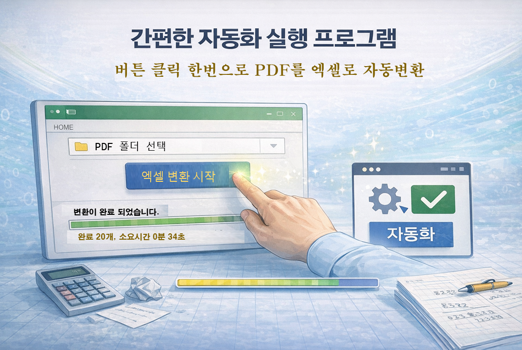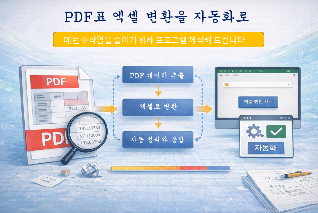 ■ 상품 소개거래명세서, 정산표, 입출금 내역 등PDF 파일 안의 표 데이터를 엑셀로 옮기는 작업을자동으로 처리할 수 있도록 프로그램을 제작해드립니다.단순 1회 변환 작업이 아닌반복 업무를 줄이기 위한 자동화 제작 상품입니다.■ 이런 작업에 적합합니다거래명세서 PDF 엑셀 변환매출·정산표 데이터 추출입출금 내역 정리발주서·정산자료 취합다수 PDF 일괄 변환반복적으로 같은 양식의 PDF를 처리하는 경우자동화 효율이 높습니다.■ 작업 진행 방식 PDF 샘플 파일 확인 결과 엑셀 형태 협의 변환 + 정리 로직 설계 자동화 프로그램 제작 실행파일 전달 및 사용 안내■ 제작 결과물PDF → 엑셀 자동 변환표 구조 자동 정렬숫자·날짜 형식 정리다중 파일 일괄 처리통합 시트 생성 (옵션)■ 중요 안내 (범위 제한)본 상품은 아래 조건 기준으로 제작됩니다.-텍스트 기반 PDF-동일하거나 유사한 양식-반복 변환 업무다음 경우는 별도 상담 또는 진행이 어려울 수 있습니다.-스캔 PDF (이미지 형태)-손글씨·도장 포함 문서-매번 양식이 다른 경우■ 이런 분께 추천드립니다-매달 거래명세서 정리하는 분-PDF 데이터를 엑셀로 취합하는 분-반복 변환 작업이 많은 실무자-수작업 복붙에 시간을 쓰는 분■ 작업 범위 안내본 상품은 1회 자동화 제작 기준입니다.파일 구조 변경, 양식 추가, 기능 확장은별도 의뢰로 진행됩니다.반복적으로 처리해야 하는 PDF 변환 업무라면샘플 파일 확인 후자동화 가능 여부와 작업 범위를 안내드립니다.간단한 예시 파일만 보내주셔도 상담 가능합니다. ■ 서비스 제공 절차① 작업 내용 상담의뢰하실 PDF 파일과원하시는 엑셀 결과 형태를 확인합니다.자동화 가능 여부 및 작업 범위를사전 안내드립니다.② 샘플 파일 전달다음 자료를 전달받습니다.PDF 샘플 파일변환 후 원하는 엑셀 예시처리 방식 설명샘플 확인 후구체적인 제작 범위를 확정합니다.③ 자동화 설계 및 제작PDF 표 구조 분석 후엑셀 변환 + 자동 정리 로직을 설계하여프로그램을 제작합니다.④ 테스트 진행샘플 및 추가 파일로 테스트를 진행하여정상 작동 여부를 검수합니다.⑤ 실행파일 전달자동화 실행 프로그램(EXE)과간단한 사용 방법을 안내드립니다.⑥ 유지보수 (옵션)경미한 오류 수정 및간단한 구조 변경은유지보수 옵션 범위 내 지원합니다. 원활한 자동화 제작을 위해아래 자료를 준비해주시기 바랍니다.① PDF 샘플 파일실제 작업에 사용하는 파일최소 2~3개 이상 권장② 변환 후 엑셀 예시원하는 결과 형태열 순서 / 시트 구성 / 정렬 방식예시 파일이 있을수록제작 정확도가 높아집니다.③ 작업 처리 방식 설명예:-어떤 데이터만 추출하는지-합계 포함 여부-통합 시트 필요 여부④ 파일 발생 빈도예: 매일 / 매주 / 매월반복 업무 기준으로자동화 범위를 설계합니다.