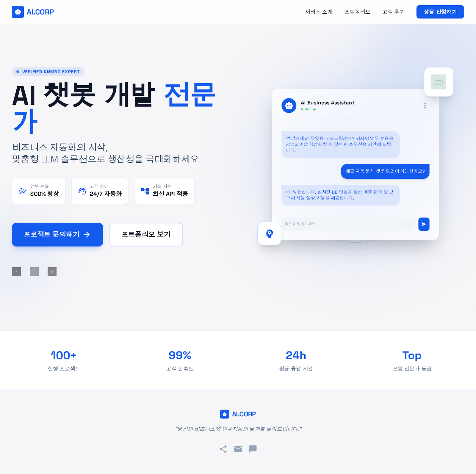 매일 반복되는 질문에 진이 빠지고, 밤늦게 오는 문의를 놓쳐 매출이 날아갈까 걱정되시나요? 이제 '똑똑한 AI 직원' 한 명으로 모든 고민을 해결하세요.1. "숨 쉬듯 반복되는 질문, AI가 1초 만에 답변합니다"대상: 위치, 가격, 주차, 영업시간 문의가 폭주하는 분"거기 주차 되나요?", "오늘 몇 시까지 해요?" 같은 단순 문의, 하루에 몇 번이나 답하시나요?사장님이 현장에서 바쁘게 일하실 때, AI 챗봇이 고객의 질문을 받자마자 1초 만에 정확한 답변을 내놓습니다. 사장님은 이제 본업에만 집중하세요.2. "사장님이 주무시는 새벽에도, 영업은 계속됩니다"대상: 퇴근 후나 주말에 오는 문의를 놓치고 싶지 않은 분고객은 기다려주지 않습니다. 답변이 늦어지면 다른 곳으로 떠나버리죠.AI 챗봇은 365일 24시간 깨어 있습니다. 새벽 2시에 오는 예약 문의도, 주말 아침의 상담도 놓치지 않고 대응하여 매출 기회를 확실하게 잡아드립니다.3. "우리 회사만의 '전용 지식'을 가진 똑똑한 AI"대상: 최신 기술(ChatGPT, RAG 등)을 실제 업무에 쓰고 싶은 분단순히 정해진 말만 반복하는 옛날 챗봇이 아닙니다. 사장님이 주신 PDF 매뉴얼, 가격표, 공지사항을 AI가 통째로 공부합니다.어려운 기술(RAG): "우리 회사 문서만 쏙쏙 골라 읽어서 대답하는 기술"입니다. 엉뚱한 소리 하지 않고 오직 사장님의 데이터로만 상담합니다.더 똑똑한 기술(Text to SQL): "질문하면 복잡한 데이터베이스에서 정답을 찾아내는 기술"입니다. "지난달 가장 많이 팔린 상품이 뭐야?"라고 물으면 AI가 알아서 데이터를 뒤져 알려줍니다.4. "업종 불문! 고객 관리가 필요한 모든 곳에"대상: 쇼핑몰, 학원, 병원, 부동산, 건설 현장 등쇼핑몰: "배송 언제 와요?" 문의 자동 응대 및 상품 추천학원/병원: 수업 시간 안내 및 예약 상담 자동화부동산/건설: 매물 정보 안내 및 현장 사진 관리 보조기업 사내용: 신입 사원이 궁금해하는 사내 규정 자동 응대 1단계. 상담 및 요구사항 정리서비스 목적, 기능 범위 여부 검토2단계. 기획, 화면 구조 정리주요 기능 목록 정리, 화면 흐름 및 구조 확정3단계. 챗봇 개발 진행단계별 기능 구현 및 공유4단계. 테스트 및 수정기본 테스트 진행, 패키지 범위 내 수정 반영5단계. 결과물 전달챗봇 설치 및 소스 전 1. 챗봇이 학습할 자료AI가 사장님 비즈니스에 대해 아는 게 없다면 제대로 된 답변을 할 수 없습니다. 아래 중 가지고 계신 자료를 편하게 전달해 주세요.자주 묻는 질문(FAQ) 리스트: "위치가 어디인가요?", "주차 가능한가요?" 등 평소 고객들이 많이 묻는 질문과 그에 대한 정답.회사/매장 소개 자료: 카탈로그, PDF 매뉴얼, 서비스 단가표, 홈페이지 주소 등.특이사항: 우리 사업장만의 특별한 규칙이나 꼭 안내해야 할 주의사항.2. 서비스 연동 채널 결정어디서 고객을 만날지 결정해 주세요. (중복 선택 가능)앱 연동, 회사 웹사이트