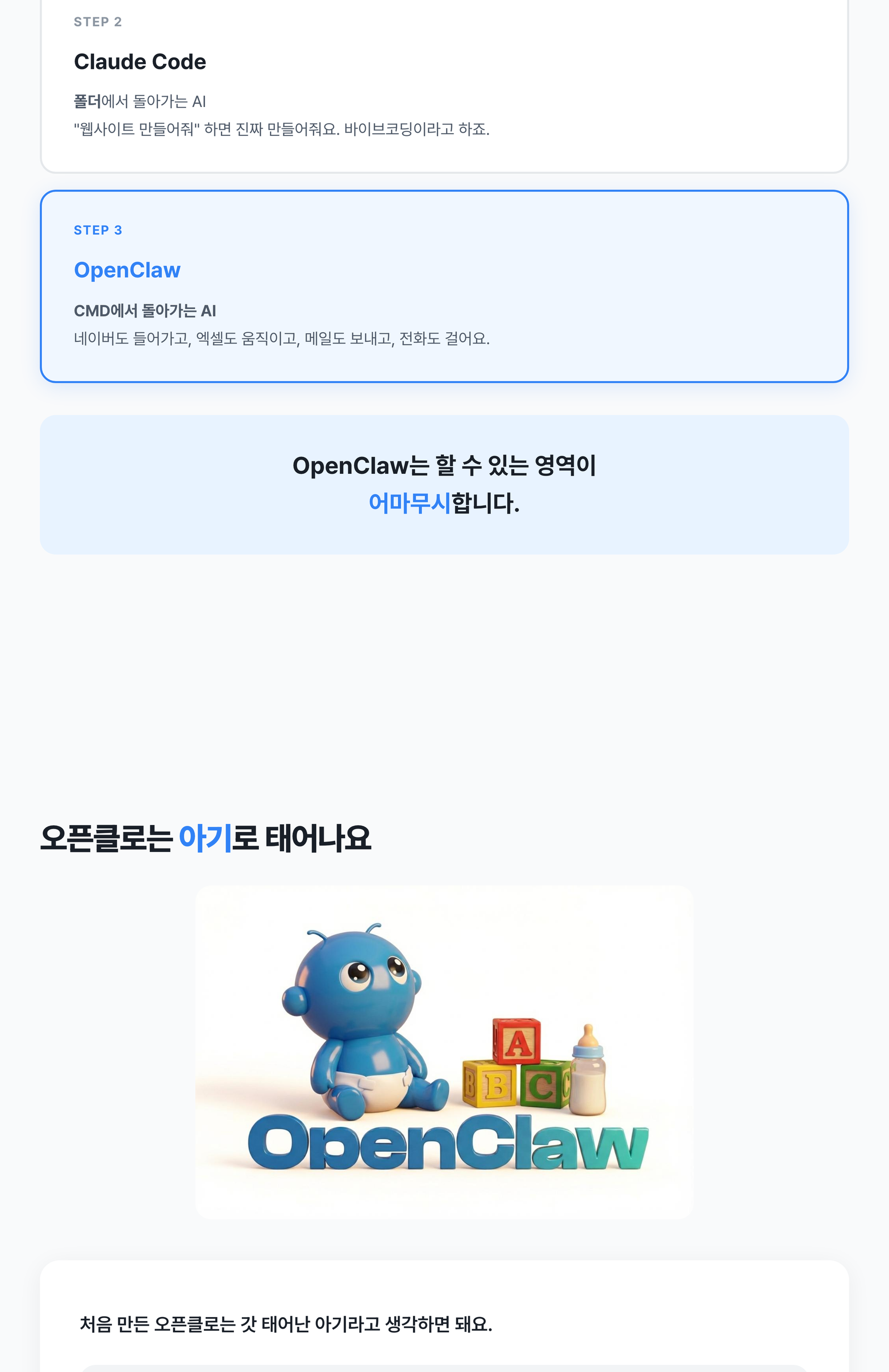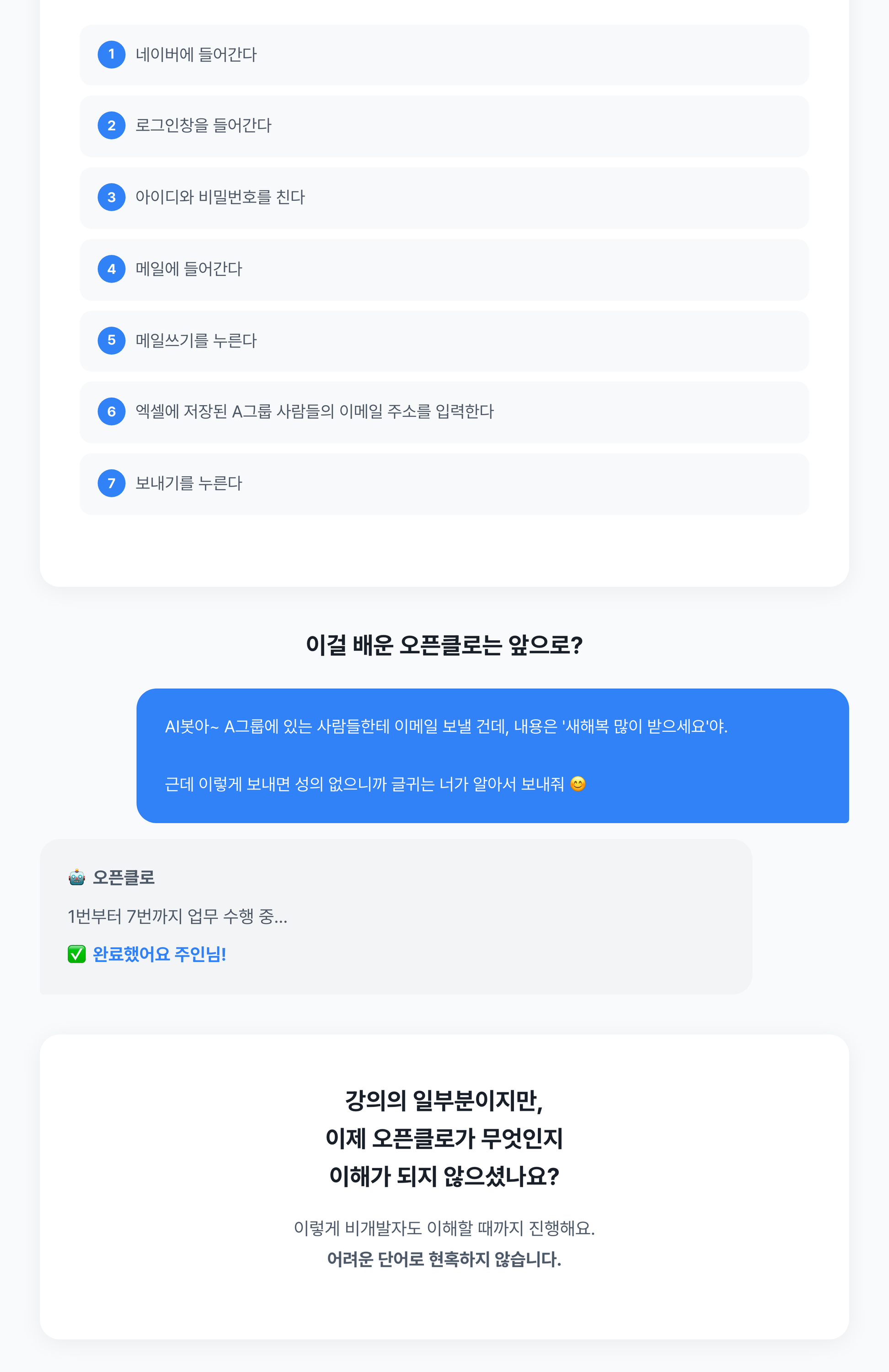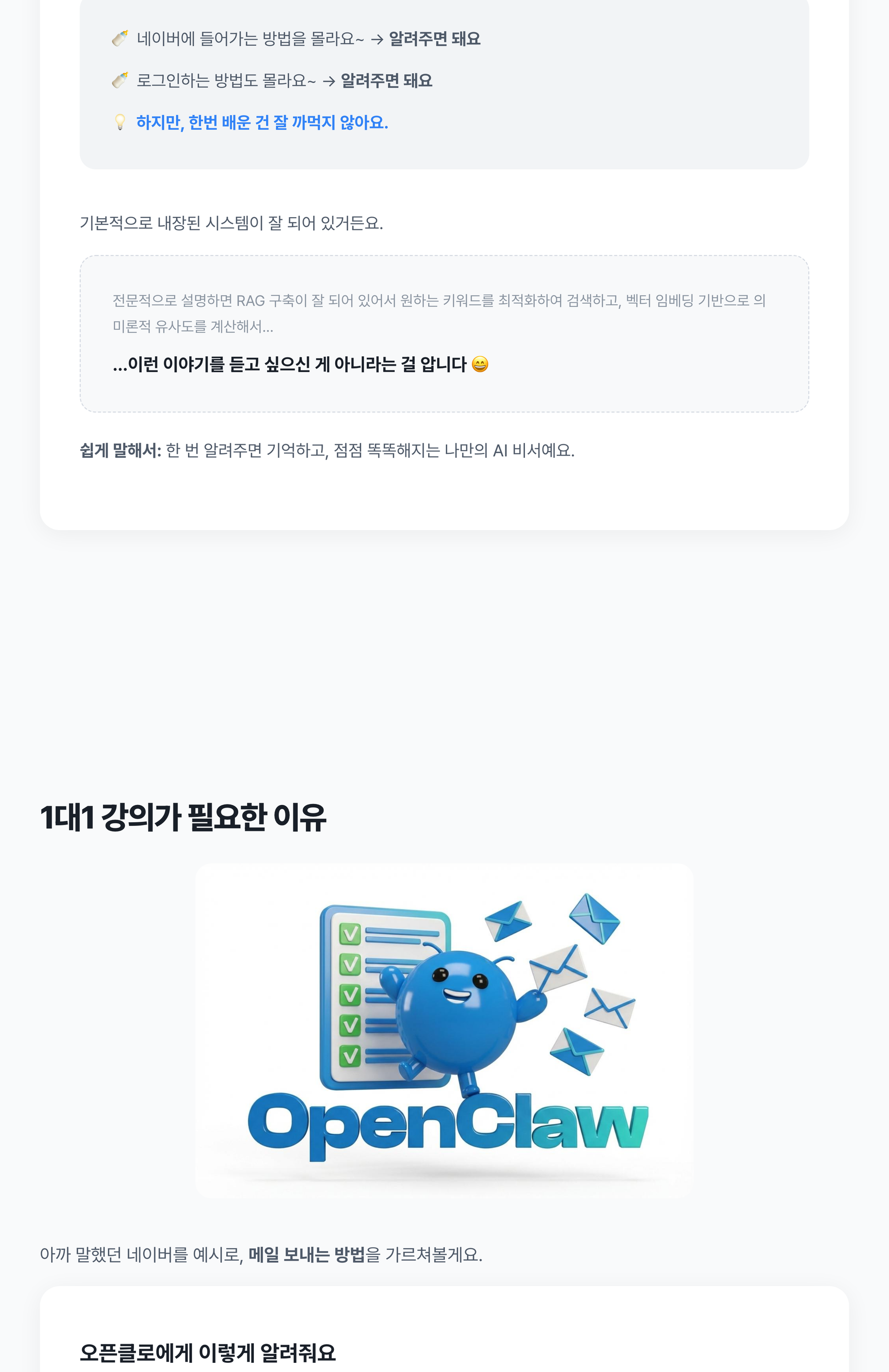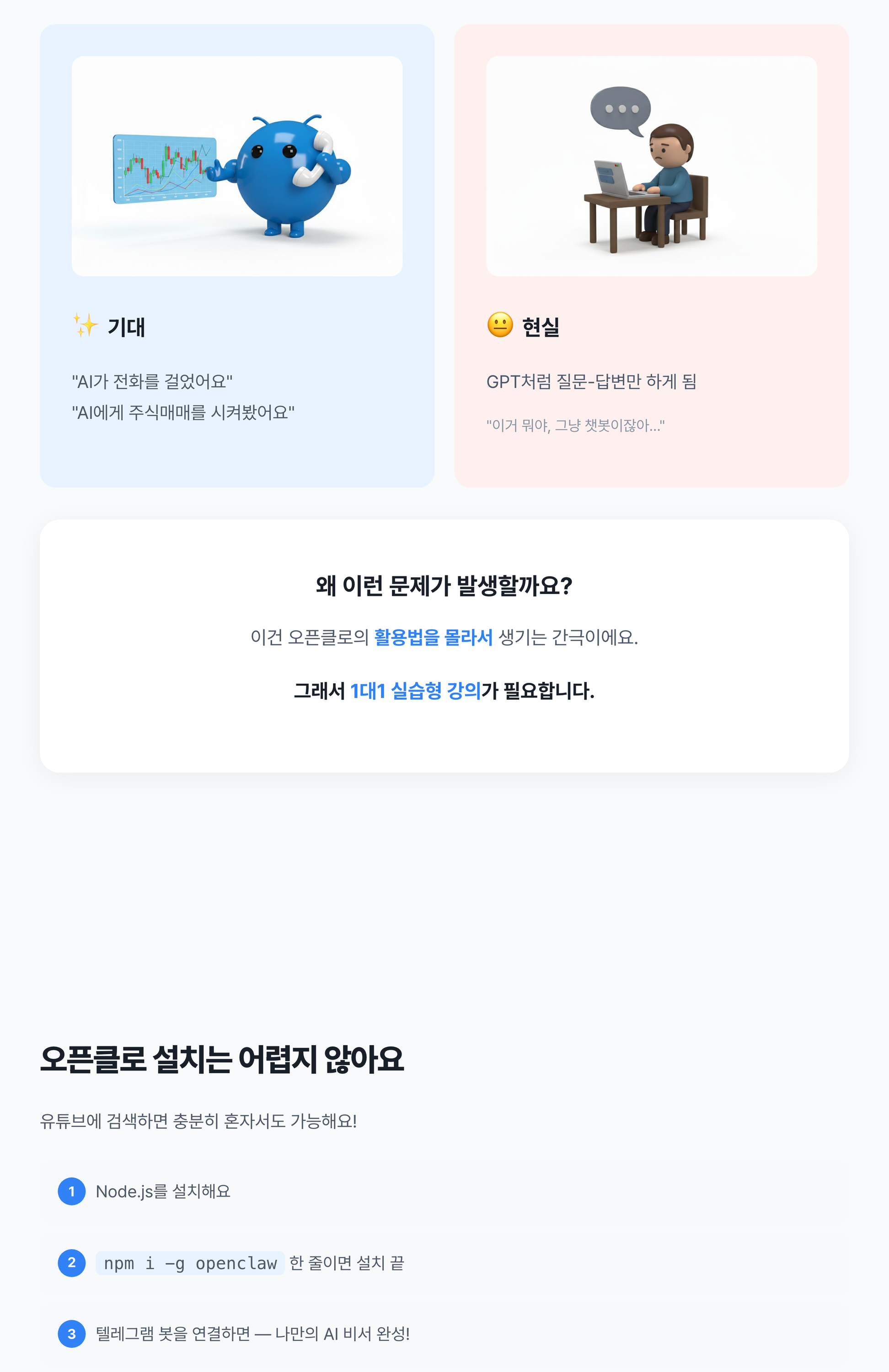 오픈클로(OpenClaw) 설치부터 활용까지, 비개발자 눈높이에서 1대1로 알려드립니다.2026년 1월, 전세계가 동시에 AI 에이전트 시대를 열었습니다.ChatGPT는 웹에서 질문-답변만 하지만, 오픈클로는 네이버 접속, 이메일 발송, 엑셀 작업까지 직접 수행합니다.설치는 무료로 해드립니다. 진짜 가치는 '활용'에 있습니다.[BASIC] 33만원 - 오픈클로 1대1 강의- 오픈클로 개념, 구조, 활용법을 1대1로 설명- 설치 + 세팅 + 보안 무료 포함[DELUXE] 55만원 - 오픈클로 실습형 1대1 강의- 설명을 넘어 직접 파이프라인을 구축- 옆에서 실시간 피드백하며 끝까지 완성- 강의 후에도 간단한 애로사항 피드백 가능[DELUXE] 88만원 - 맞춤형 파이프라인 구축- 마케팅 자동화 셋팅 및 업무 자동화 맞춤형 파이프라인 구축 [상담필요]IT기업 현직자가 직접 가르칩니다.어려운 단어로 현혹하지 않습니다. 이해할 때까지 진행합니다. 1단계: 사전 상담 — 현재 업무 환경과 목표를 파악합니다2단계: 오픈클로 설치 + 보안 세팅 (무료)3단계: 1대1 강의 진행 (BASIC: 개념+활용 / DELUXE: 실습+파이프라인 구축)4단계: 강의 완료 후 정리 (DELUXE: 사후 피드백 포함) 의뢰인 준비사항 안내드립니다.1. 초기화된 컴퓨터 준비 (맥 권장, 윈도우와 리눅스도 가능합니다)2. 텔레그램 미리 가입 및 설치 (설치에 시간이 걸릴 수 있어요)3. AI API 키는 강의 중 함께 발급 도와드립니다.위 사항만 준비해주시면 나머지는 저희가 진행합니다.