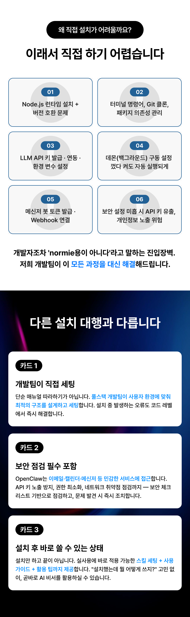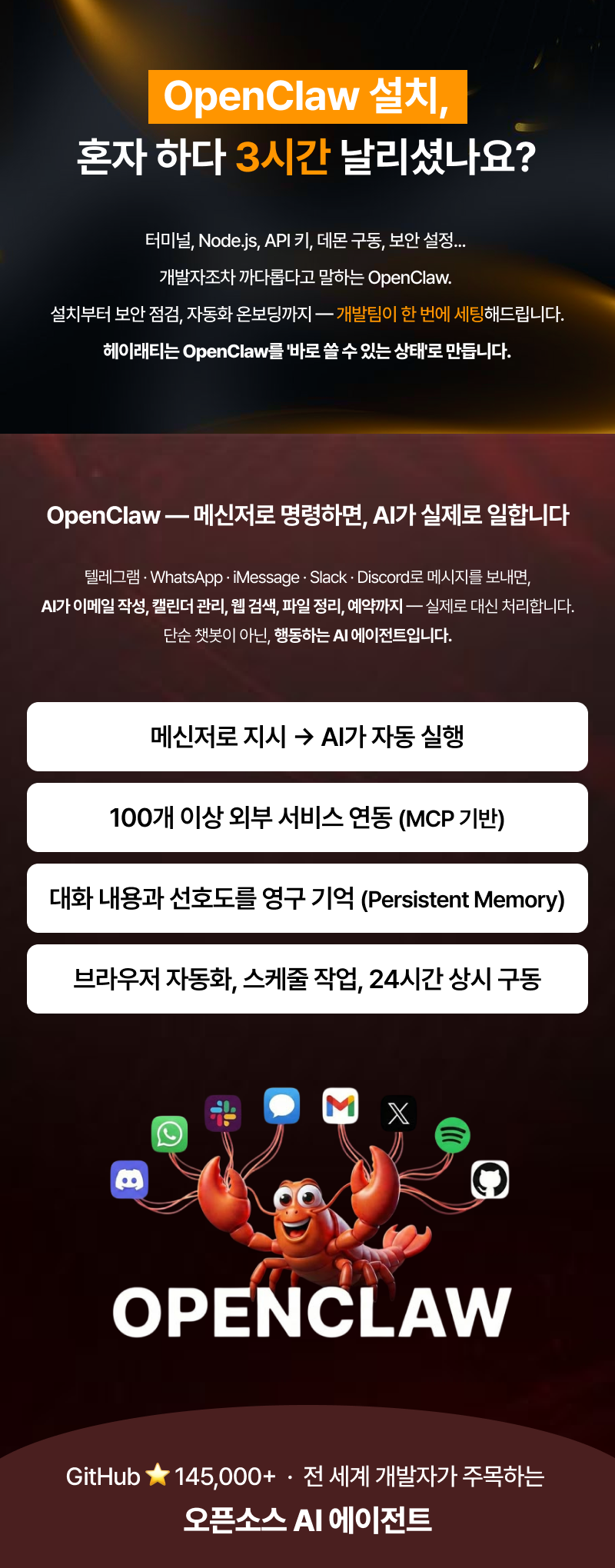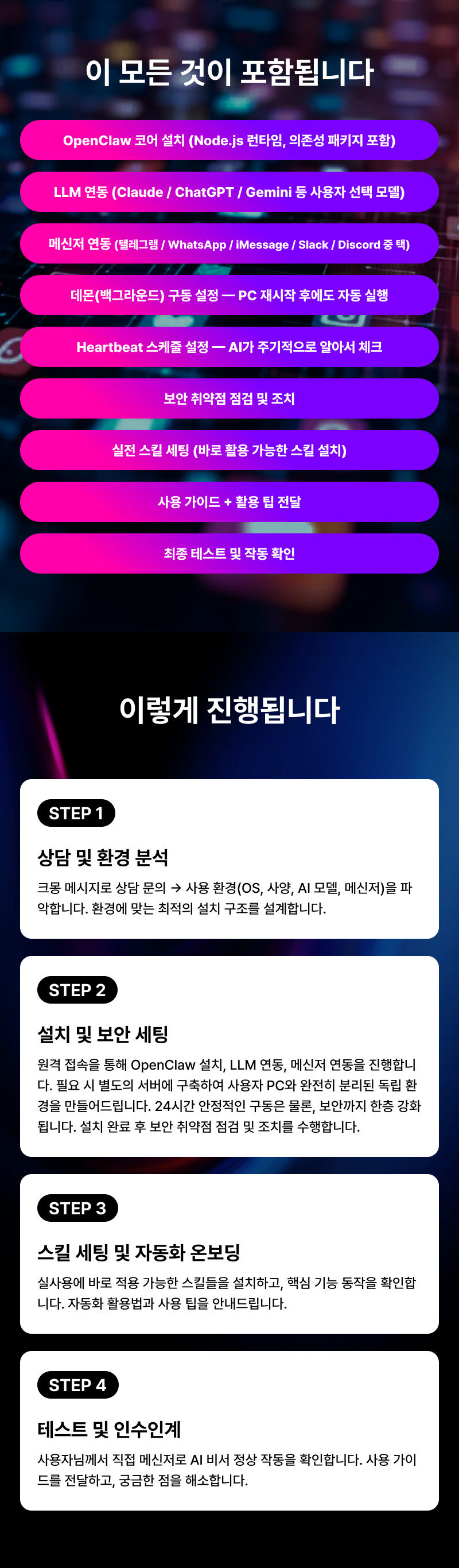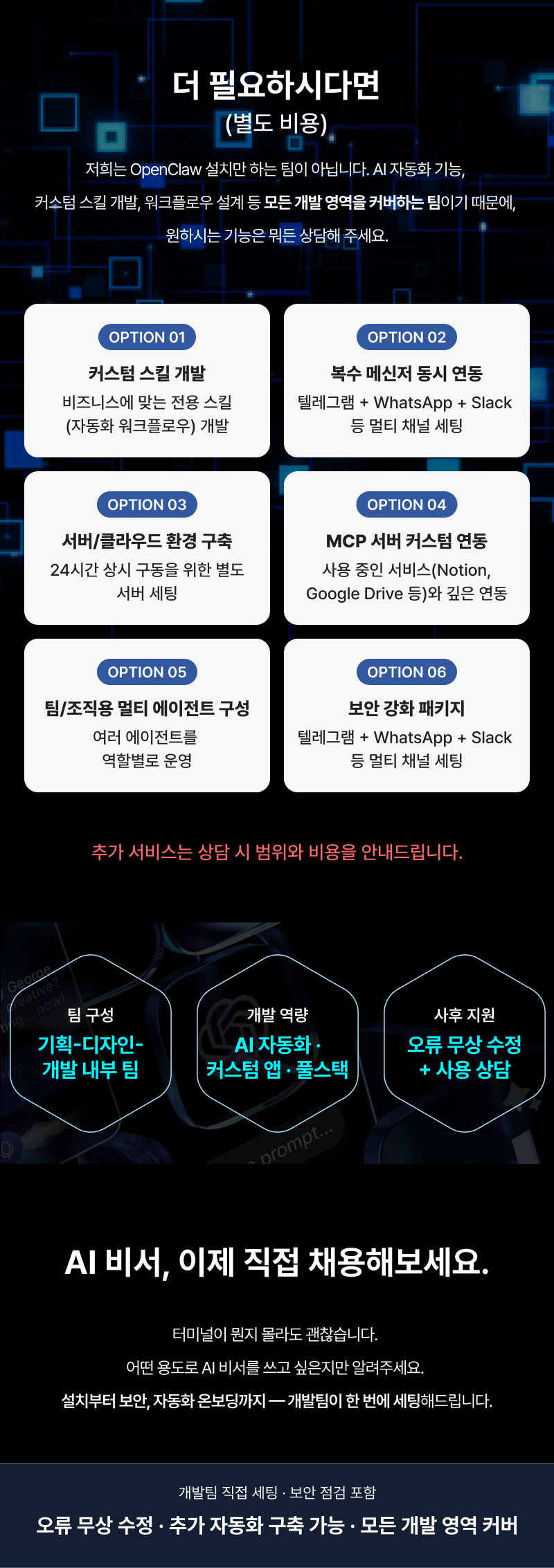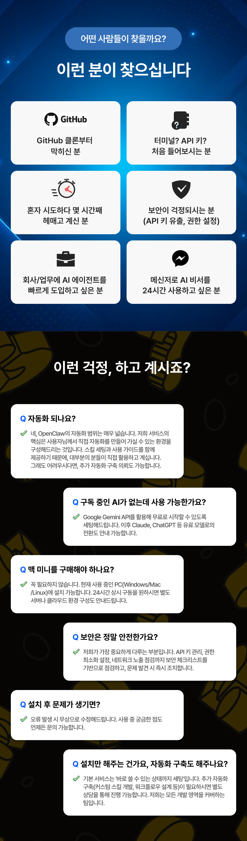 설치만 해주는 곳?저희는 보안 점검 + 자동화 온보딩 + 실전 스킬 세팅까지 해드립니다.요즘 가장 핫한 AI 에이전트, OpenClaw(구 Clawdbot, Moltbot). 텔레그램·WhatsApp·iMessage·Slack·Discord로 명령하면 이메일, 캘린더, 웹 검색, 파일 관리, 예약까지 —AI가 실제로 대신 처리하는 '진짜 비서' 입니다.하지만 OpenClaw는 설치만으로 끝나지 않습니다.Node.js 런타임 구성, 데몬(백그라운드) 구동, 메신저 연동, 스킬 설치,보안 설정까지 맞물려야 비로소 '24시간 켜져 있는 AI 비서' 가 됩니다.헤이래티는 개발팀이 직접 세팅합니다.설치 → 보안 점검 → 메신저 연동 → 스킬 세팅 → 자동화 온보딩까지,"바로 쓸 수 있는 상태"로 만들어드립니다.왜 헤이래티에서 해야 하나요?개발팀이 직접 세팅합니다단순 설치 대행이 아닙니다. 풀스택 개발팀이 사용자 환경(OS, 사양, 네트워크)에 맞춰 최적의 구조를 설계하고 세팅합니다. 설치 중 발생하는 오류도 코드 레벨에서 즉시 해결합니다.보안, 가장 먼저 챙깁니다OpenClaw는 이메일, 캘린더, 메신저 등 민감한 서비스에 접근합니다. API 키 노출, 권한 과다 설정, 네트워크 취약점 — 잘못 세팅하면 개인정보 유출로 이어집니다. 저희는 설치 후 보안 취약점 점검을 필수 단계로 포함하고, 문제 발견 시 즉시 조치합니다.설치하고 끝이 아닌, 바로 쓸 수 있는 상태OpenClaw 설치 후 "그래서 뭘 어떻게 쓰라는 거지?" 하시는 분이 많습니다. 저희는 실사용에 바로 적용 가능한 스킬 세팅 + 사용 가이드까지 제공합니다. 설치 후 헤매는 시간 없이, 곧바로 유능한 AI 비서를 사용하실 수 있습니다.사후 지원세팅 완료 후에도 오류가 발생하면 무상으로 수정해드립니다. 사용 중 궁금한 점이 있으시면 언제든 문의 가능합니다. STEP 1. 상담 및 환경 분석 사용자님의 설치 환경(OS, PC 사양, 사용 중인 AI 모델, 연동 희망 메신저)을 파악합니다. 환경에 맞는 최적의 설치 구조를 설계해드립니다. STEP 2. 설치 및 보안 세팅 원격 접속을 통해 OpenClaw 설치, LLM 연동, 메신저(텔레그램/WhatsApp 등) 연동을 진행합니다. 필요 시 별도의 서버에 구축하여 사용자 PC와 완전히 분리된 독립 환경을 만들어드립니다. 24시간 안정적인 구동은 물론, 보안까지 한층 강화됩니다. 설치 완료 후 보안 취약점 점검 및 조치를 수행합니다. 비전문가분도 편하게 사용하실 수 있도록 사용 편의성 설정을 진행합니다. STEP 3. 스킬 세팅 및 자동화 온보딩 실사용에 바로 적용 가능한 스킬들을 설치하고, 핵심 기능이 실제로 동작하는지 확인합니다. 자동화 활용 방법과 사용 팁을 안내드립니다. STEP 4. 테스트 및 인수인계 사용자님께서 직접 메신저로 AI 비서가 정상 작동하는지 확인합니다. 사용 가이드를 전달하고, 추가 궁금한 점을 해소해드립니다. 구매를 결정하시면 상세한 준비 방법을 안내드립니다. 미리 준비하지 않으셔도 됩니다만, 아래 사항이 있으면 더 원활합니다: · 설치 대상 장비 원격 접속 환경 · 사용할 AI 모델 (없으시면 무료 모델로 세팅 가능) · 연동 희망 메신저 (텔레그램, WhatsApp, iMessage 등) · AI 비서로 하고 싶은 작업 목적/용도