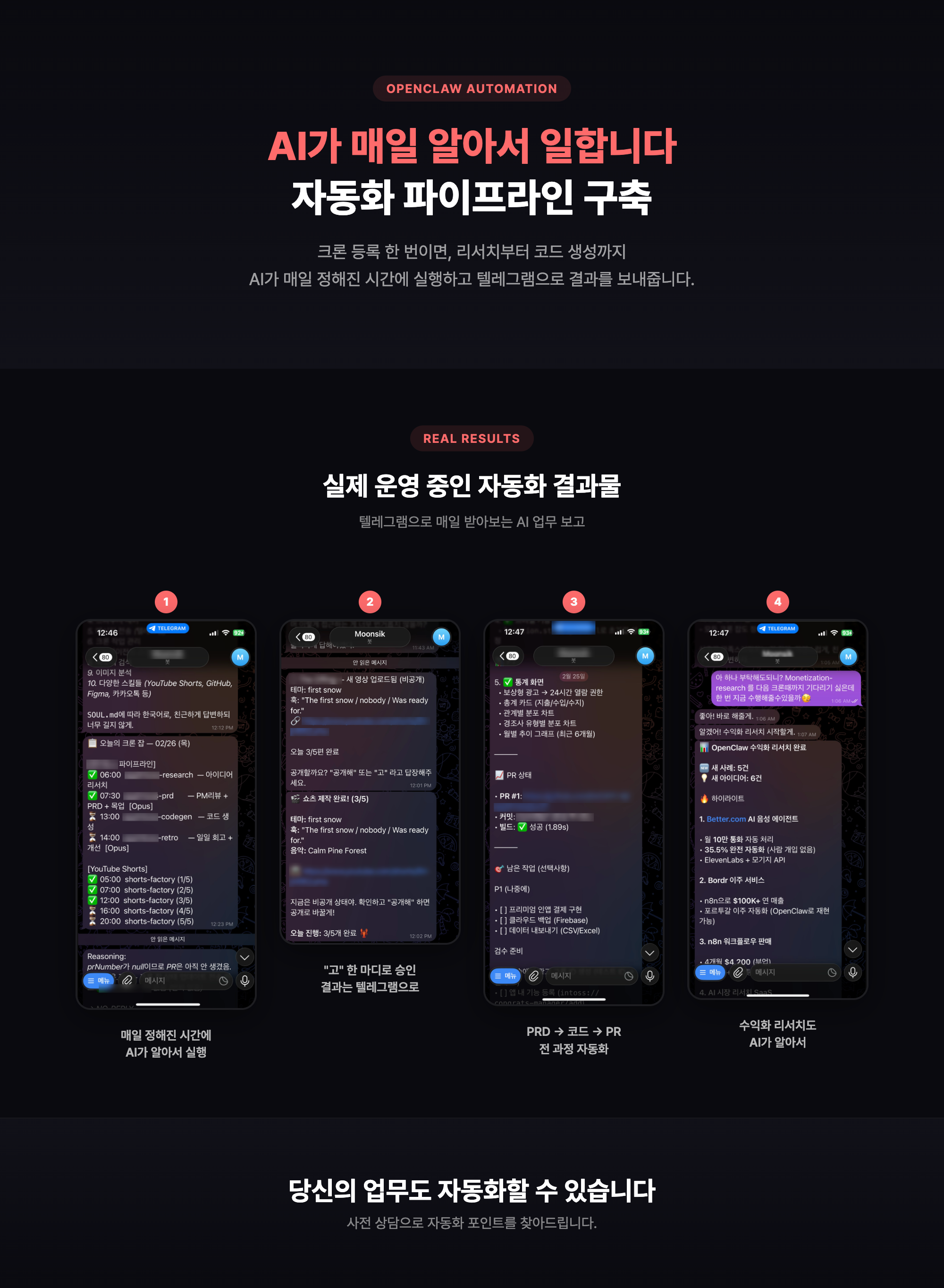 "5개의 자동화를 운영 중인 제가,자동으로 돌아가는 업무 및 수익화 파이프라인을 세팅해 드립니다."OpenClaw는 AI에게 내 업무 방식을 가르치고, 기억하게 하고, 자동으로 실행하게 만드는 도구입니다. 한 번 세팅하면 AI가 내 프로젝트를 이해한 채로 코딩하고, 매일 정해진 시간에 리서치하고, 결과를 텔레그램으로 보내줍니다. 단순 챗봇이 아닌, 진짜 일하는 AI 비서를 만들어 드립니다.저는 현재 5개의 자동화(쇼츠 자동 제작, 리서치, PRD, 디자인, 개발)를 직접 운영 중이며,각 자동화 워크플로우에 필요한 개인 설정들을 운영중입니다.이 경험을 바탕으로 여러분의 업무에 맞는 AI 시스템을 세팅해 드립니다.이런 분들께 제안합니다01.OpenClaw 설치는 했는데 뭘 시켜야 할지 모르겠는 분02.매일 반복하는 작업을 AI에게 맡기고 싶은 분03.외부에서 텔레그램 하나로 자동화 결과를 받아보고 싶은 분04.Claude Code는 쓰는데 매번 같은 지시를 반복하는 분차별화 포인트실전 운영 경험단순 설치가 아닙니다. 유튜브 쇼츠 자동 제작, 앱 자동 생산 등 2개 워크플로우의 총 9개 작업을 매일 운영 중인 실전 경험으로 세팅합니다.쉬운 확장하나 만들어두면 비슷한 자동화를 계속 추가할 수 있습니다. 이를 위한 완벽한 세팅이 구비되어있습니다.스킬 + 크론 + 메모리AI가 프로젝트 맥락을 기억하고, 반복 작업은 스킬로 캡슐화하고, 크론으로 자동 실행합니다. 단순 챗봇이 아닌 스스로 개선되는 시스템을 구축합니다.세팅 범위가이드 제작 - 프로젝트에 맞는 지시문 작성보안 세팅 — API 키 격리 + 권한 통제- API 키는 암호화해서 안전하게 격리하고, AI가 실행할 수 있는 명령과 접근 가능한 파일 범위를 명확히 제한합니다. - 민감한 파일 접근 차단, 위험 명령 실행 전 승인 절차까지 설정해드립니다.스킬(Skill) 제작 — 반복 작업을 명령 하나로 실행MCP 도구 연결 — 자동화에 꼭 필요한 외부 서비스들의 연동 - MCP 는 오히려 너무 많아지면 성능이 안 좋아집니다. - 꼭 필요하고 제가 써본 것들 중 정말 효과적인 것만 선별합니다.크론(Cron) 및 에이전트 설정 — 매일/매주 자동 실행 워크플로우, 병렬 처리텔레그램 연동 — 결과물 자동 알림사용 가이드 및 교육 제공진행 방식1. 사전 상담 (30분) — 현재 업무 파악 + 자동화 포인트 도출2. 세팅 작업 (1~3일) — 원격 진행, 화면 공유하며 같이 확인3. 인수인계 — 세팅 내용 문서화 + 사용법 안내4. 사후 지원 — 질문 대응 + 미세 조정 1. 사전 상담 — 화상 미팅으로 현재 업무와 자동화 니즈 파악 (30분)2. 세팅 설계 — 어떤 스킬/크론/MCP를 구성할지 제안서 공유3. 원격 세팅 — 화면 공유하며 세팅 진행 (1~3일)4. 테스트 및 인수인계 — 자동화 정상 작동 확인 + 사용법 문서 전달5. 사후 지원 — 1주간 질문 대응 및 미세 조정 1. macOS 또는 Linux PC (Windows WSL 가능)2. LLM API 키- 개인적으로는 Claude 를 추천합니다.3. 자동화하고 싶은 업무 목록 (간단한 메모도 OK)4. 텔레그램 계정 (알림 연동용, 선택)